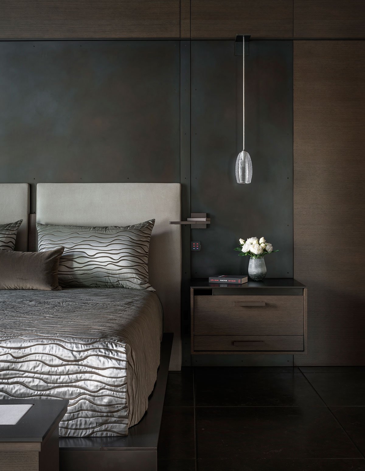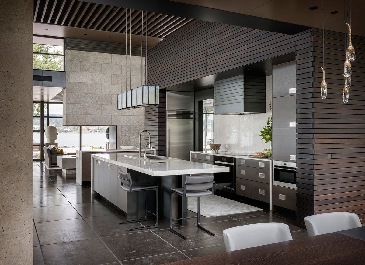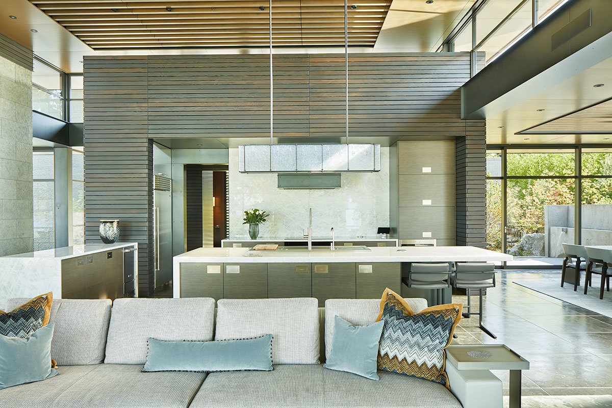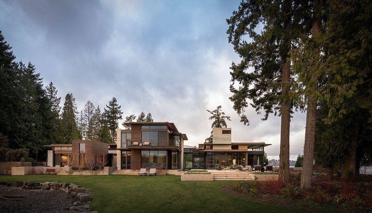 Excerpt: The Point, a residence by Kor Architects, is divided into attached and detached pavilions based on program, structure hierarchy, and privacy levels. The pavilions are arranged around a glass spine/bridge, providing natural light and stunning views of the surrounding landscape. The push-pull design of the building creates captivating landscaped spaces between pavilions, allowing the architecture to recede and nature to take center stage.