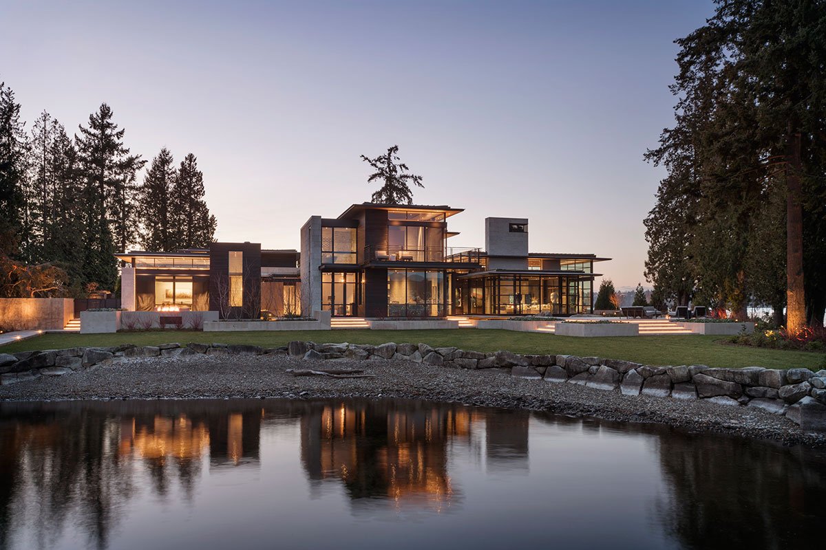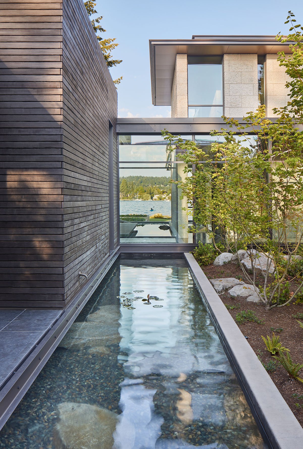 In order to directly connect the main living areas of the house to the adjacent lakeshore, large concrete “lily pads” were designed, which appear to float on the water feature, and provide dry passage over it between the house and the main terrace. In order to balance the environmental impact of a large pre-existing lawn, the remaining gardens utilize a palette of contextually appropriate native plant materials. The end result is a seamless integration of architecture, landscape architecture, and nature.