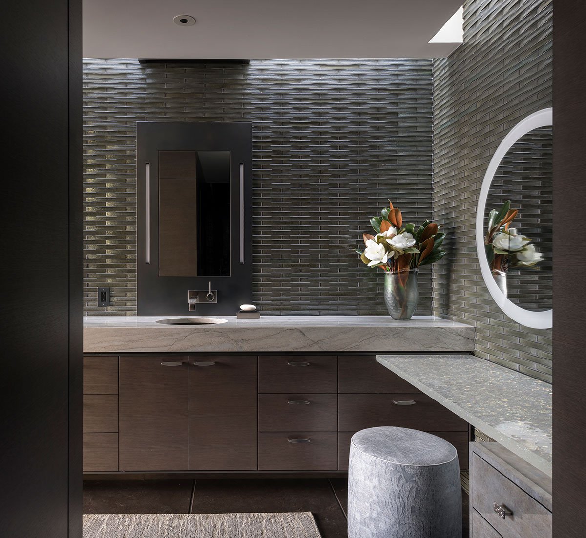 The pavilions are dislocated around a unifying north/south glass spine/bridge that allows for an abundance of natural light, compelling vistas through the building to the surrounding landscape, lake, and beyond. The push-pull of building elements around the organizing circulation spine generates intriguing exterior landscaped spaces that inhabit the zones between each pavilion. A simple, cyclical palette of wood, stone, concrete, steel, and expansive window walls allow the architecture to recede and let nature take center stage.