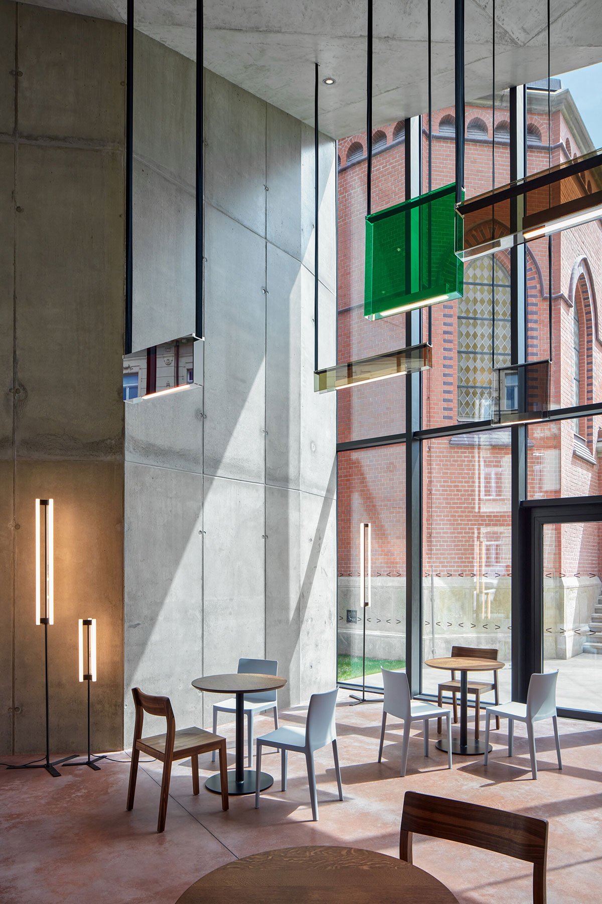 Sitting on a variety of comfortable chairs you will enjoy the meditative atmosphere of the space. Wooden Zeitraum chairs are made of walnut wood, and they are in both the church interior and the café in the annex. Plastic Hay chairs are a refreshing design by the Bouroullec brothers. There are also minimalist armchairs to rest on. The coffee tables were made to measure. The material and the details of the tables were inspired by the traditional elements of the church.