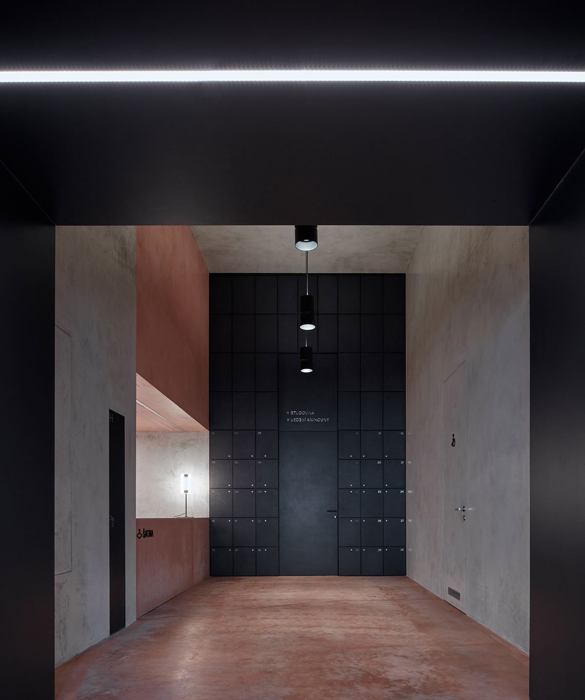 Extra space for operation and facilities was required for the new functionality of the building, but it did not fit in the main body of the church. To avoid significant construction changes to the existing heritage building, the studio decided to add a new mass that would serve operational purposes. The new building is placed right in between the church and the library directorate, linking the two together. There is a common entrance hall with a reception and a café. The new construction respects the Bezrucova Street line and keeps enough indent from the existing buildings.