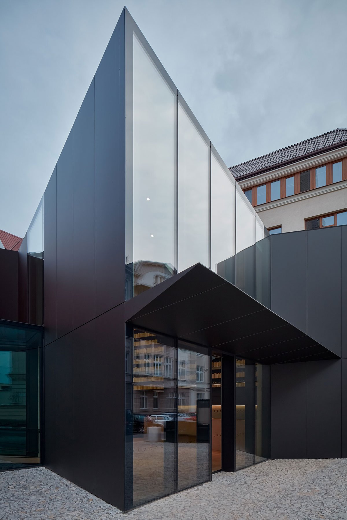 The crystal-like mass of the annex responds to the neo-Gothic form of the church; it derives from its geometric shape, volume, and layout. The floor plan is a cut-out of the part of the church floor plan, only moved outside of the original platform. The walls and the rooftop are made of matte black aluminum.