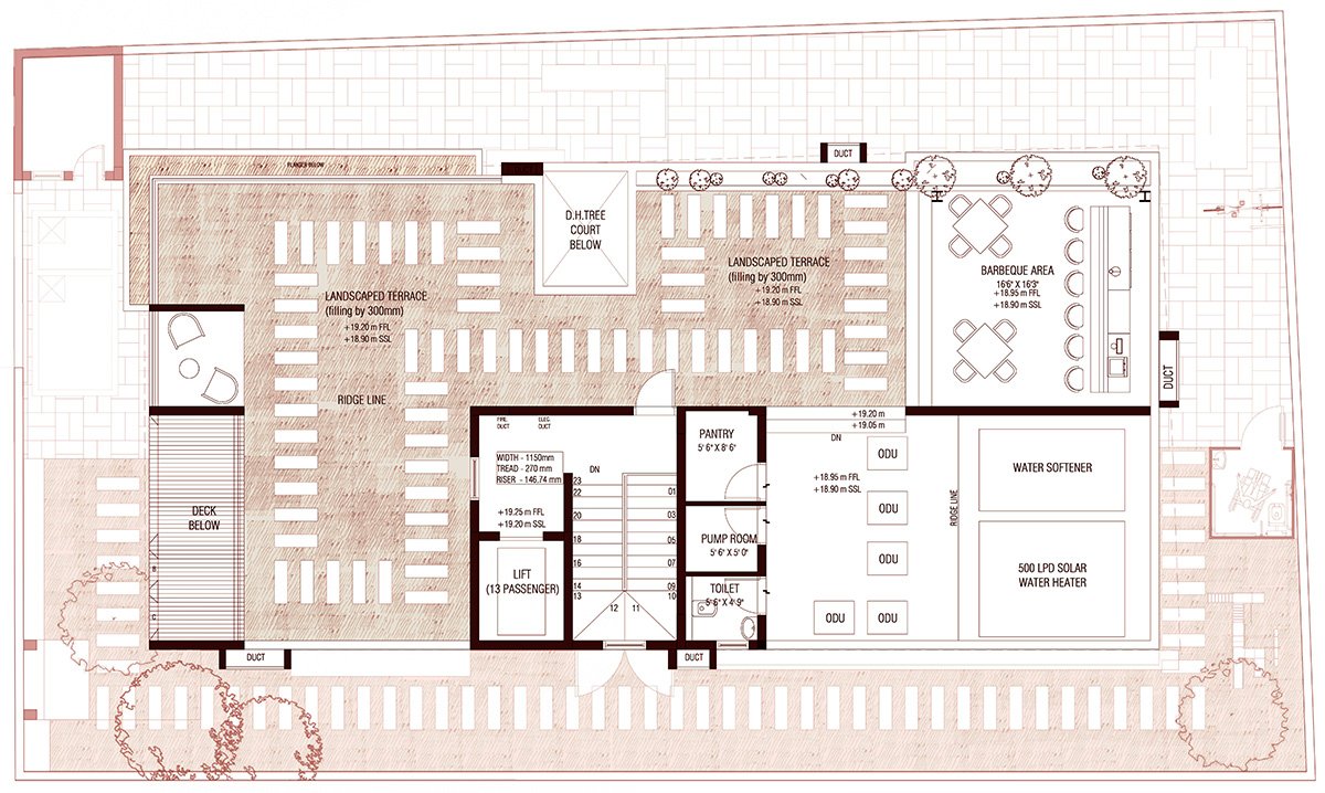 Sustainability: The project is LEED Platinum–certified and integrates sustainable systems across scales. Sixty-five percent of the site is permeable, enabling rainwater harvesting through percolation pits. The terrace is divided into a landscaped surface and solar-panel array, while an underground tank stores enough rainwater to meet water demand for most of the year.