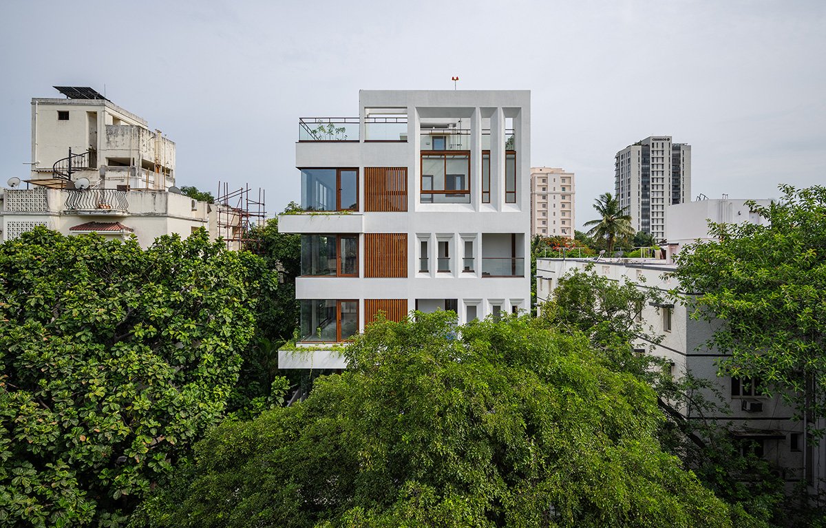 Climate Response: The tree court is not only symbolic but functional. Positioned along the north façade, it softens daylight and drives natural ventilation through louvered vents and a vertical stairwell shaft. Large corner glazing opens to shaded canopies in the northeast, while a southeast balcony is shaped with angled openings that funnel breezes and block harsh sun. These subtle gestures allow the building to breathe naturally in Chennai’s hot and humid climate.