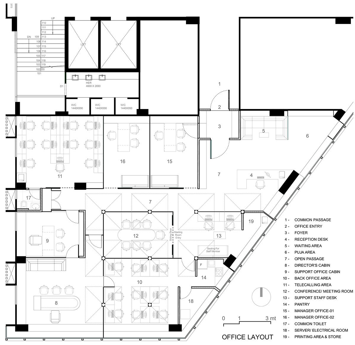 The office program contains a reception-waiting lounge, a director’s cabin, a back office area, other office cabins, a telecalling area, a conference/meeting room, a common staff area, a temple, a pantry, a restroom, and a server room.