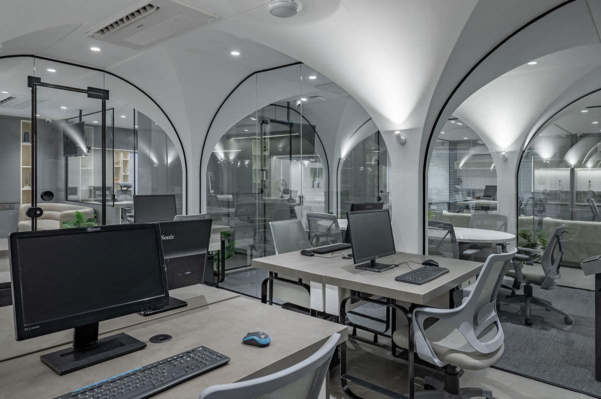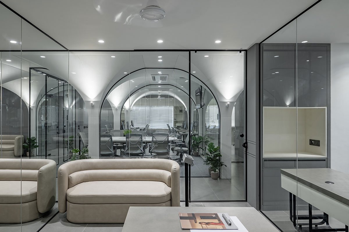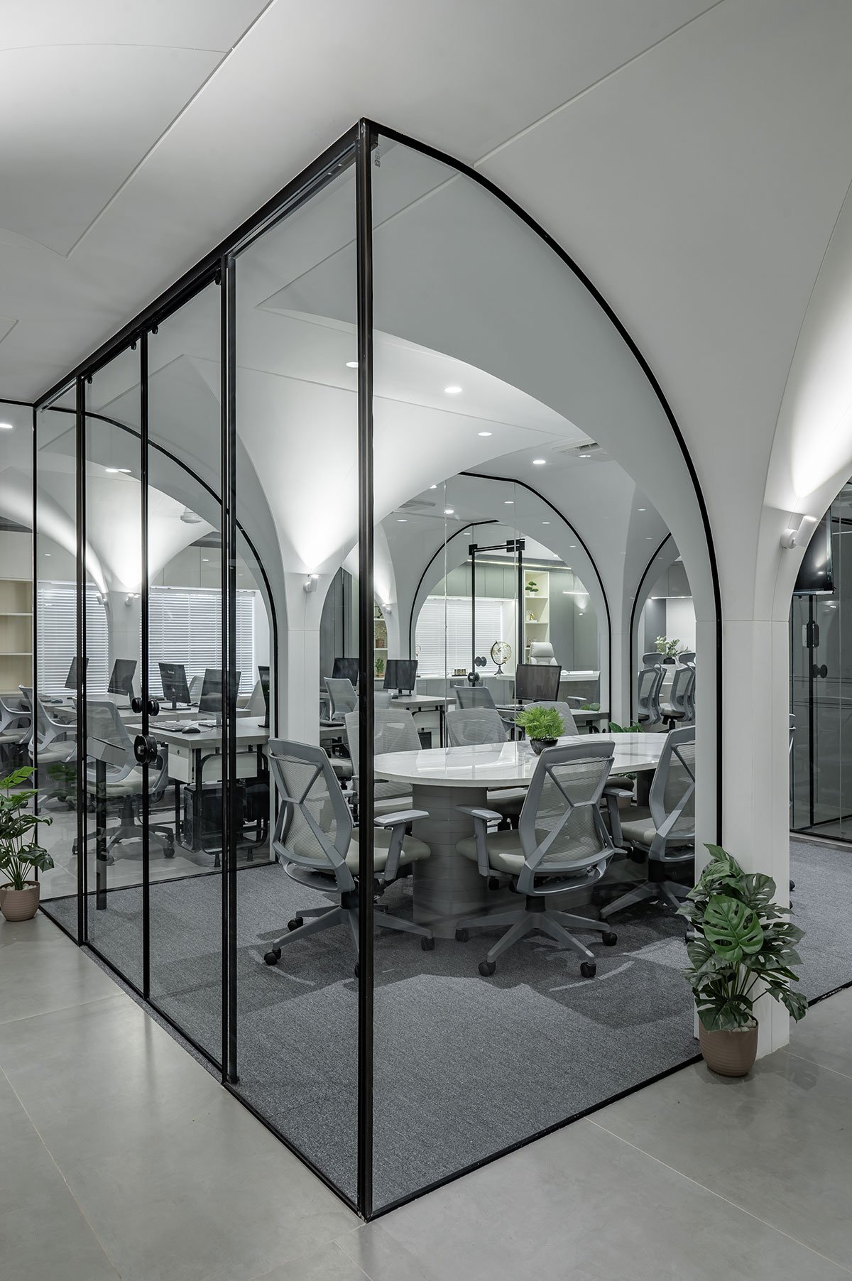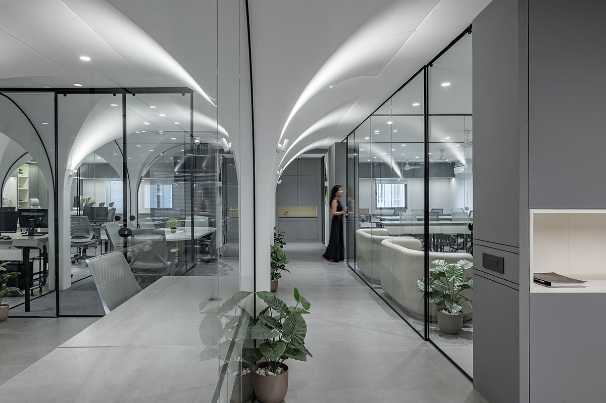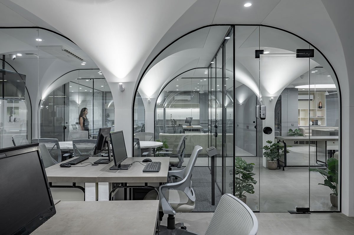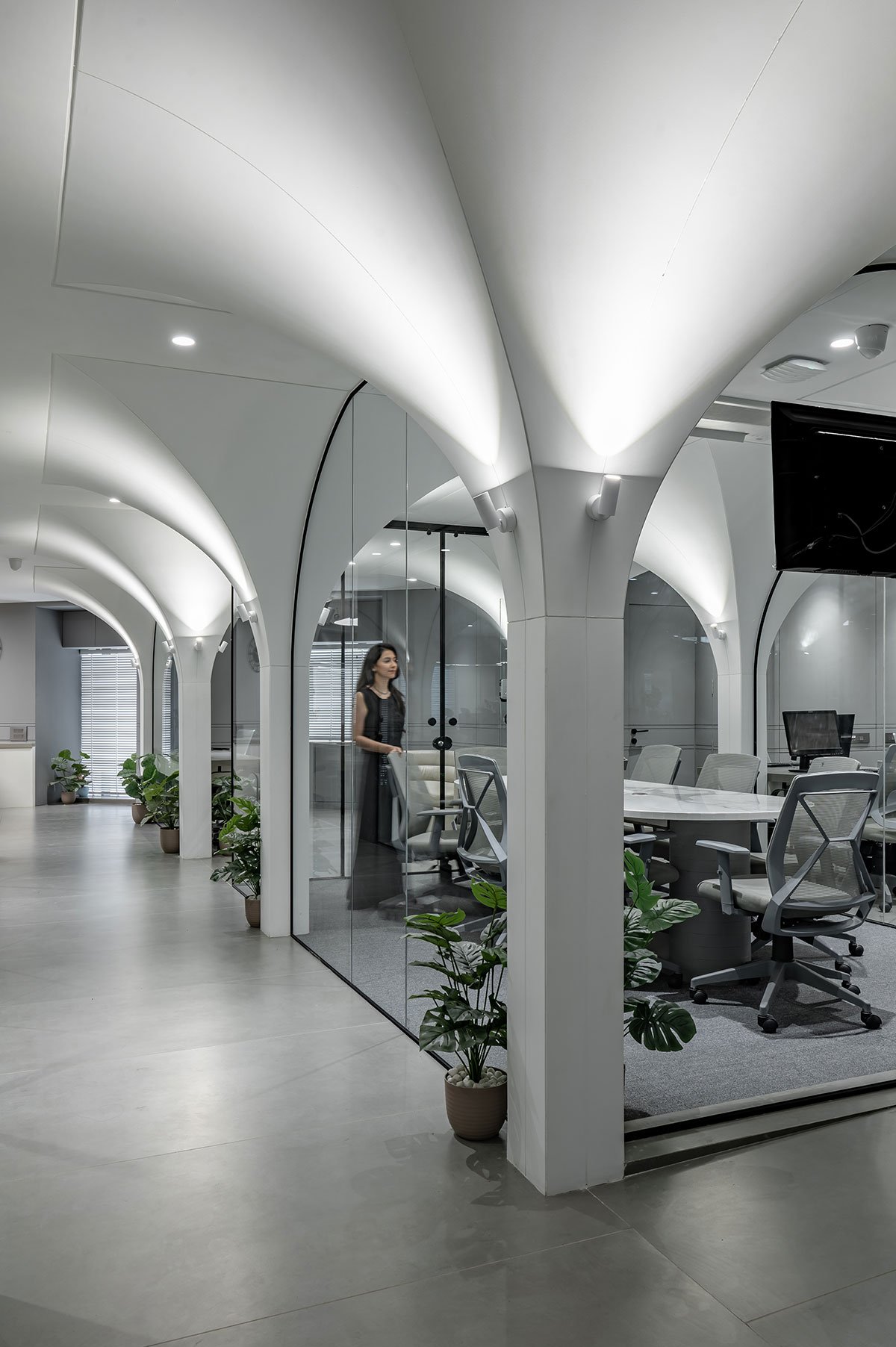 Excerpt: The White Curve Vault by Mayin Architecture Studio is an office space that seamlessly blends historic forms with contemporary minimalism. The repetition of the simple module provides a dynamic workspace that is flexible and adaptable to various spatial relationships. Minimal use of color creates an uplifting and serene work zone with soft shadows primarily influenced by poetic volume.