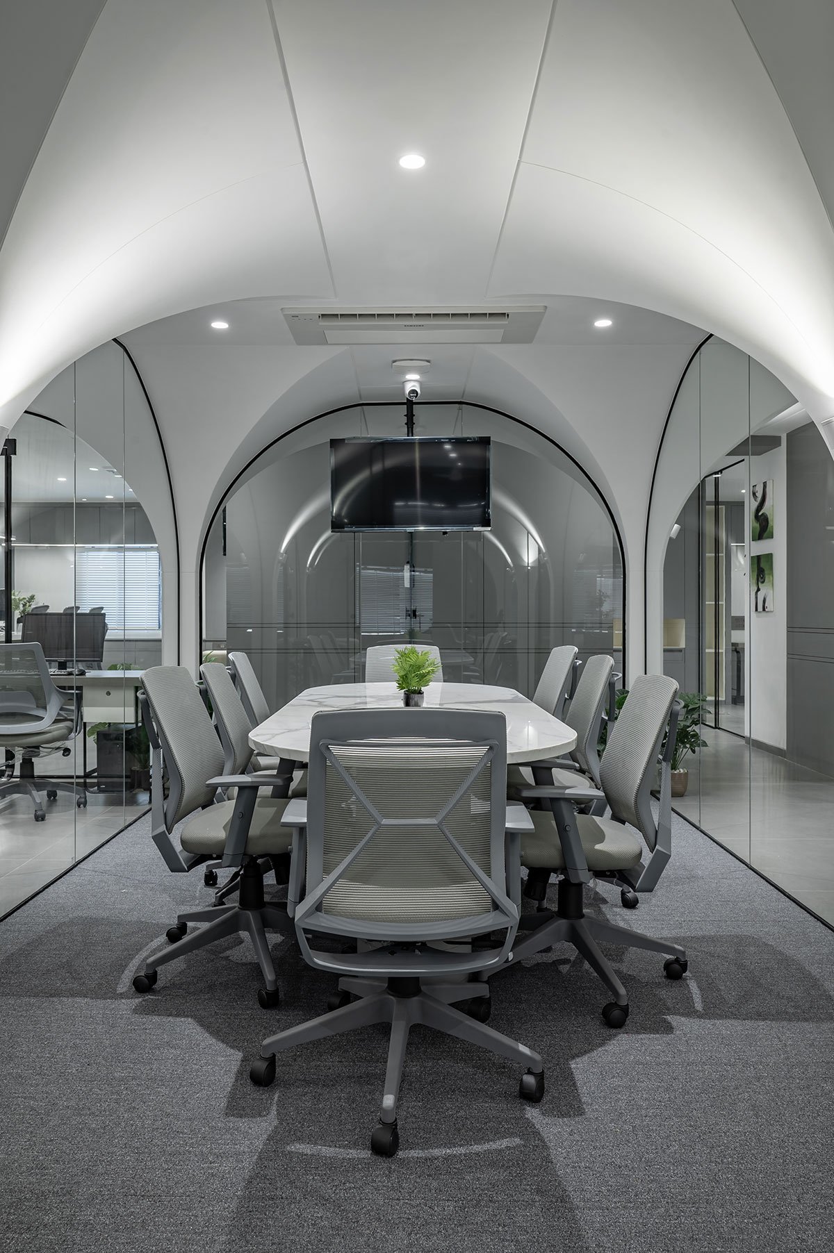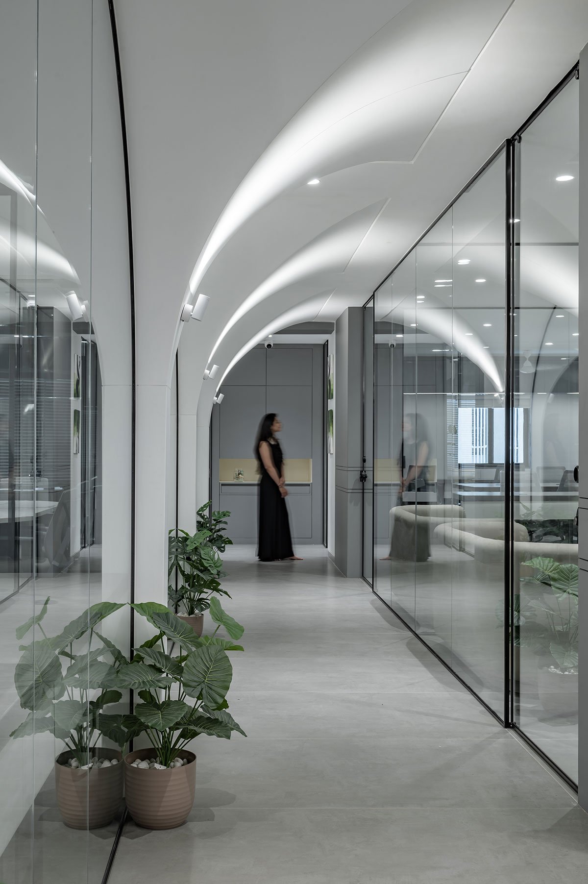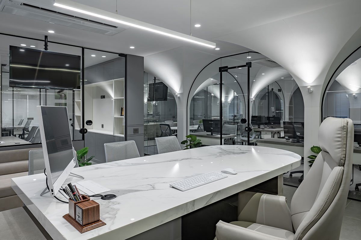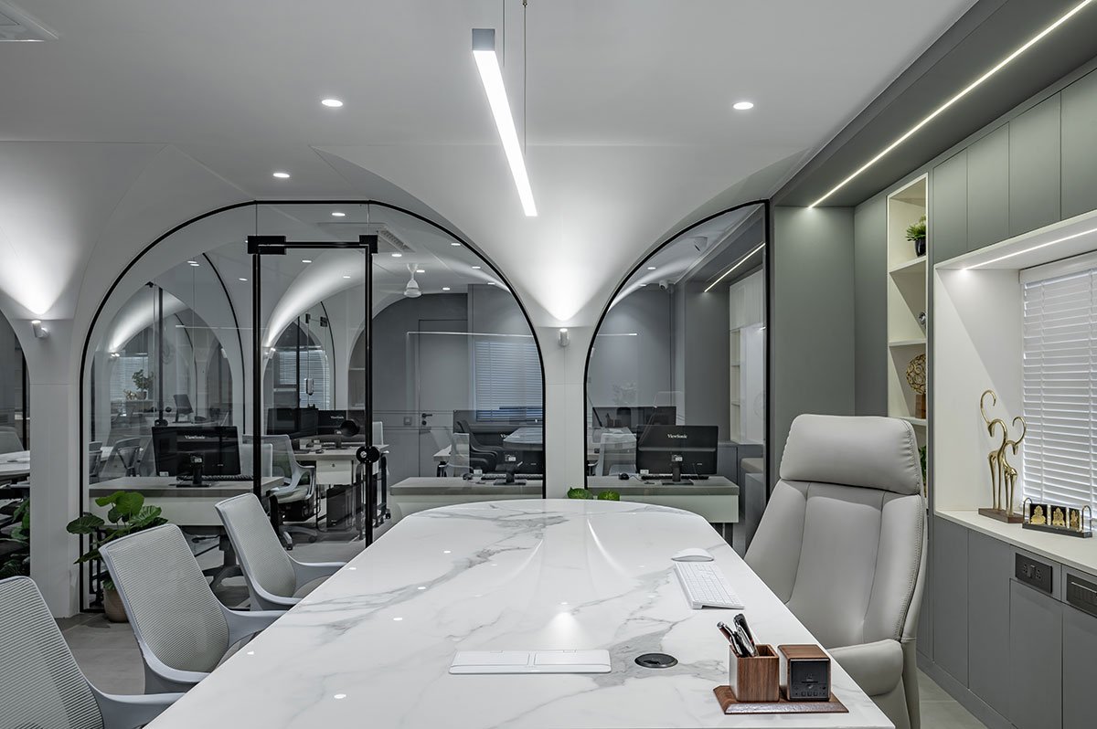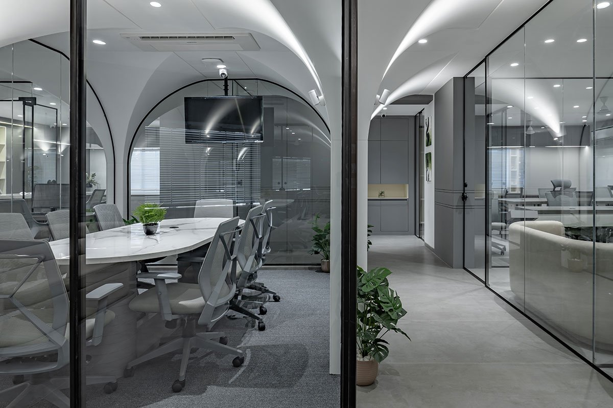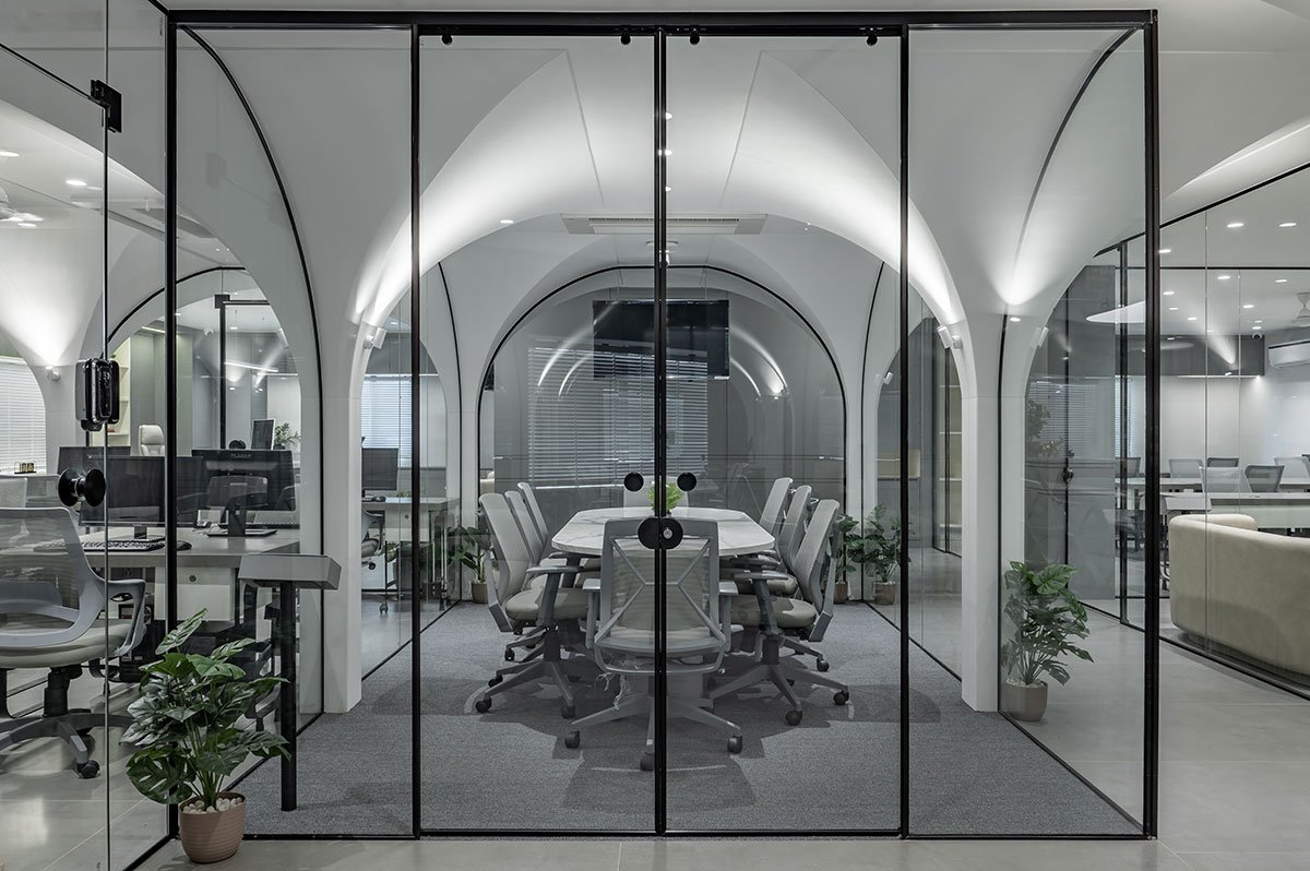 Excerpt: The White Curve Vault by Mayin Architecture Studio is an office space that seamlessly blends historic forms with contemporary minimalism. The repetition of the simple module provides a dynamic workspace that is flexible and adaptable to various spatial relationships. Minimal use of color creates an uplifting and serene work zone with soft shadows primarily influenced by poetic volume.