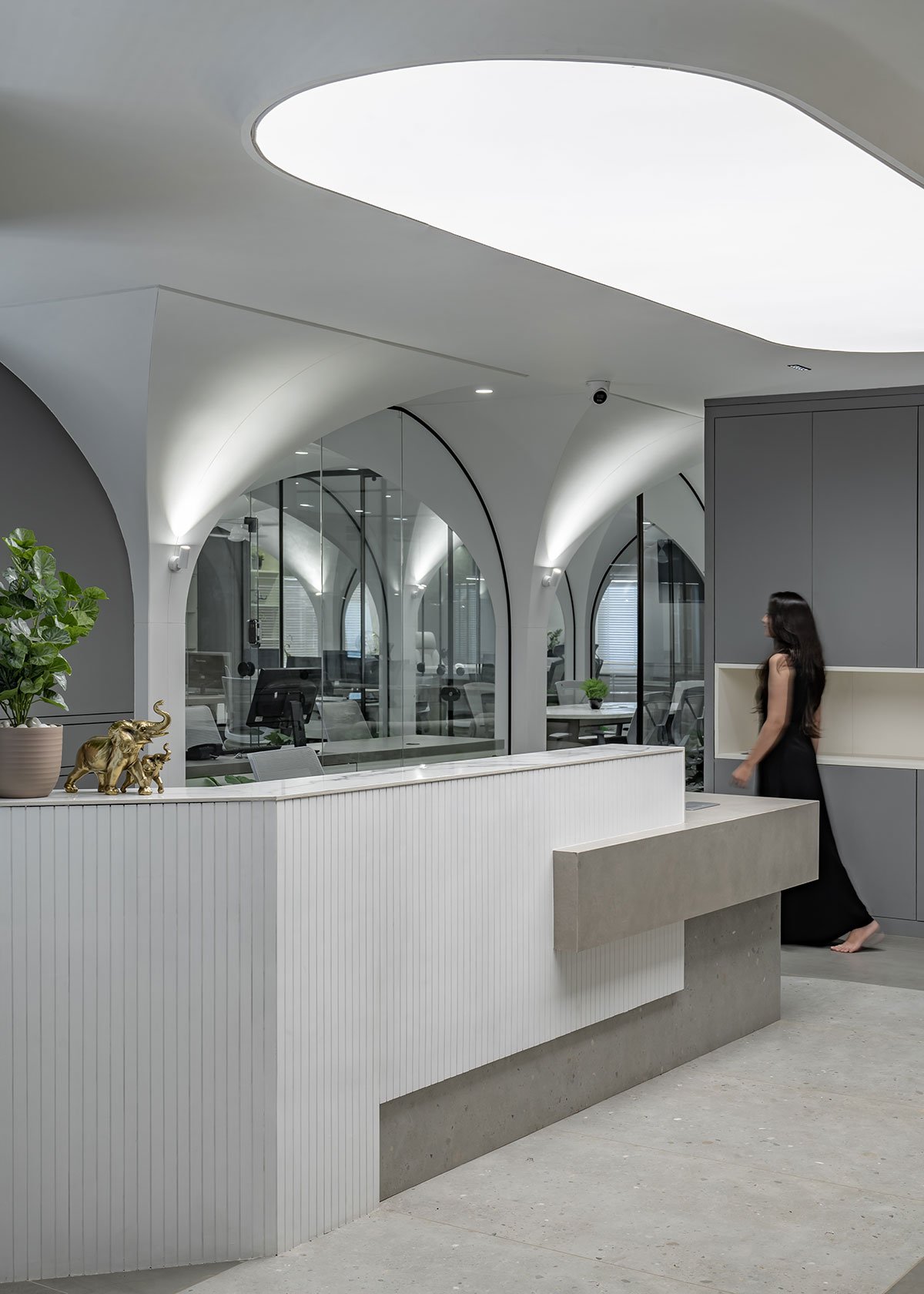 [Text as submitted by architect] ‘The White Curve Vault’ is an office space of 2700 sq. ft. executed in Surat, Gujarat, India. The design is a creative combination of historic forms and contemporary minimalism. The series of arches defining the space is inspired by the grand Jami Masjid in Mandu, Madhya Pradesh.