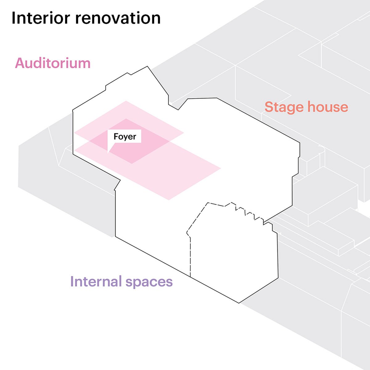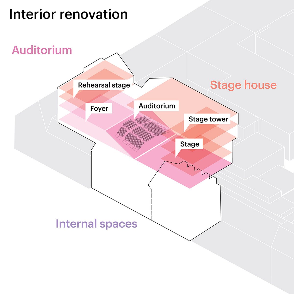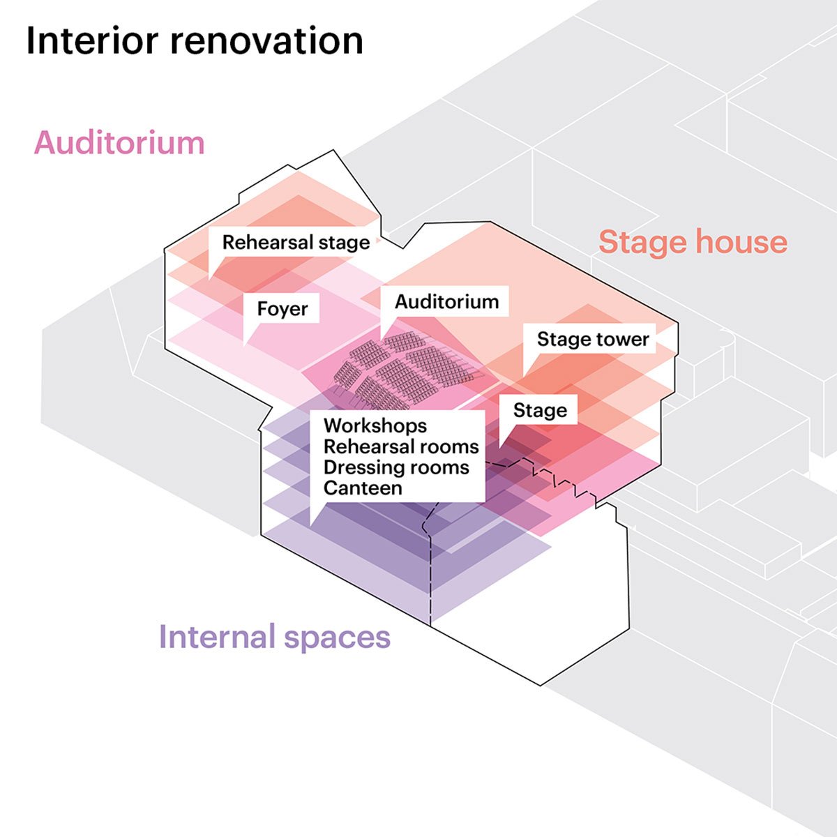MVRDV’s design responds to this situation by making the most significant changes where they are most needed. In the front of the house, the design combines a renovation of the historic architecture – in keeping with the preservation requirements – with the modernisation of the technical equipment. The building on Clemensstraẞe will be completely renovated inside and the façade will be entirely renewed in order to highlight the building’s function as part of the theatre, as well as to make the pride and enthusiasm of the people who work for the theatre visible to the people outside.