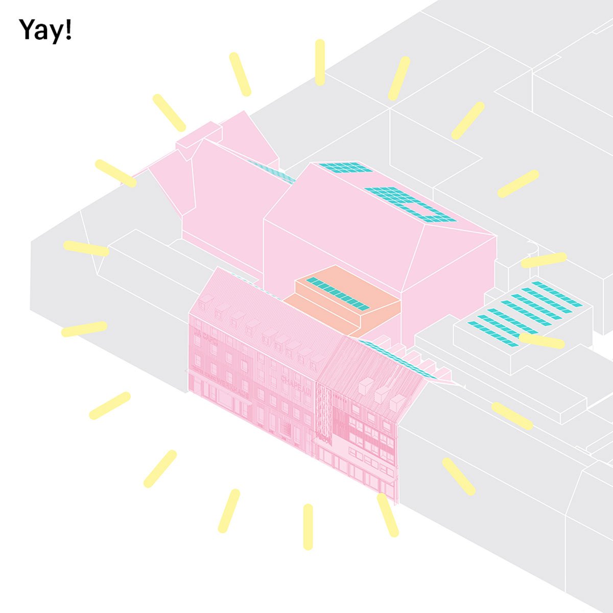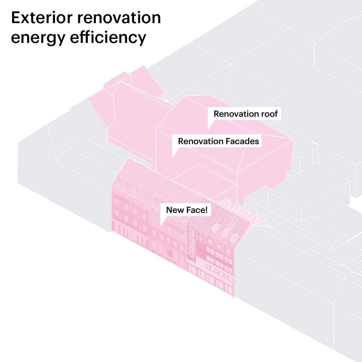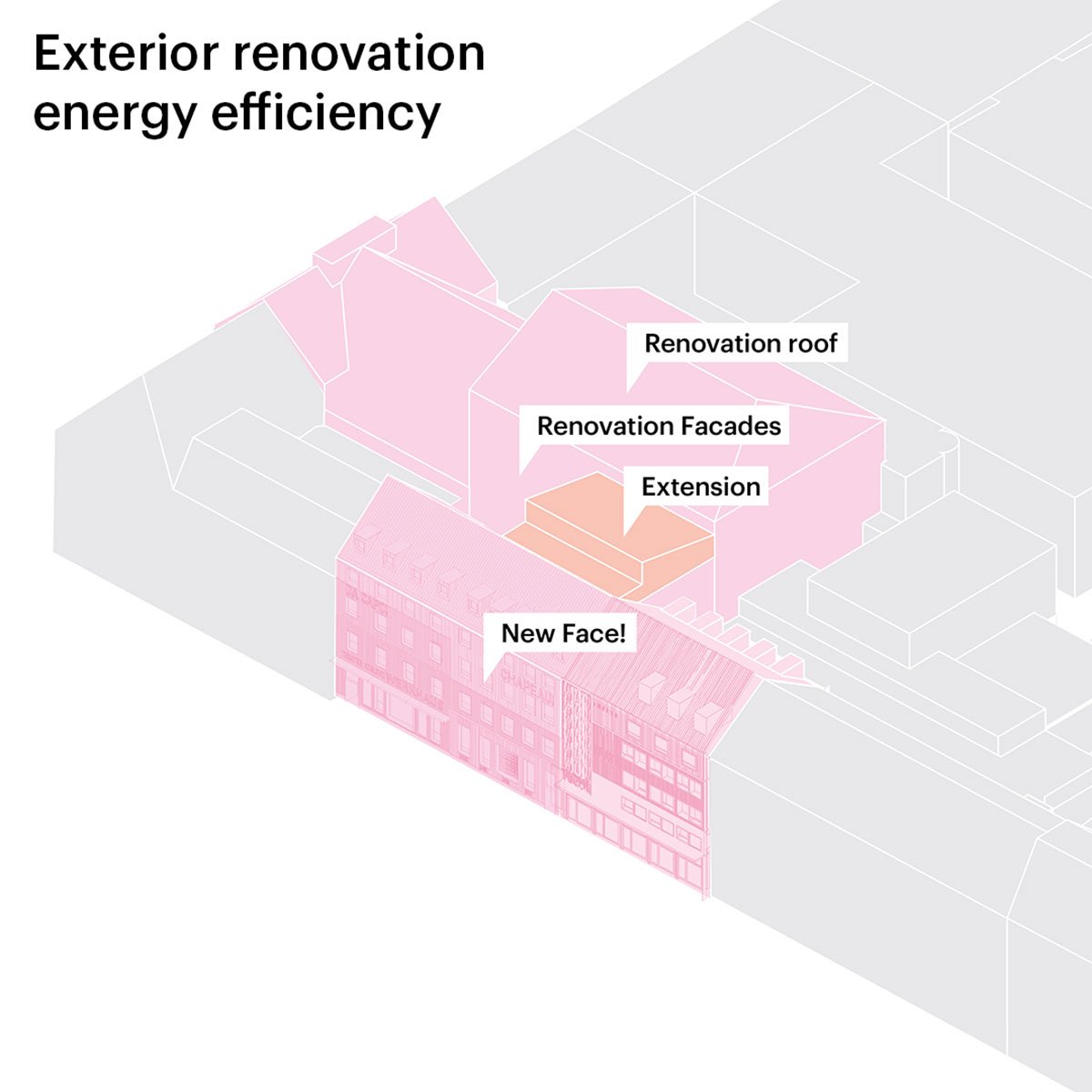 MVRDV’s design responds to this situation by making the most significant changes where they are most needed. In the front of the house, the design combines a renovation of the historic architecture – in keeping with the preservation requirements – with the modernisation of the technical equipment. The building on Clemensstraẞe will be completely renovated inside and the façade will be entirely renewed in order to highlight the building’s function as part of the theatre, as well as to make the pride and enthusiasm of the people who work for the theatre visible to the people outside.