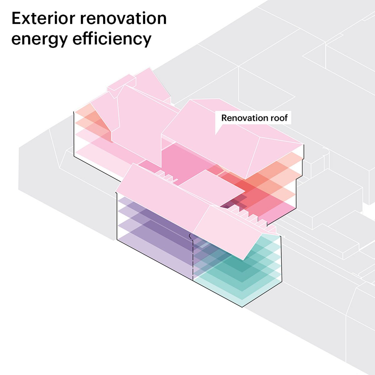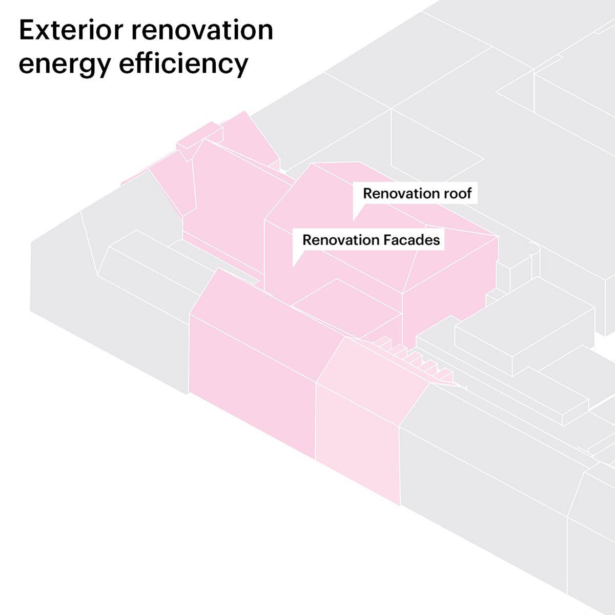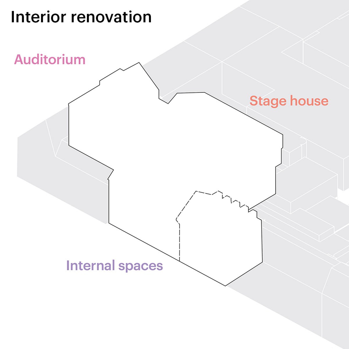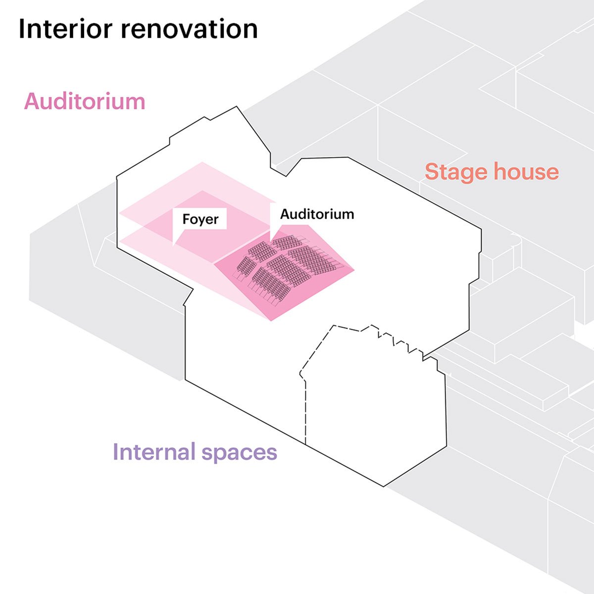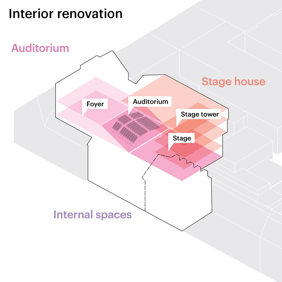 The design also renovates all of the theatre’s roofs, making use of recycled materials to reduce the carbon emissions of the project. In an additional sustainable measure, the design team was able to integrate photovoltaic panels across the complex, a challenging task considering the building’s heritage status. Through careful study, these solar panels are added in a way that cannot be seen from street level, preserving the historical appearance of the building.