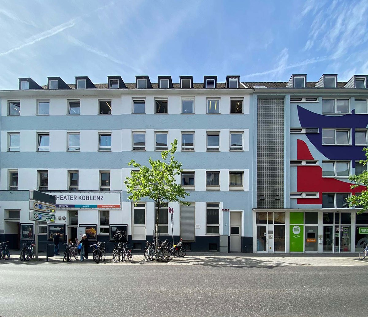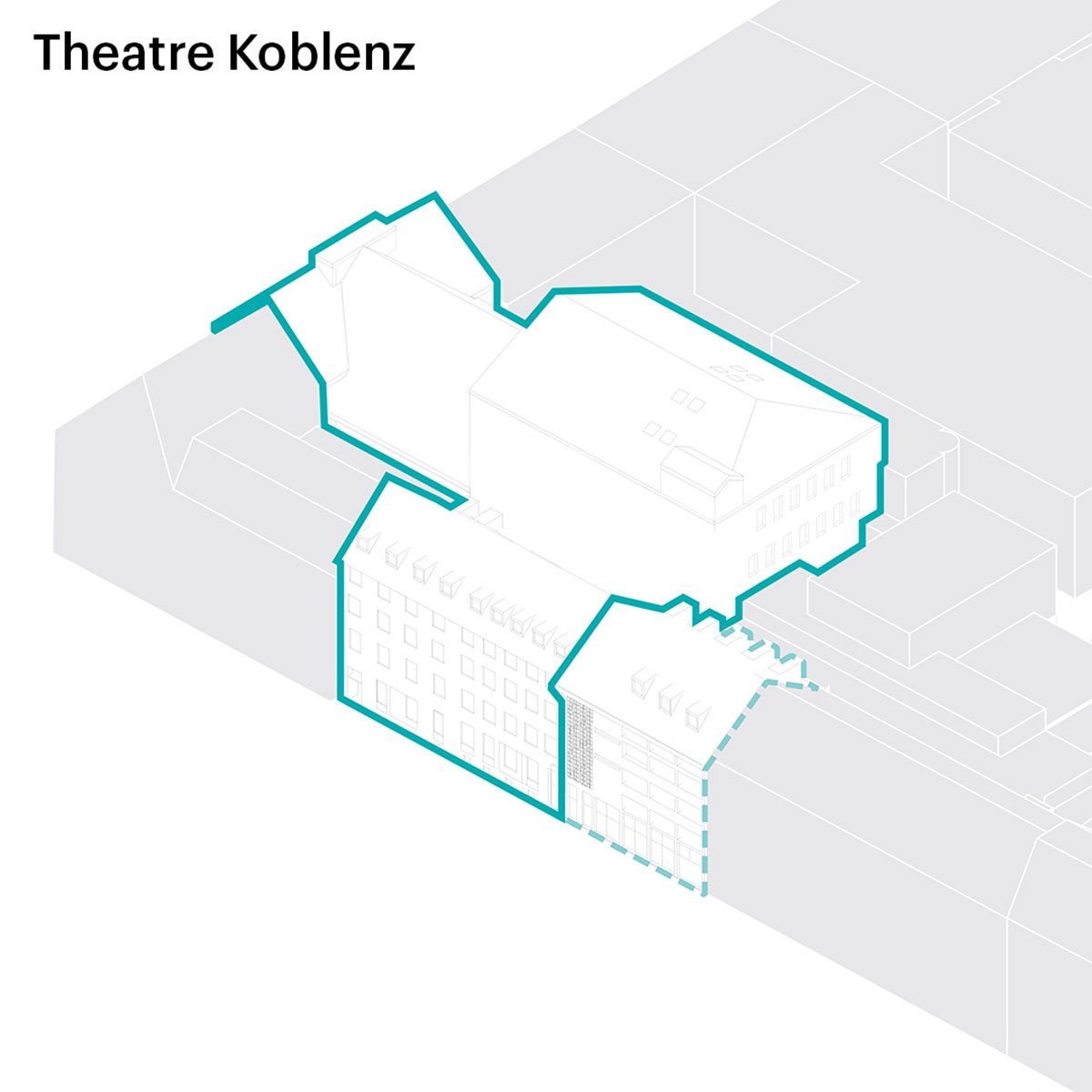 Built-in 1787 and last renovated in the 1980s, the theatre presents a grand classical façade towards Koblenz’s Deinhardplatz. Behind the scenes, however, is a different story: over the years, the complex was extended a number of times, and today many of the theatre’s functional areas – offices, dressing rooms, rehearsal rooms, workshops, lounges – are housed in several outbuildings connected to the historic theatre. A substantial part of these operational spaces are located on Clemensstraße. This building does not make the theatre visible to the outside world as an important modern cultural institution and does not provide adequate working conditions for the theatre’s staff.