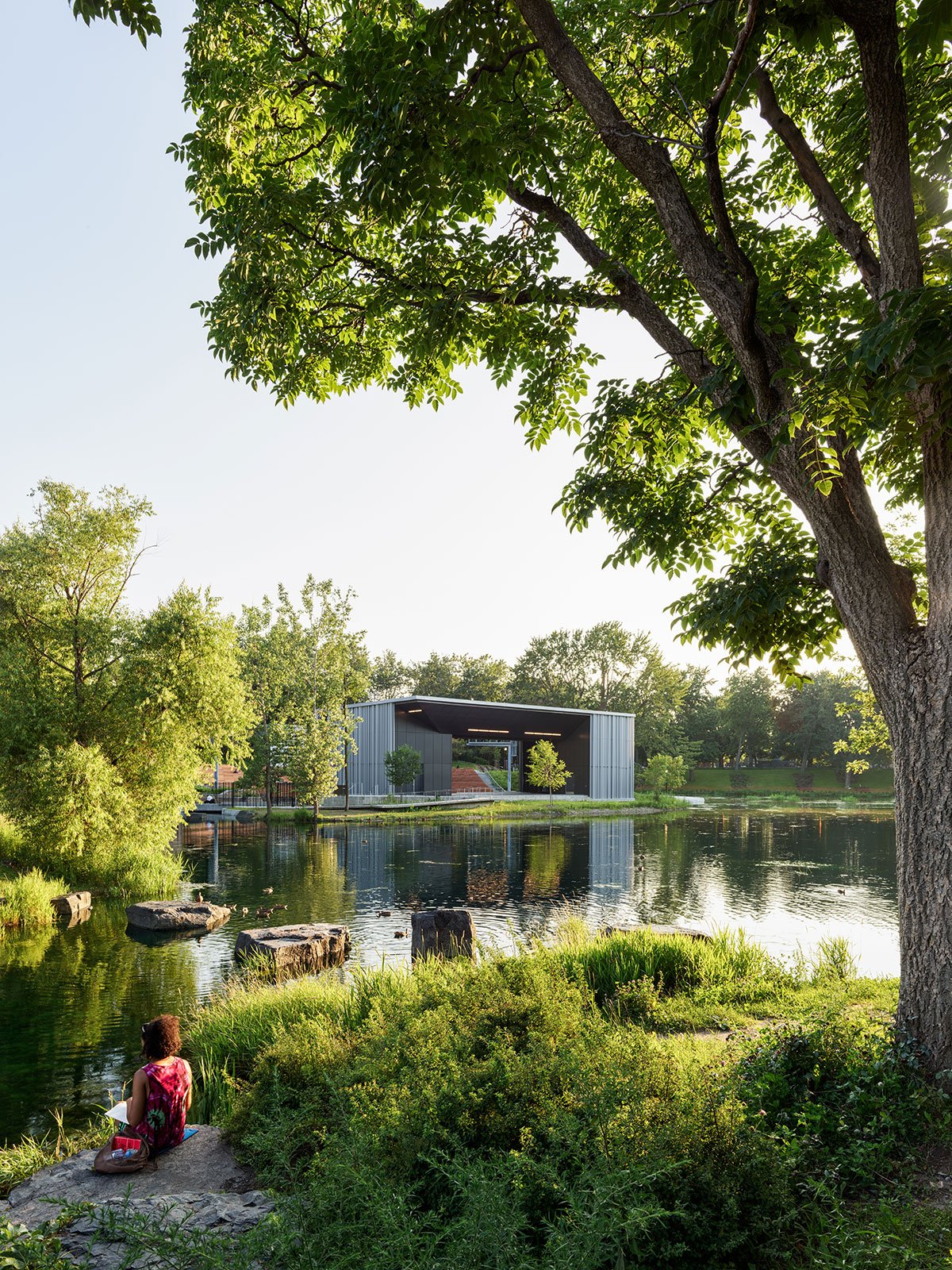 In order to make the site accessible at all times, even outside of performances, Lemay created new entrances and extended the pedestrian path around the basin. By planting a low vegetative cover and preserving the canopy, new perspectives that open up both on the theatre and on the surrounding park have been created, making the theatre pop within the site rather than shielding it from view.