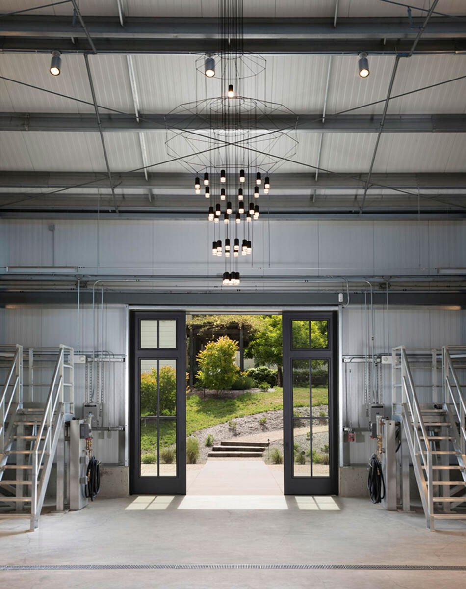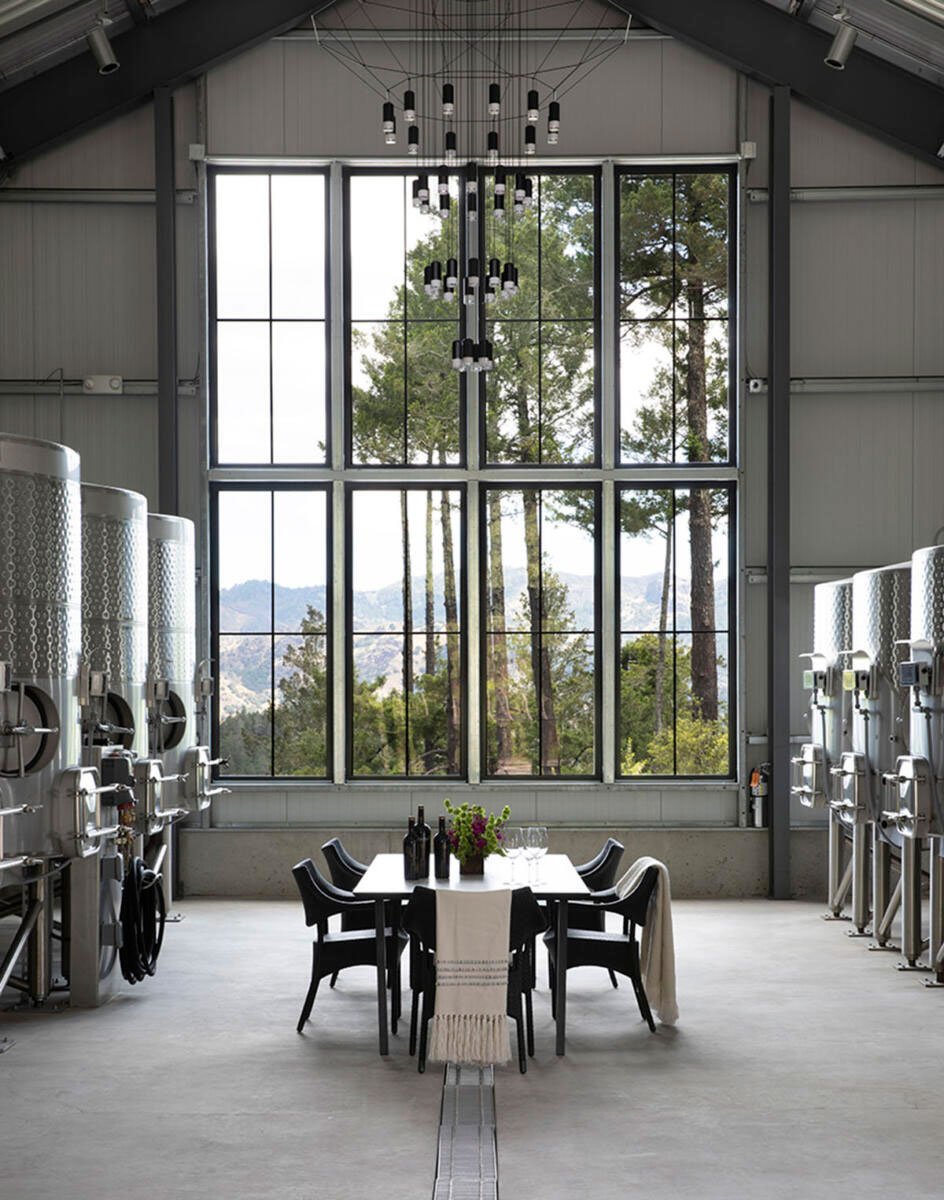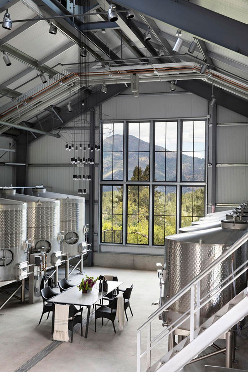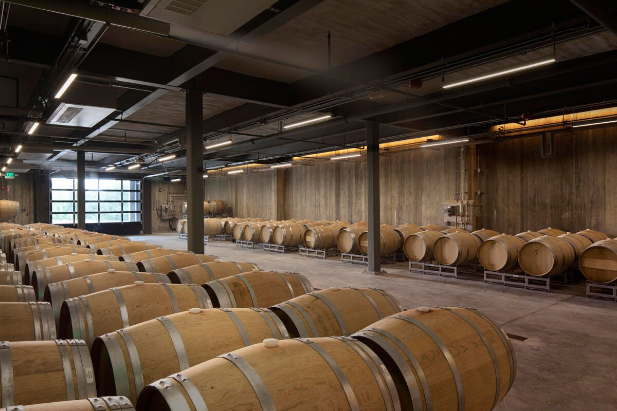 The two-story building, featuring dark roofing and siding, is a steel structure with a cross-axis floor plan. Axial vistas allow for views from and through the winery facility. Large, solid oak sliding barn doors provide full closure when desired. Steel-framed glass doors and windows fill the interior spaces with natural light, reducing the need for supplemental lighting in the fermentation room and visually connecting interior spaces to the natural surroundings. The roof of the primary fermentation room features a continuous monitor to provide ample daylight into the structure. Below-ground barrel storage provides improved, at-grade access for wine production and a cool, consistent temperature in which to mature wine. Additional areas include the crush pad, various storage rooms, a full restroom, and a laboratory/office. Production capacity is 8,412 cases. Tasting and tours are by appointment only and limited to just a few people at a time. With wine and landscape taking center stage, Theorem Winery provides an intimate and nuanced experience that is simultaneously familiar and timeless.