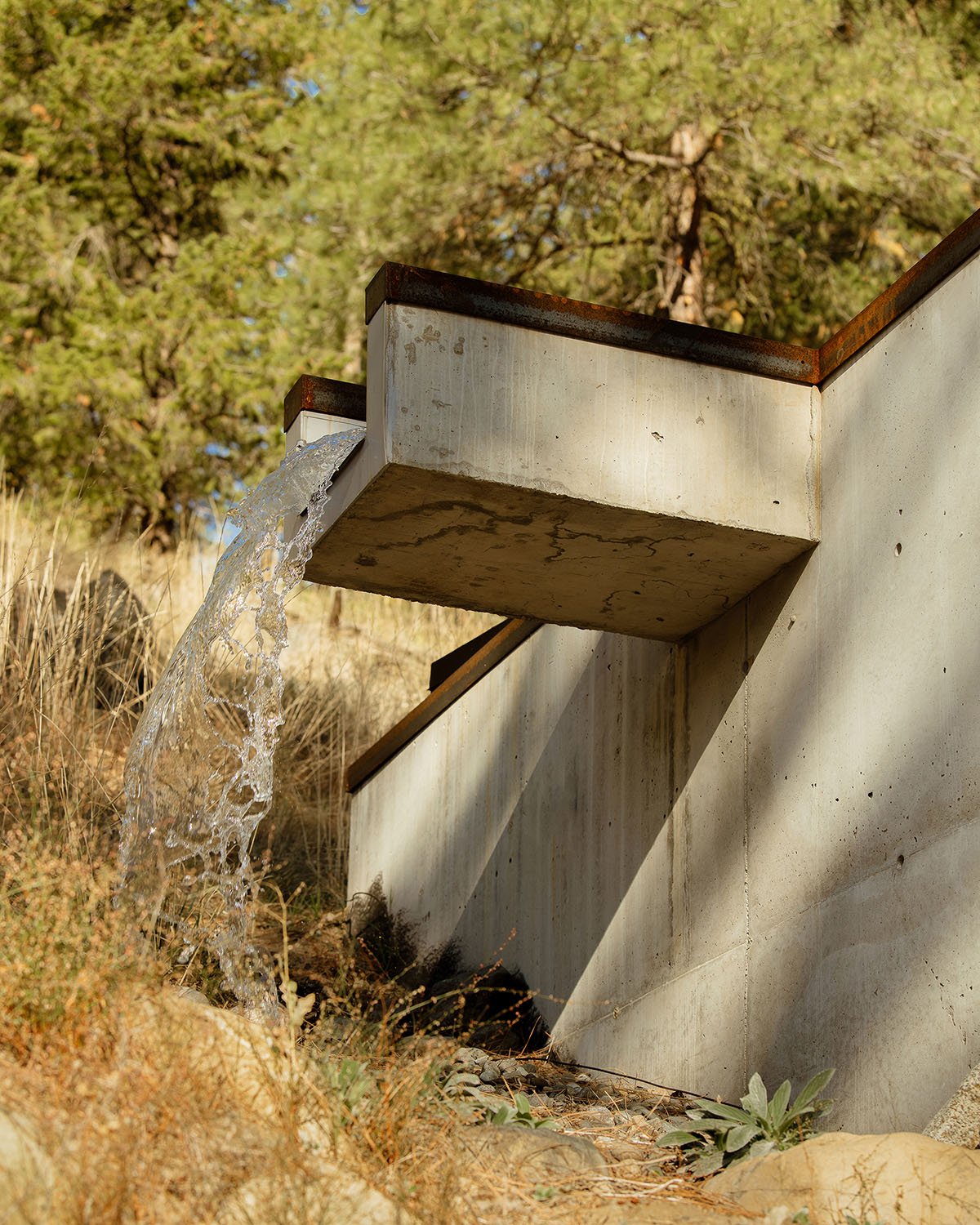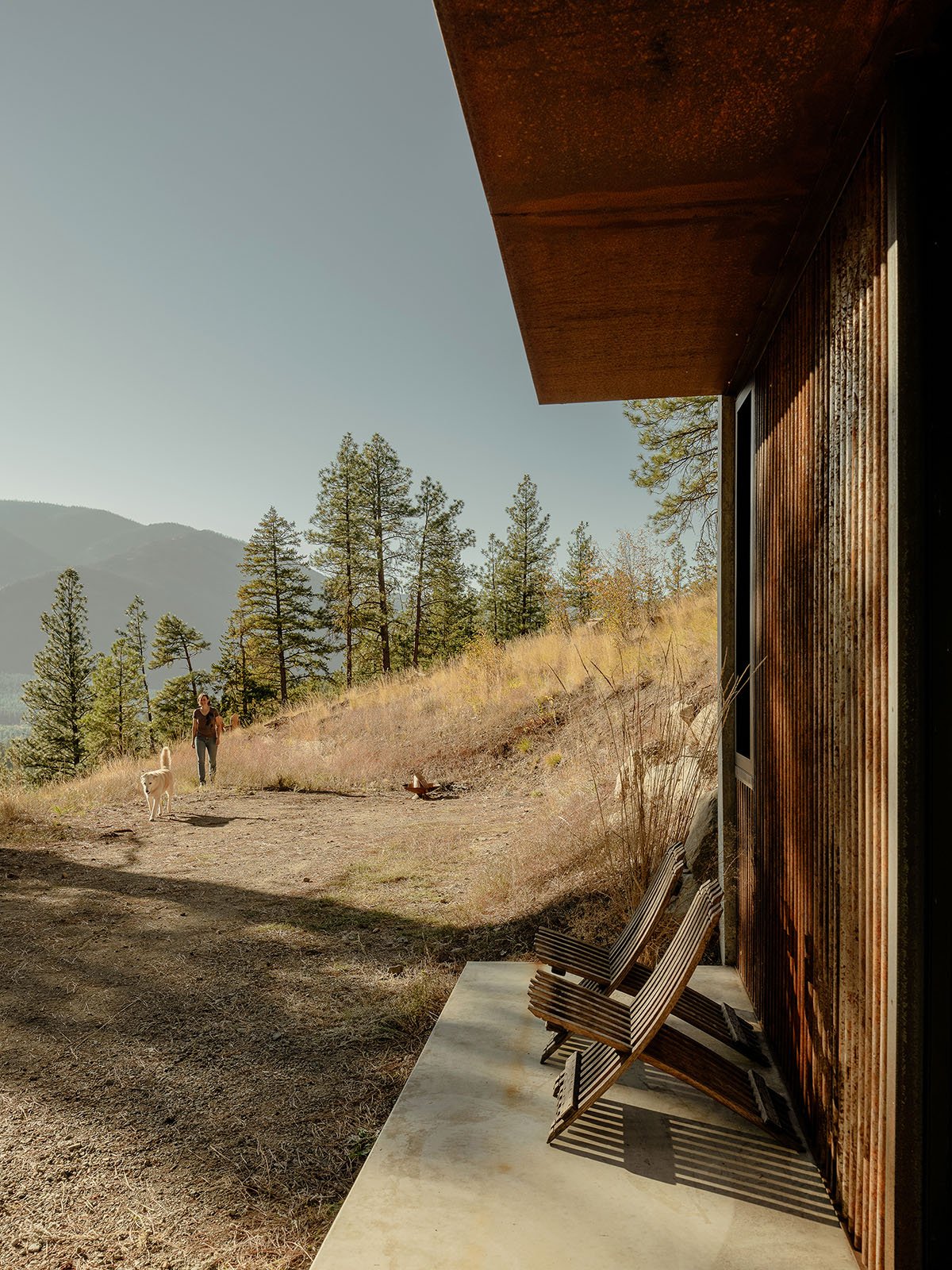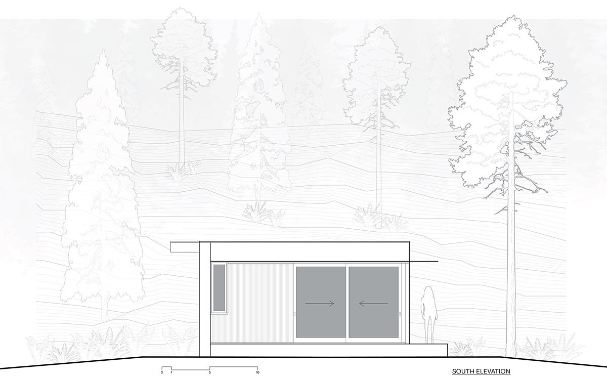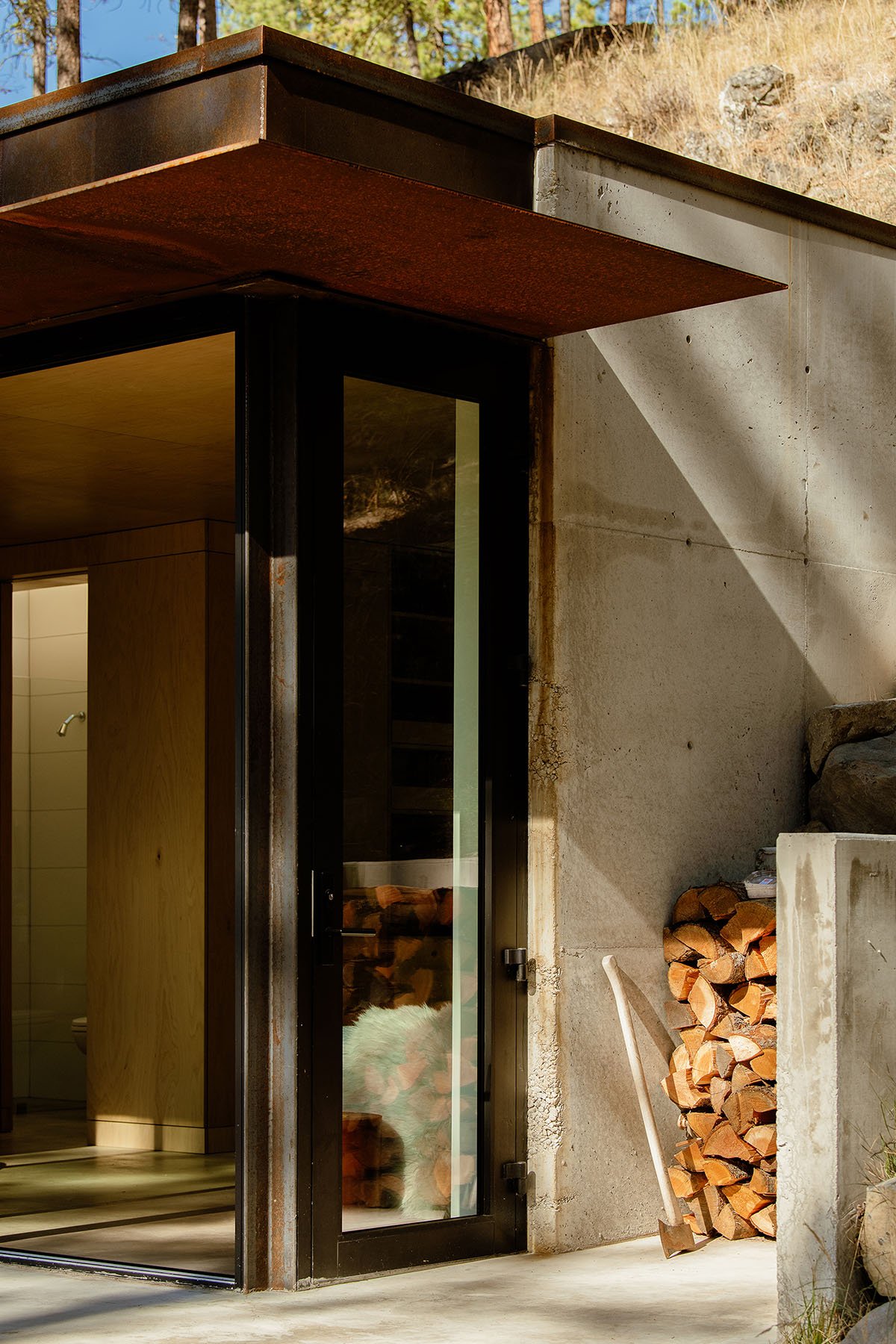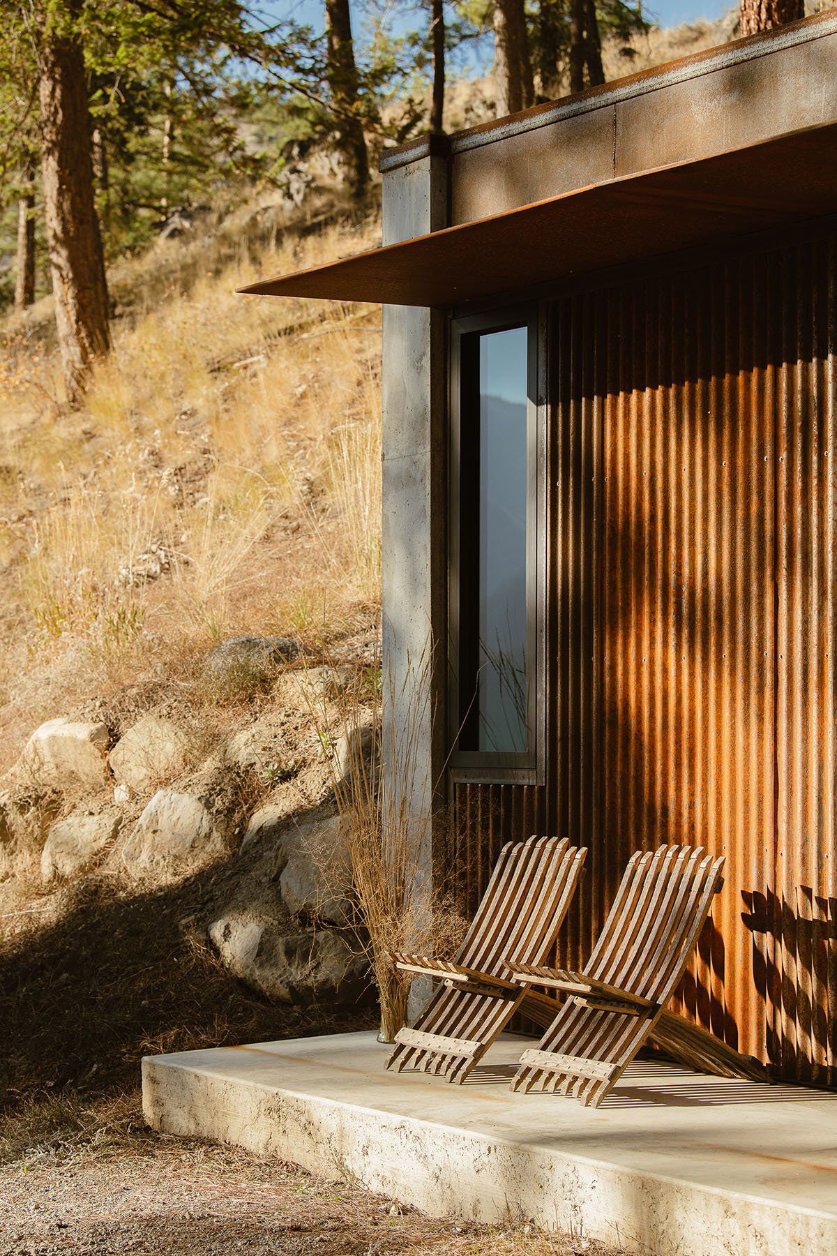 The exterior palette of the cabin was carefully chosen to change and grow with the landscape. Steel cladding and awning panels age and patina to earth tones. The concrete walls pick up tones of the rocks that emerge from the hillside of the site. The desire was for the cabin to age gracefully and appear like it has always been a part of the site. Whether in the dry summer months or deep in the snows of winter, Tinyleaf is able to merge itself into its surroundings.