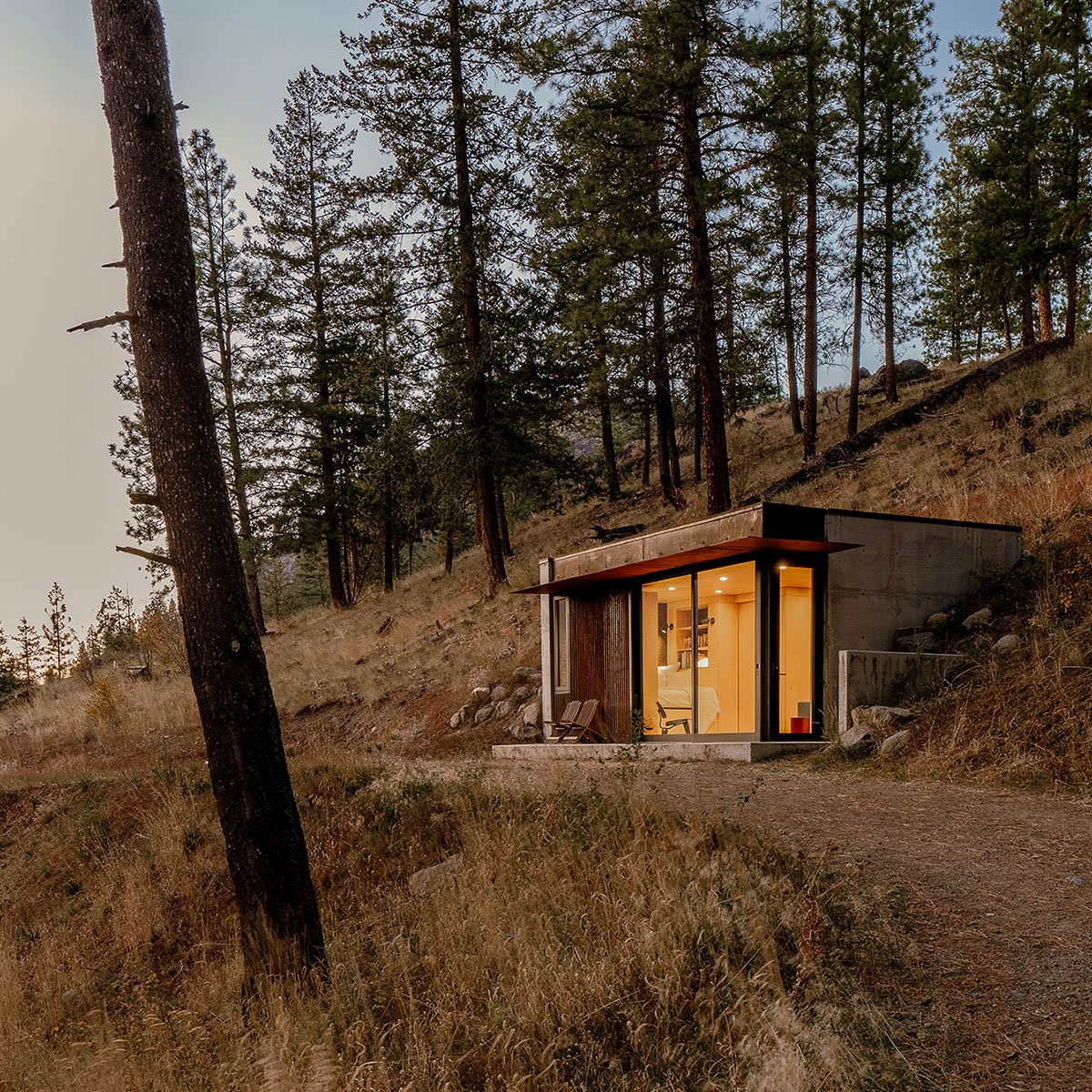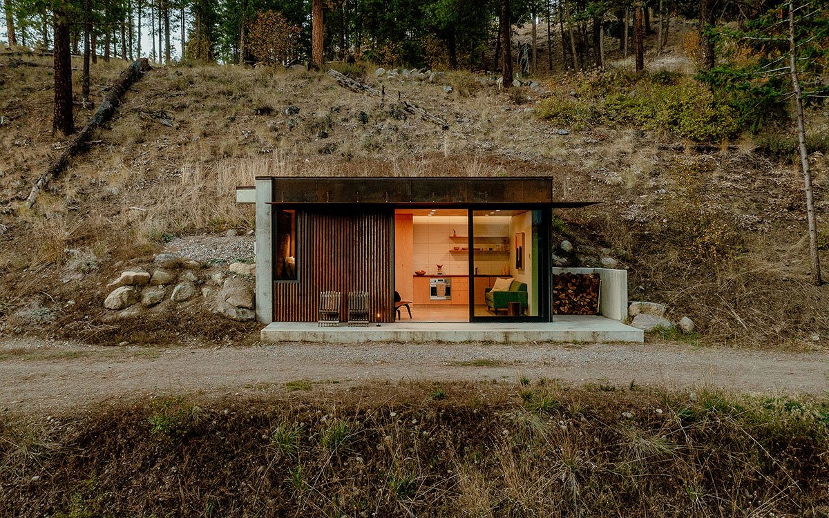 Excerpt: Tinyleaf by GO’C is conceived as a small outpost bermed into a steep slope site in Mazama, Washington, with a strong relationship to the topography and the drastically different seasons of the Methow Valley. Designed for an outdoor enthusiast, the project maximizes connection to the outdoors while using simple materials and efficient planning to merge the cabin into its landscape year round.