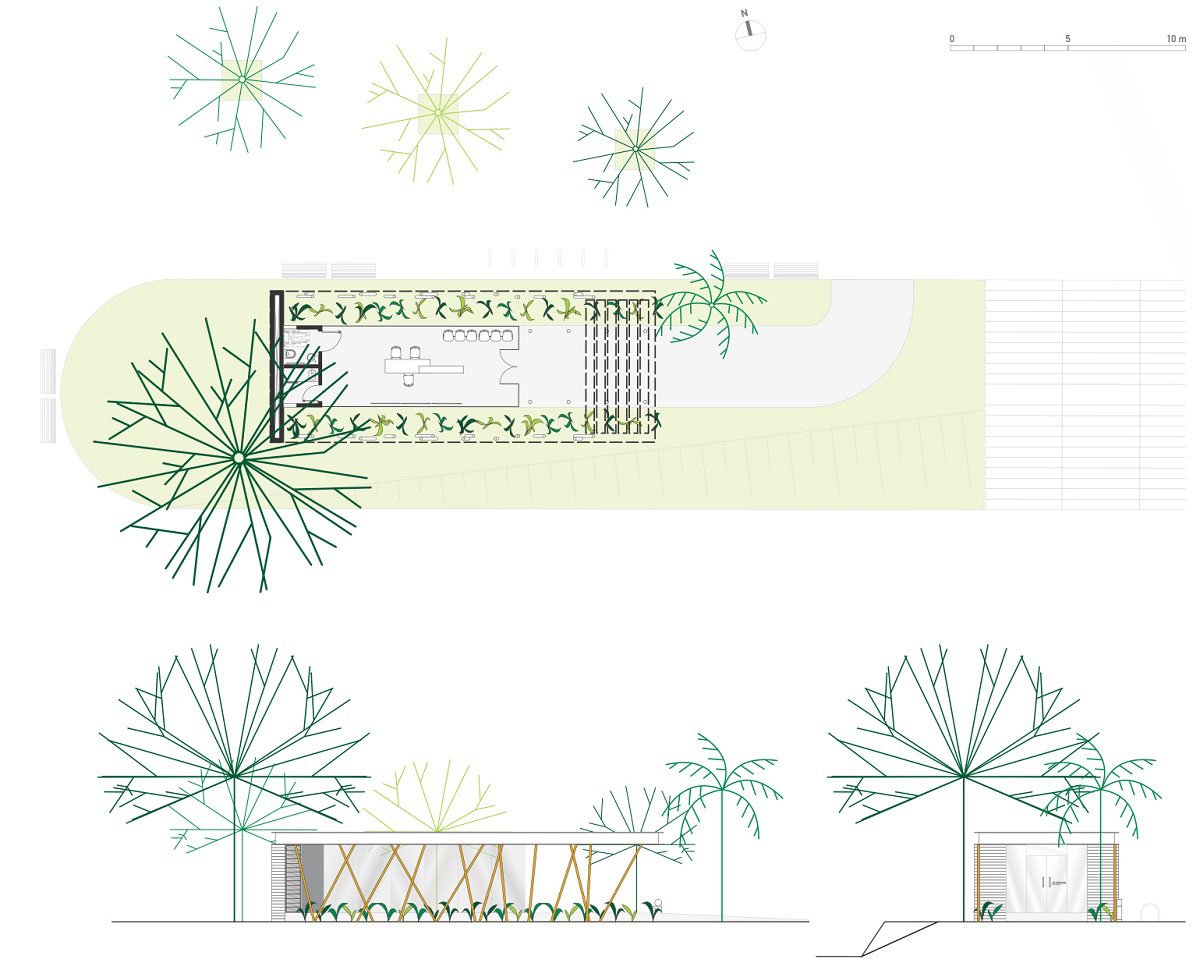For an adequate protection to the Amazonian sun, the simple roof plan presents eaves in all directions, having its largest dimension in the direction of the rising sun. To protect itself from the setting sun, the Information Center closes on the West side with a double concrete wall guaranteeing a powerful thermal inertia. Cross ventilation is guaranteed by the main opening of the service space oriented towards the prevailing winds and by the windows with glass fins on the opposite side, close to the concrete wall.