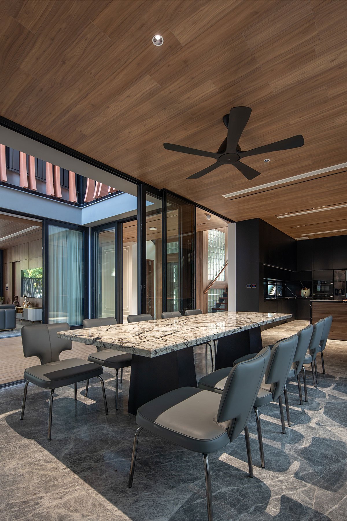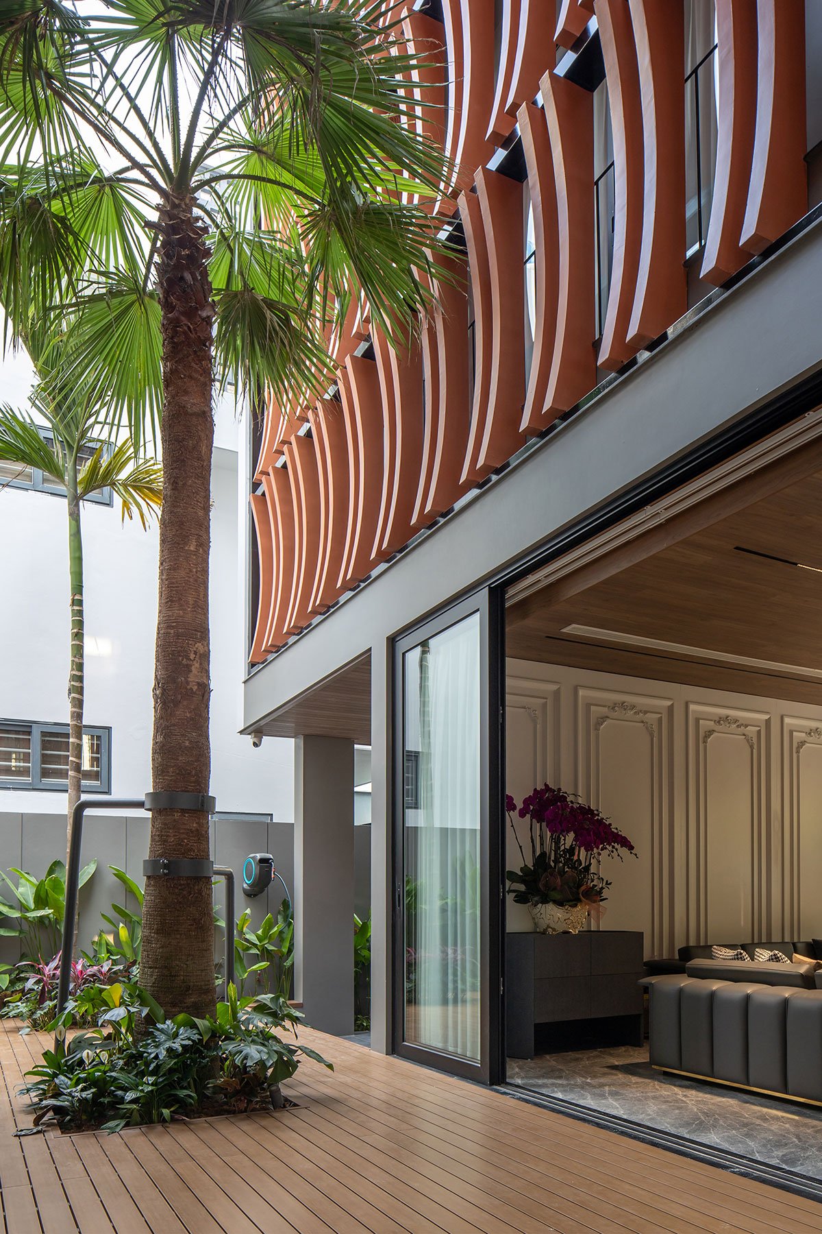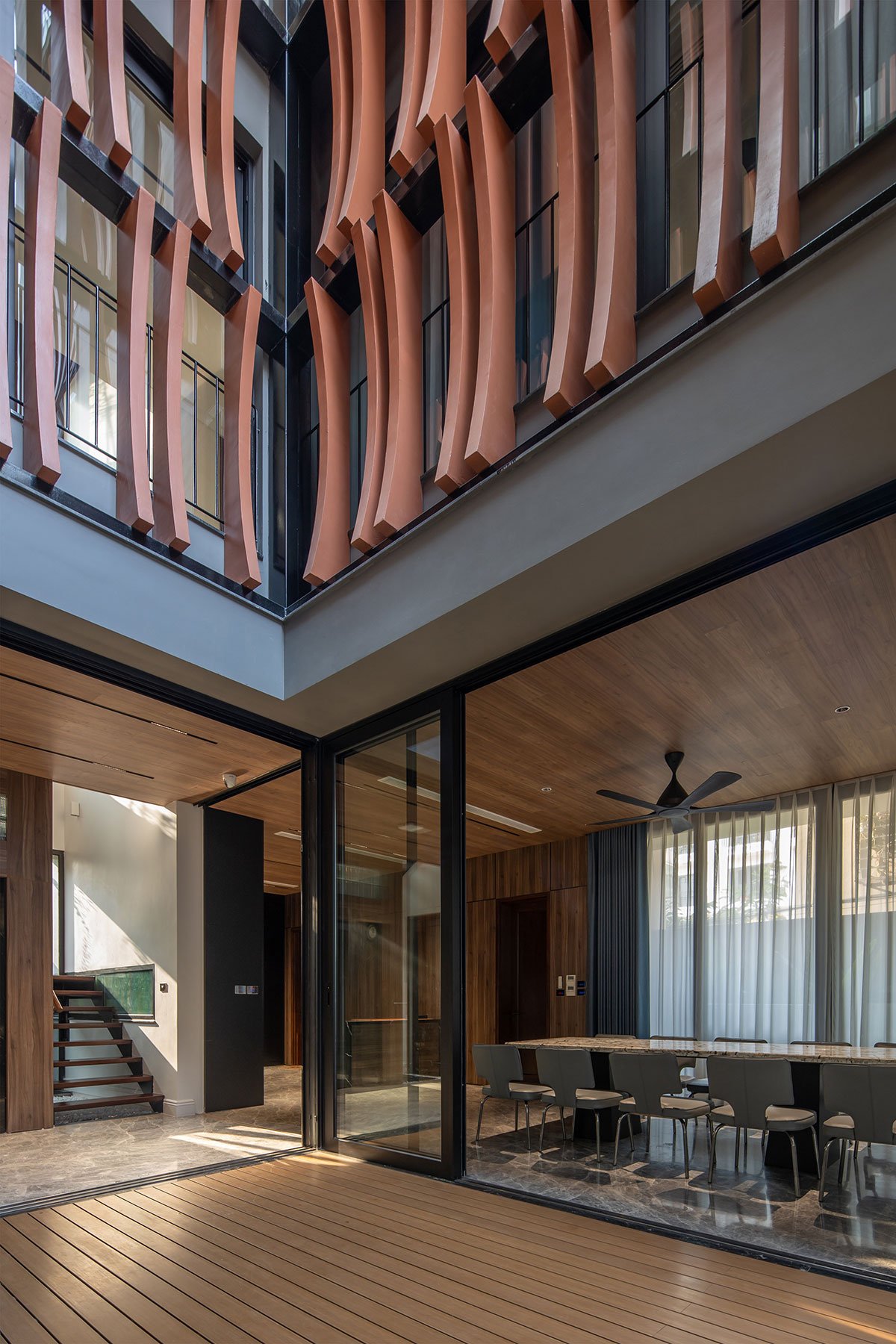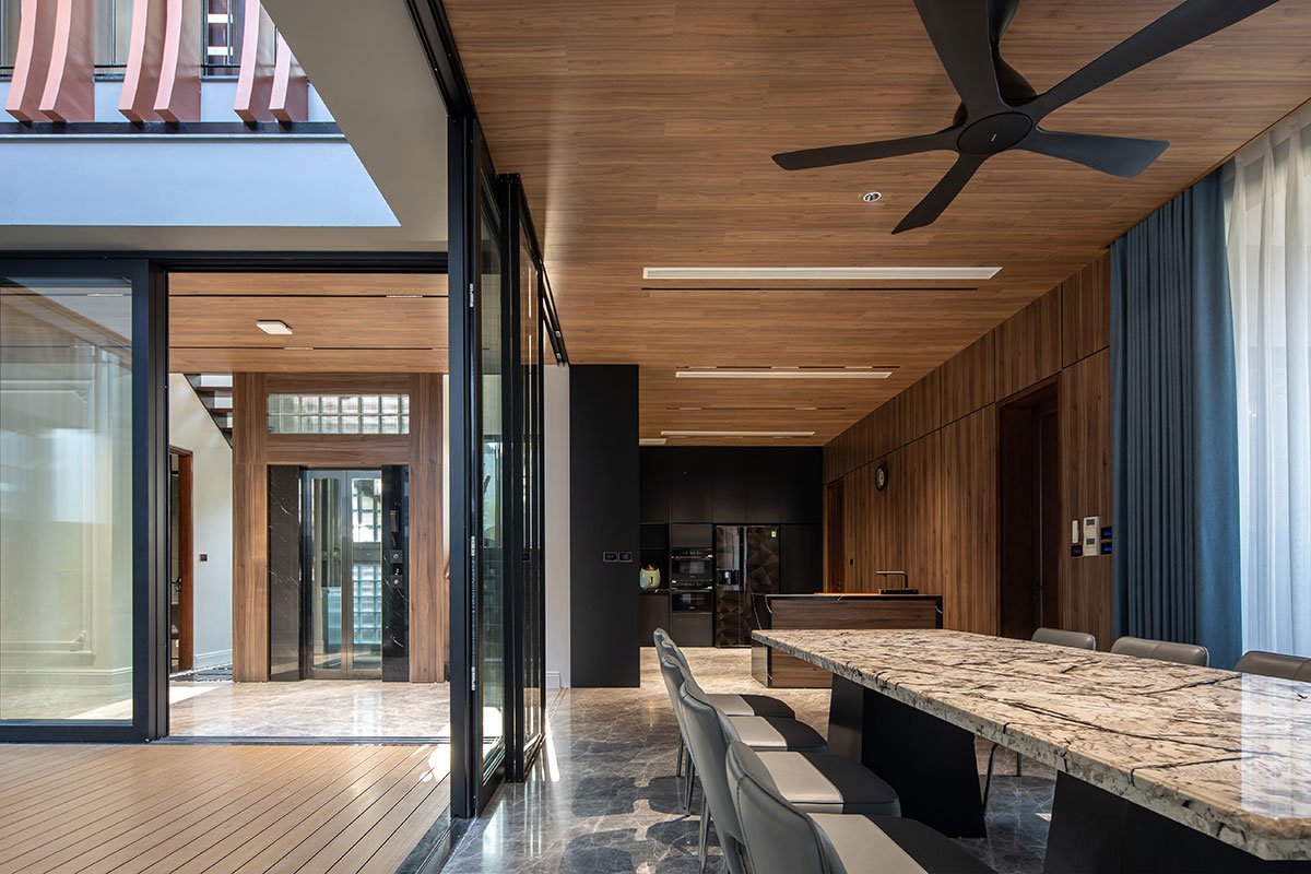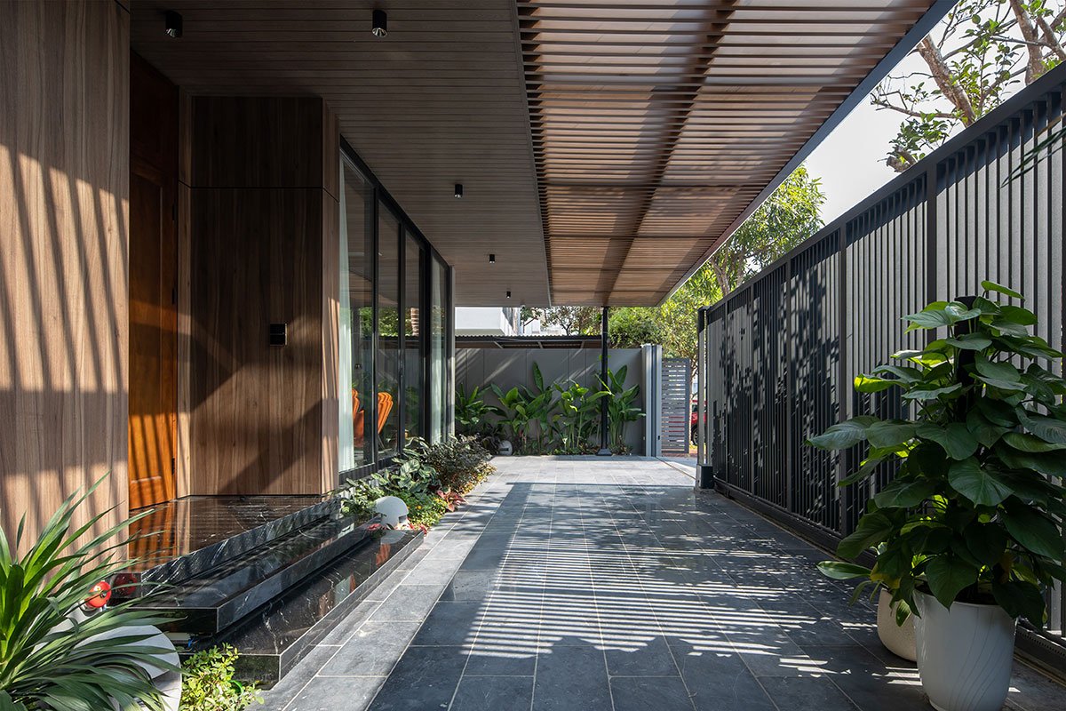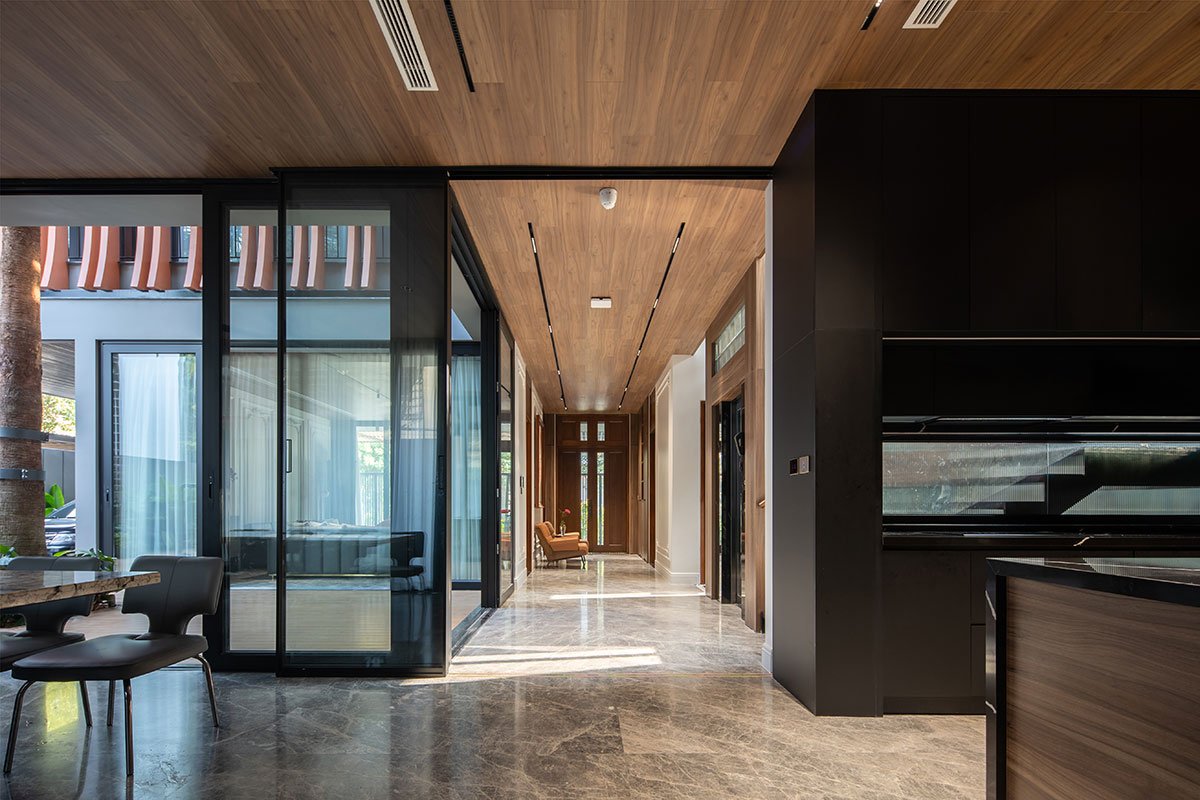 The house with a tropical philosophy takes green space as the main core that surrounds the whole house. The courtyards on the 1st floor and the connecting space are very flexible, linked together to facilitate the airflow to circulate harmoniously to cool all the spaces. The house is approached by an open verandah that combines the garden and the car parking space, interspersed with the splits of the architectural block creating an open space between the land to enhance the natural access surface. Nature for the space.