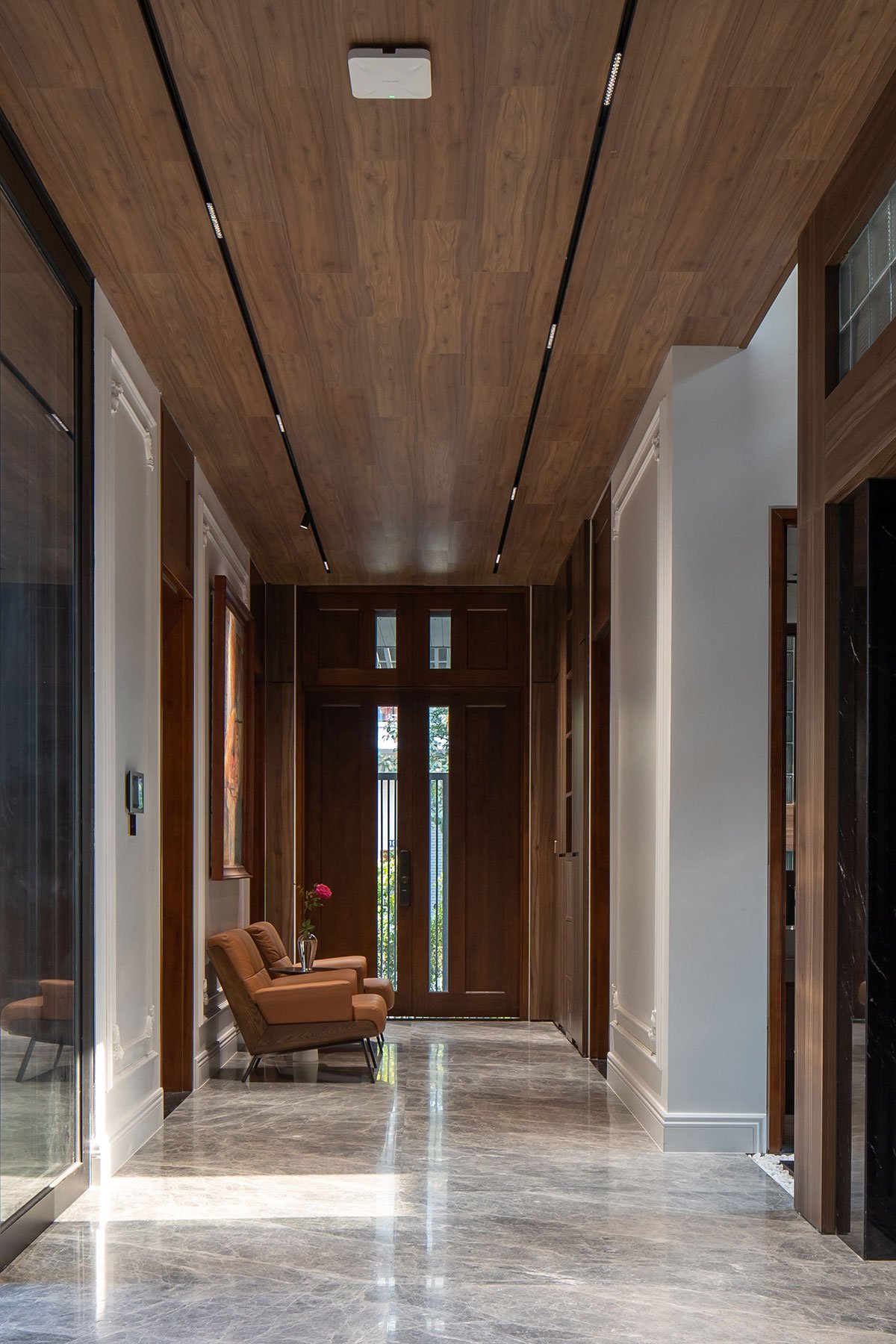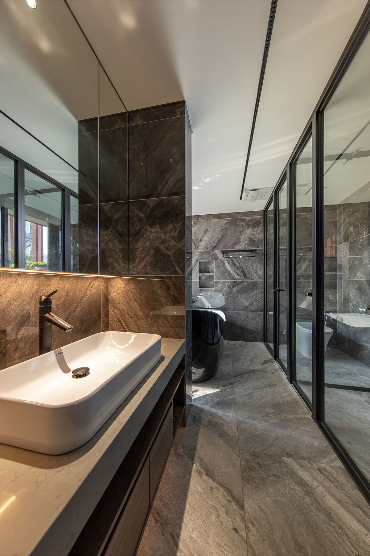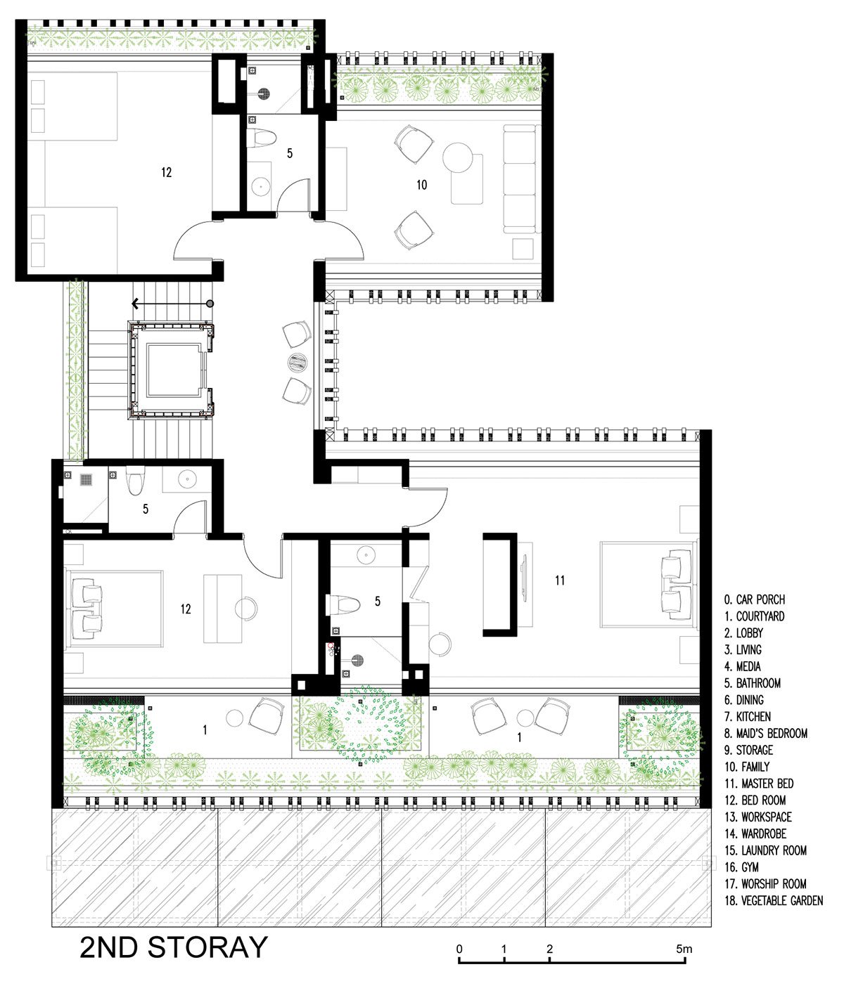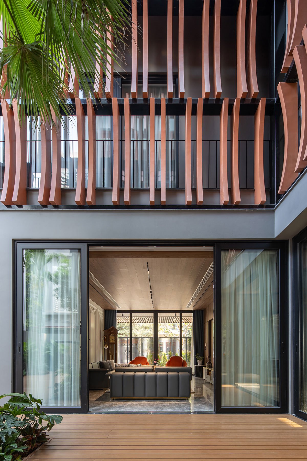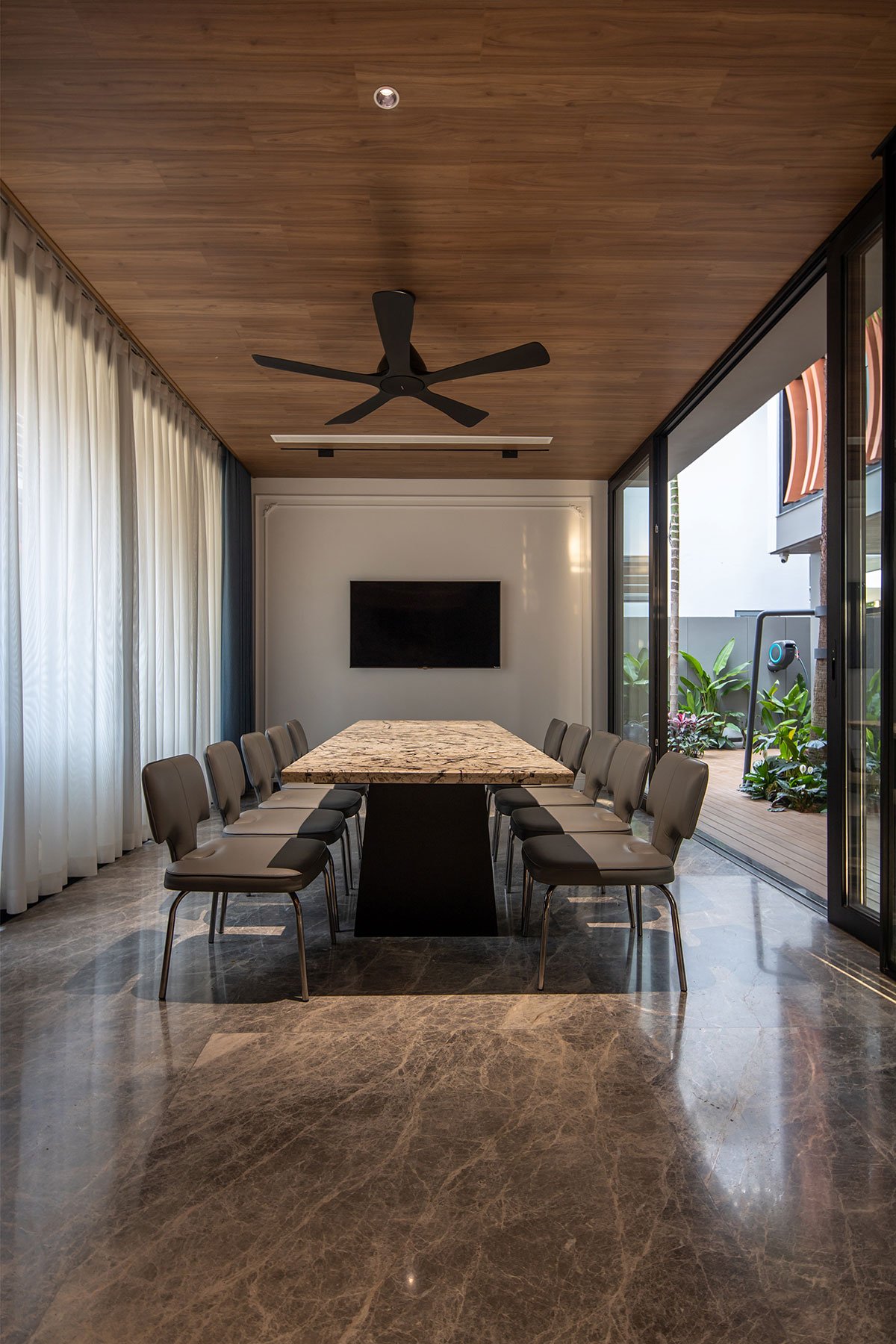 The house with a tropical philosophy takes green space as the main core that surrounds the whole house. The courtyards on the 1st floor and the connecting space are very flexible, linked together to facilitate the airflow to circulate harmoniously to cool all the spaces. The house is approached by an open verandah that combines the garden and the car parking space, interspersed with the splits of the architectural block creating an open space between the land to enhance the natural access surface. Nature for the space.