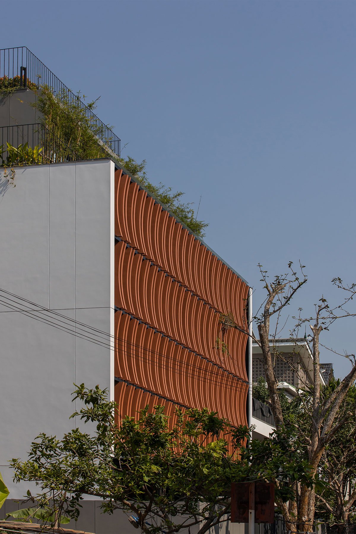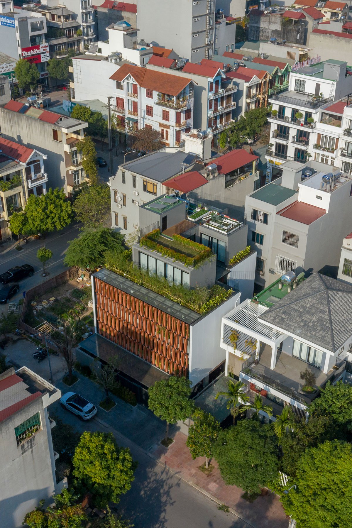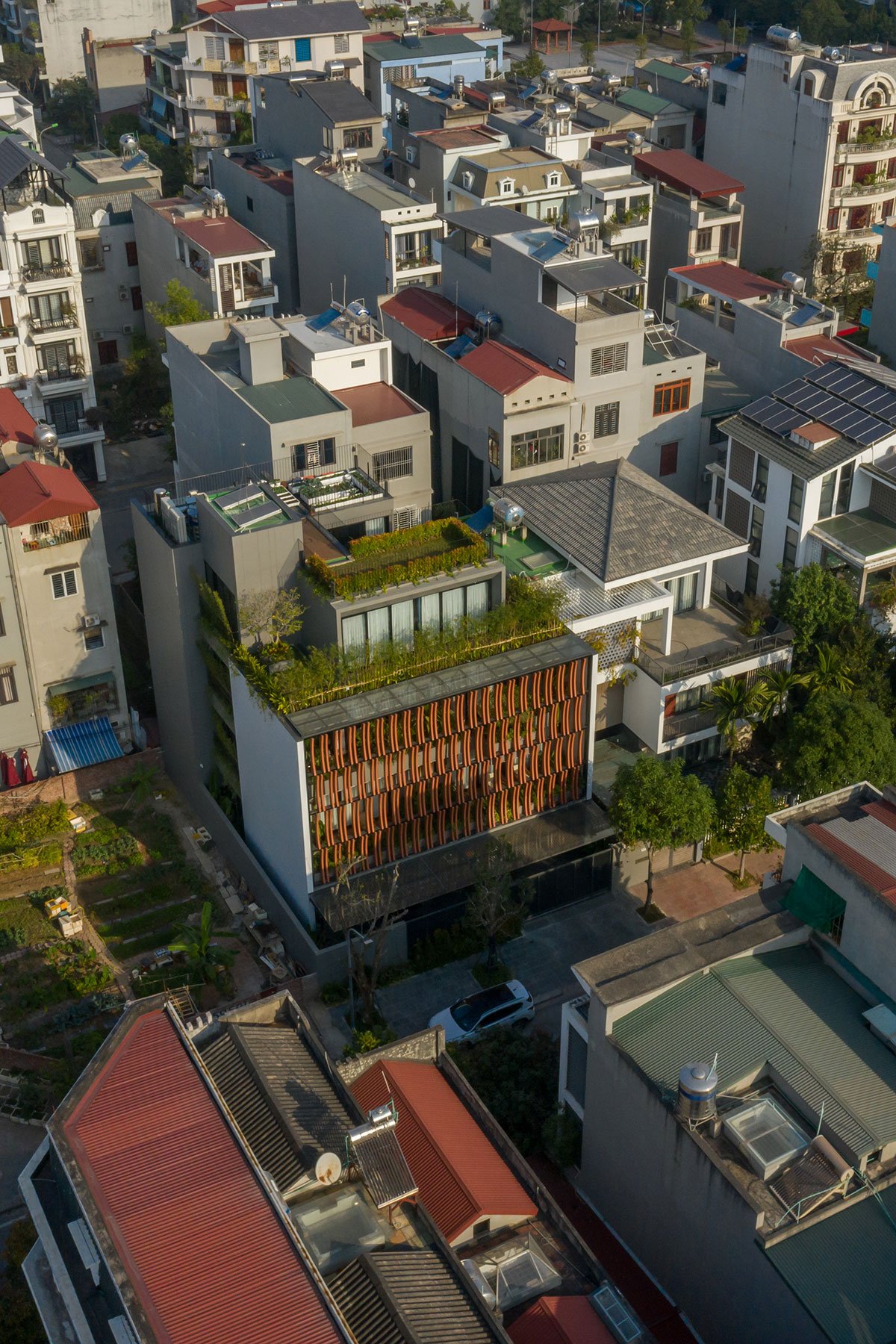 [Text as submitted by architect] ARO architects approached the needs of the house with 6 people and divided into 3 different generations. In Vietnam cities, the level of urbanization development is very high, in which Bac Giang City is an industrial-oriented city. Northern Vietnam with a tropical monsoon climate and high humidity, the air is very hot in the summer and very cold in the winter. So, with such problem requirements, the architects have come up with a natural approach to living programs for all spaces, solving the harsh sunlight in the summer and keeping the heat in the winter. The region will be the mainstay for people living in this place.