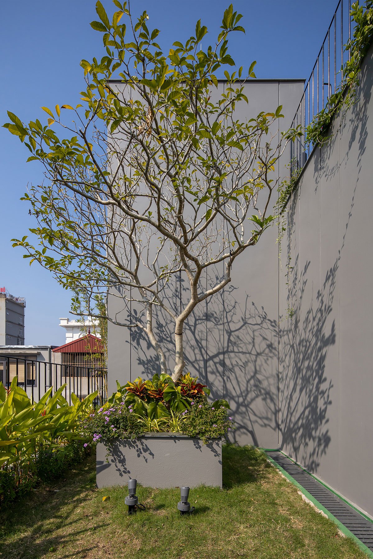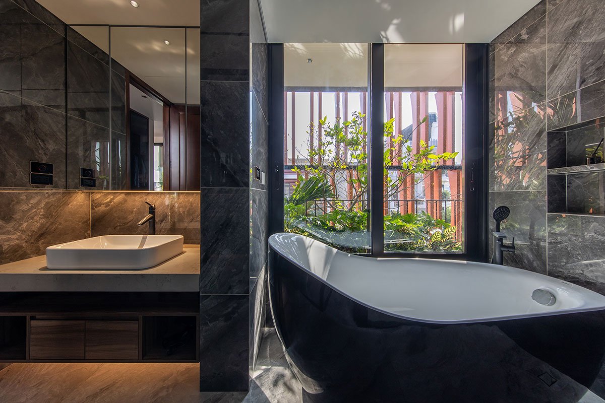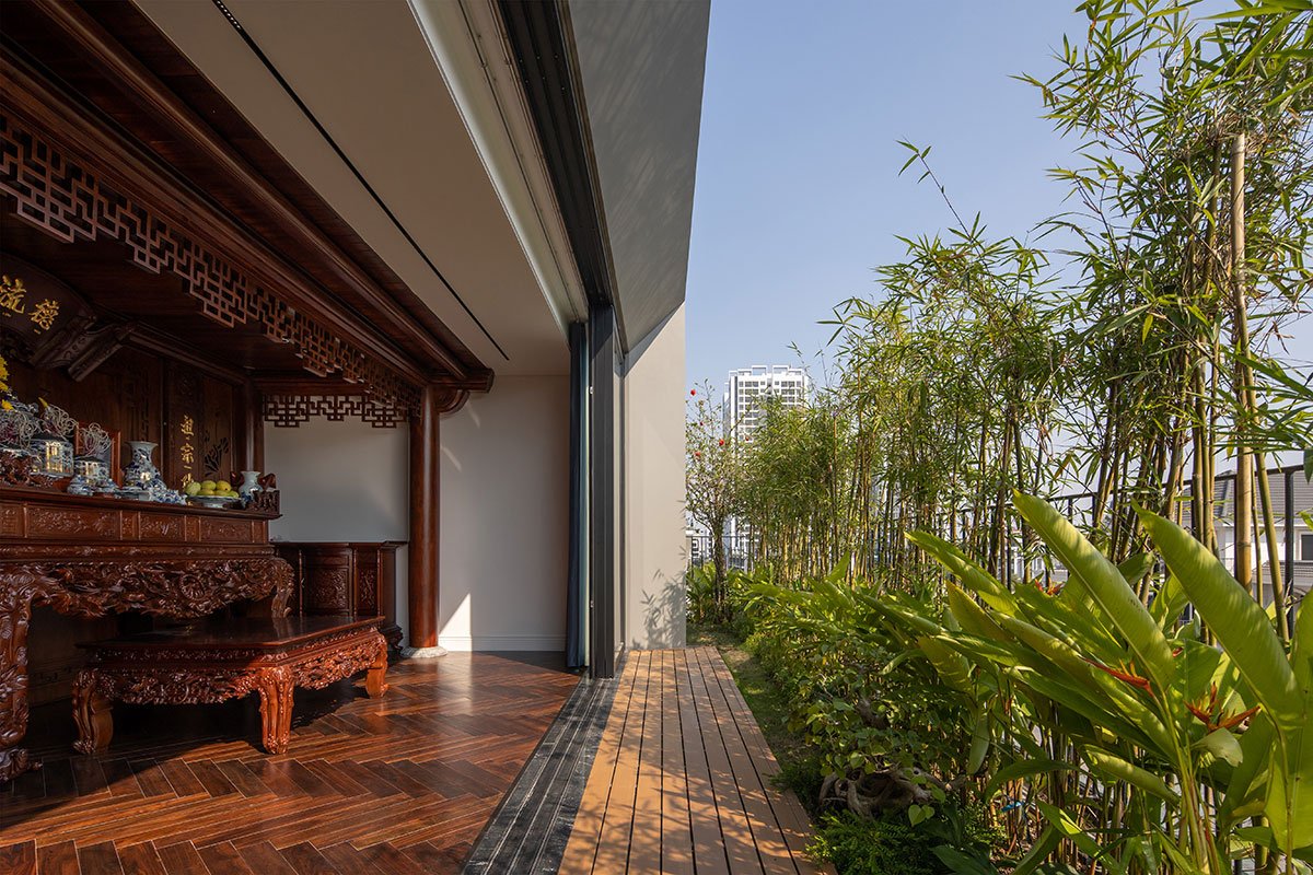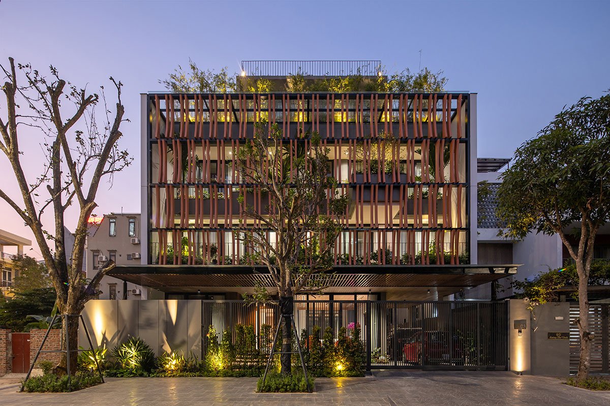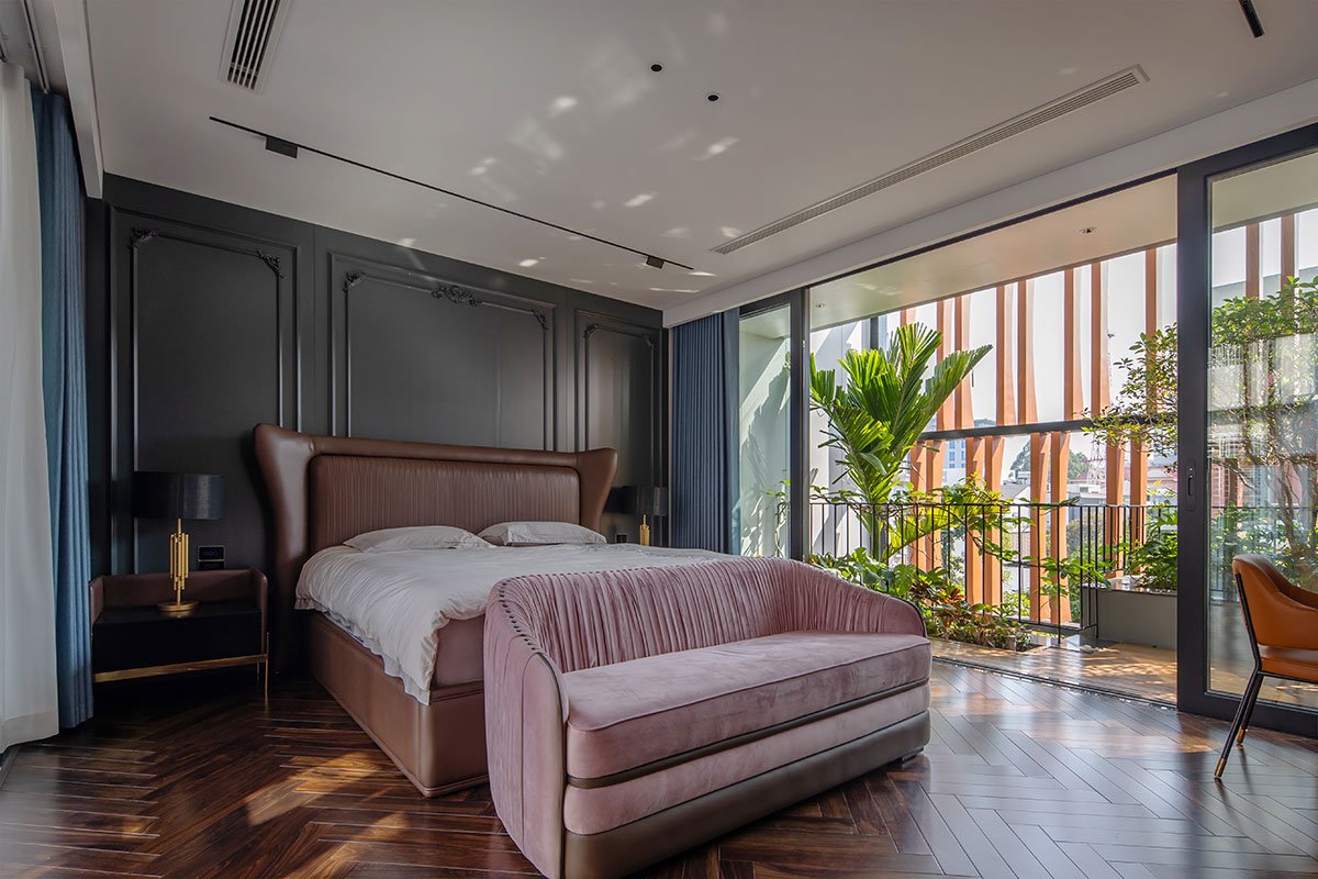 The architectural façade of the building creates a layer of blue color reminiscent of the traditional memories of the Vietnamese people, this layer of glazing will reduce the intensity of the sun’s light on the building, in addition, it will increase more privacy for the layers of living space inside. The garden layer between the blue layer and the living spaces is an intermediate space that partially regulates the microclimate and enhances the landscape, creating a sense of rest for the human mind. With the principle that the used spaces always have natural light and natural ventilation to ensure the cleanliness of the human operating environment.