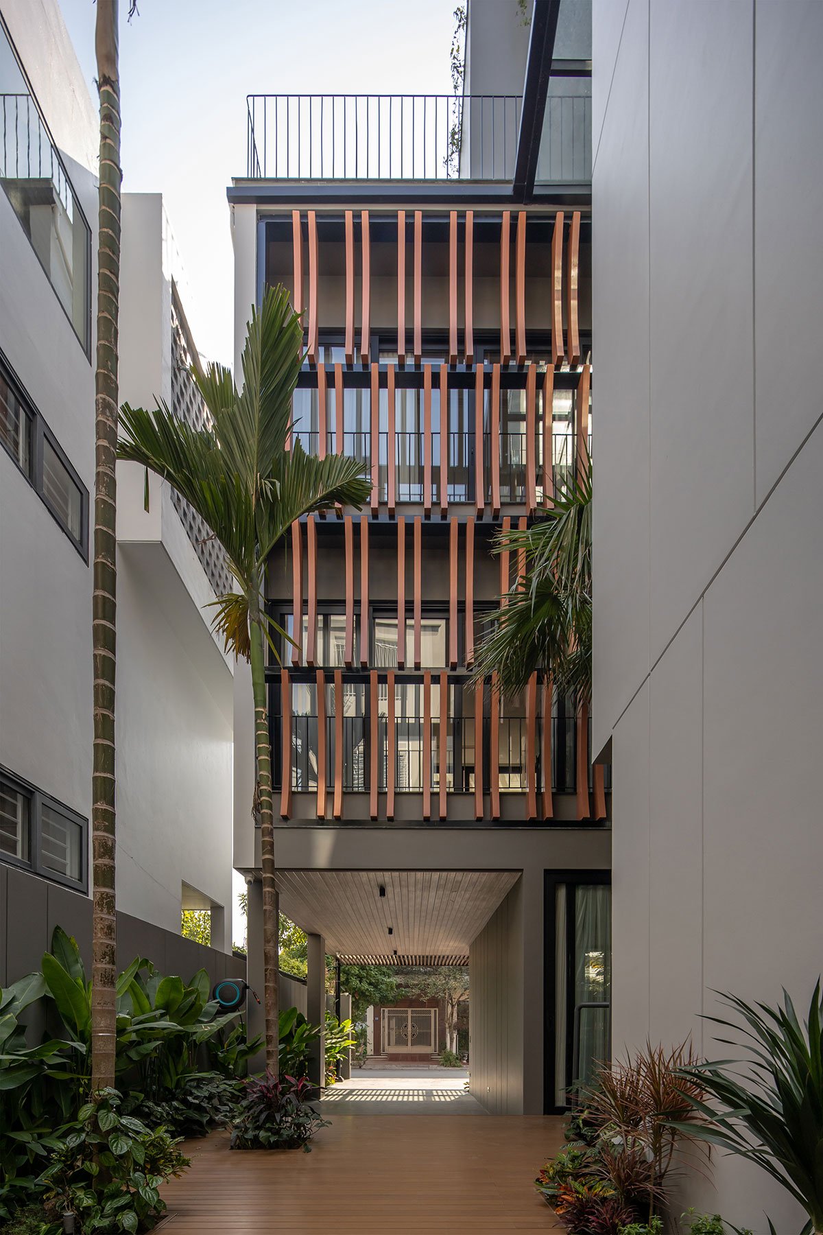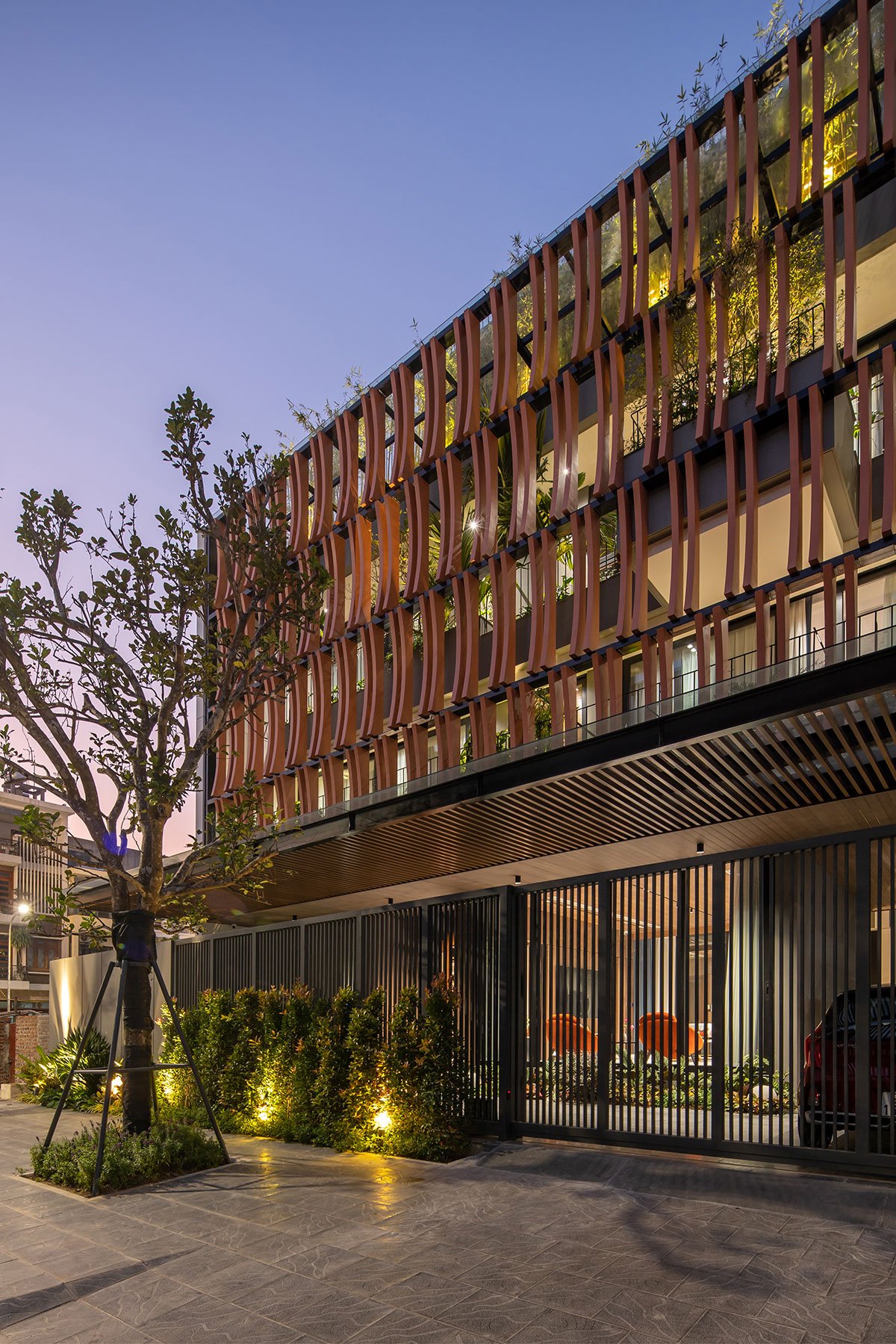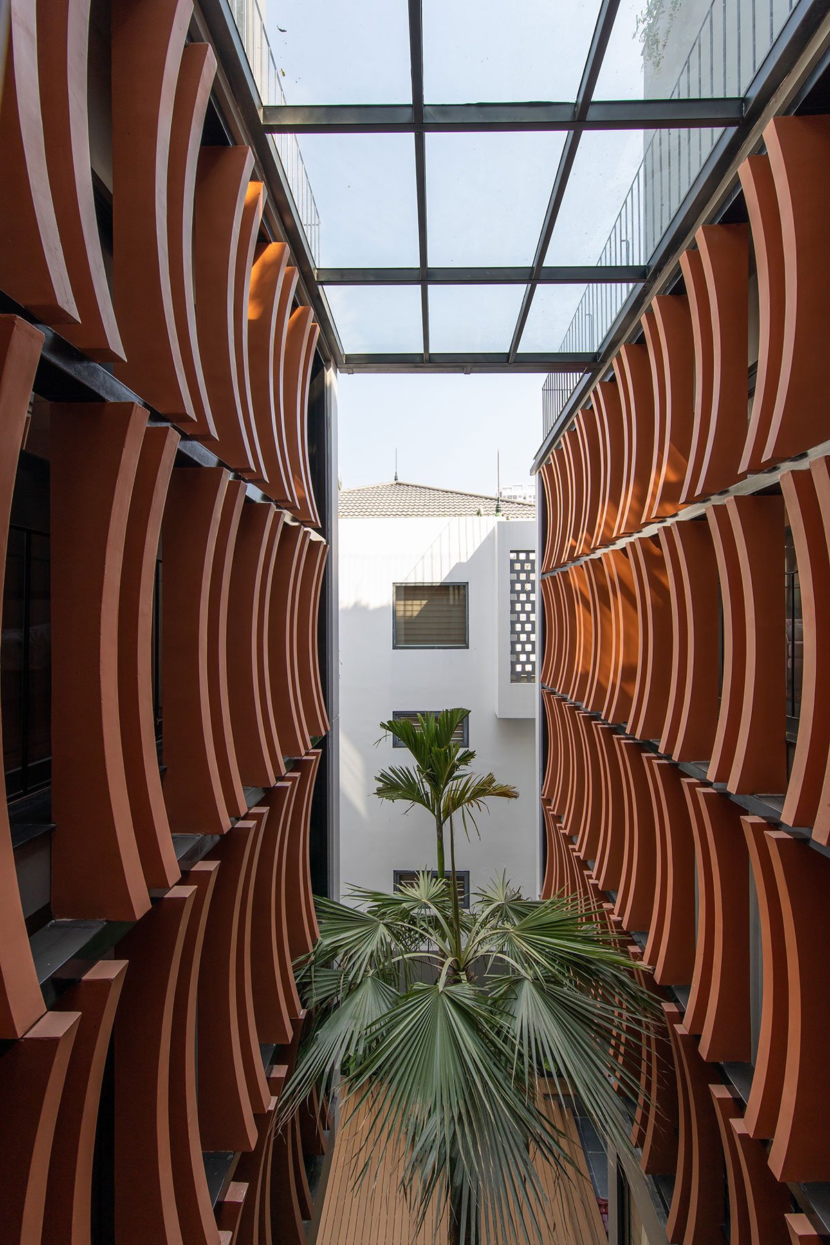 The architectural façade of the building creates a layer of blue color reminiscent of the traditional memories of the Vietnamese people, this layer of glazing will reduce the intensity of the sun’s light on the building, in addition, it will increase more privacy for the layers of living space inside. The garden layer between the blue layer and the living spaces is an intermediate space that partially regulates the microclimate and enhances the landscape, creating a sense of rest for the human mind. With the principle that the used spaces always have natural light and natural ventilation to ensure the cleanliness of the human operating environment.