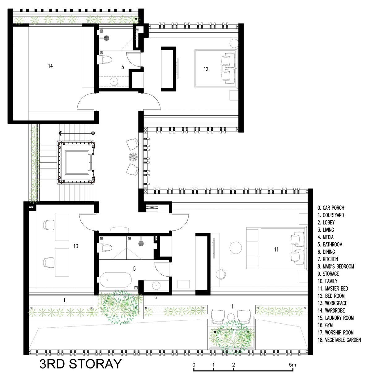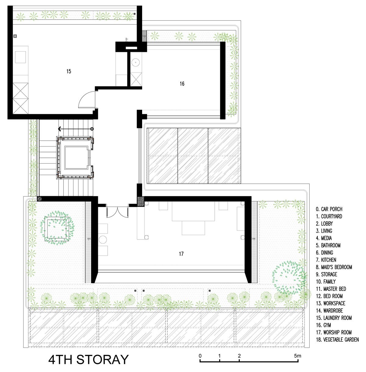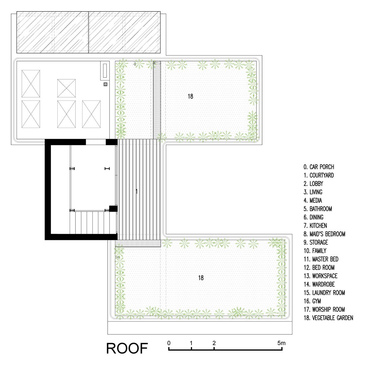 And on the top of the roof, where direct exposure to natural light will be arranged, gardens will be arranged in which there is a cultivated vegetable garden providing clean vegetables for the house, enhancing activities for the elderly and children.