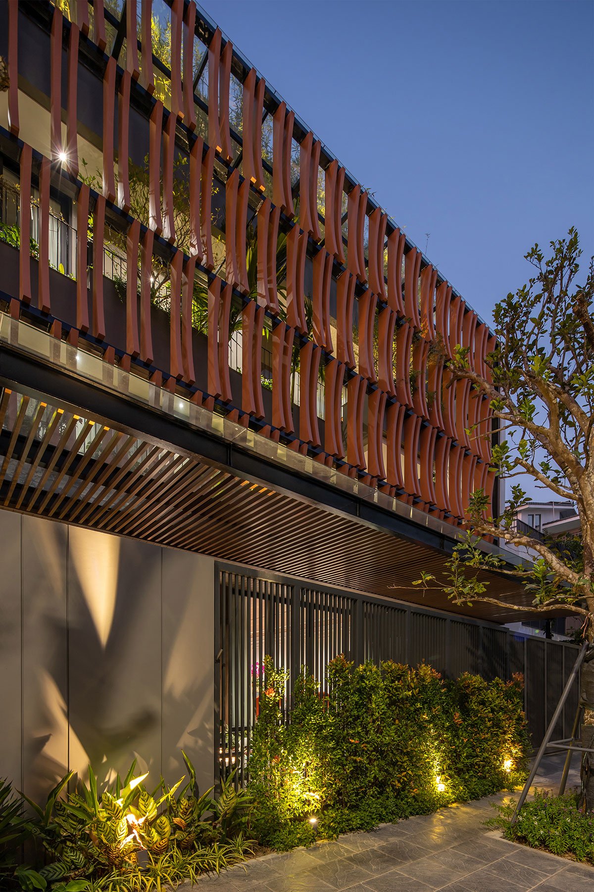 Excerpt: Tropical House 1, designed by ARO studio, creates a layer of blue color reminiscent of the traditional memories of the Vietnamese people. The orange layer of glazing reduces the intensity of the sun’s light on the building. The garden layer between the blue layer and the living spaces is an intermediate space that partially regulates the microclimate and enhances the landscape, creating a sense of rest for the human mind.