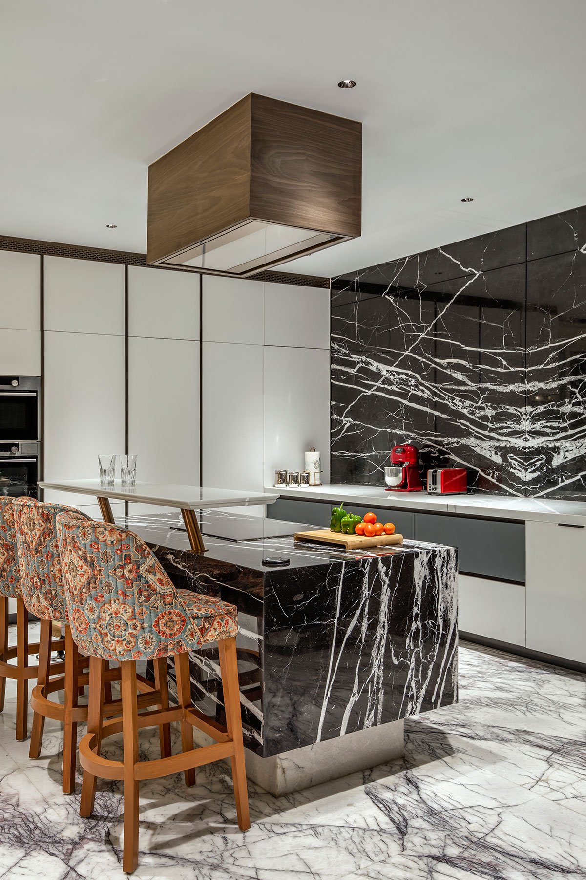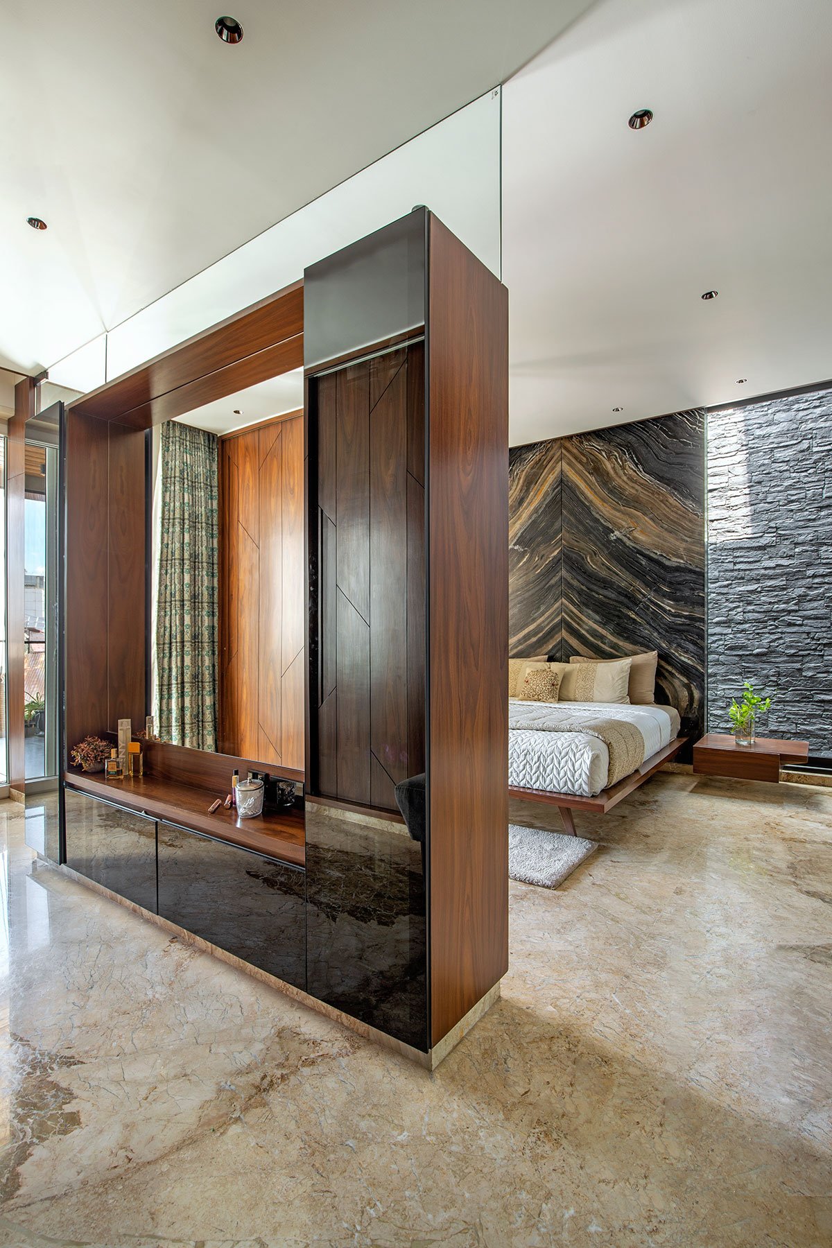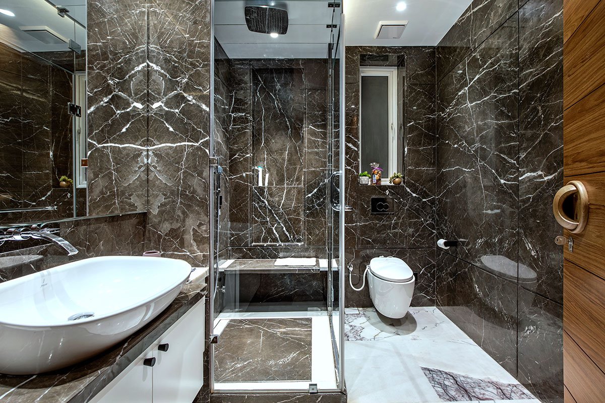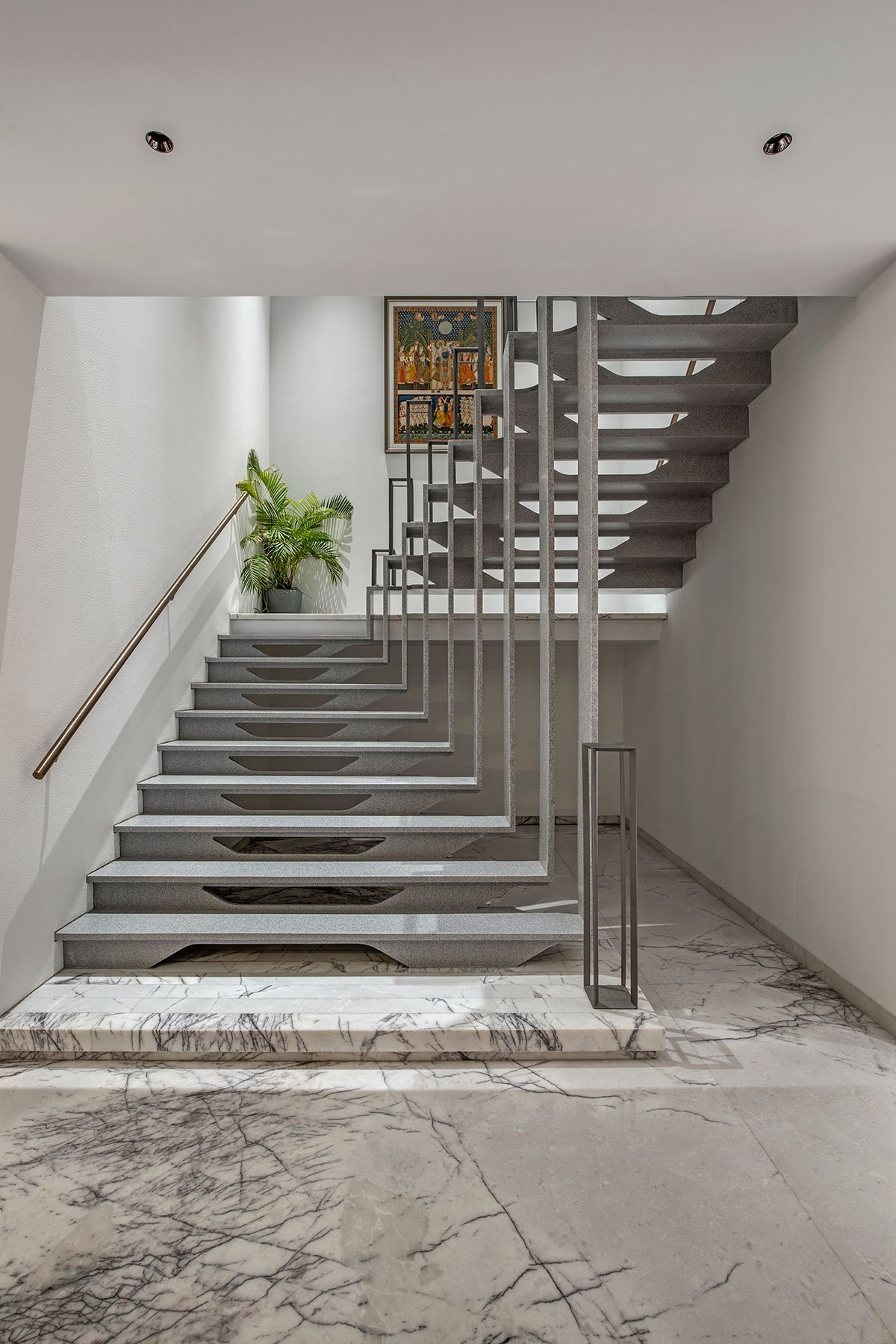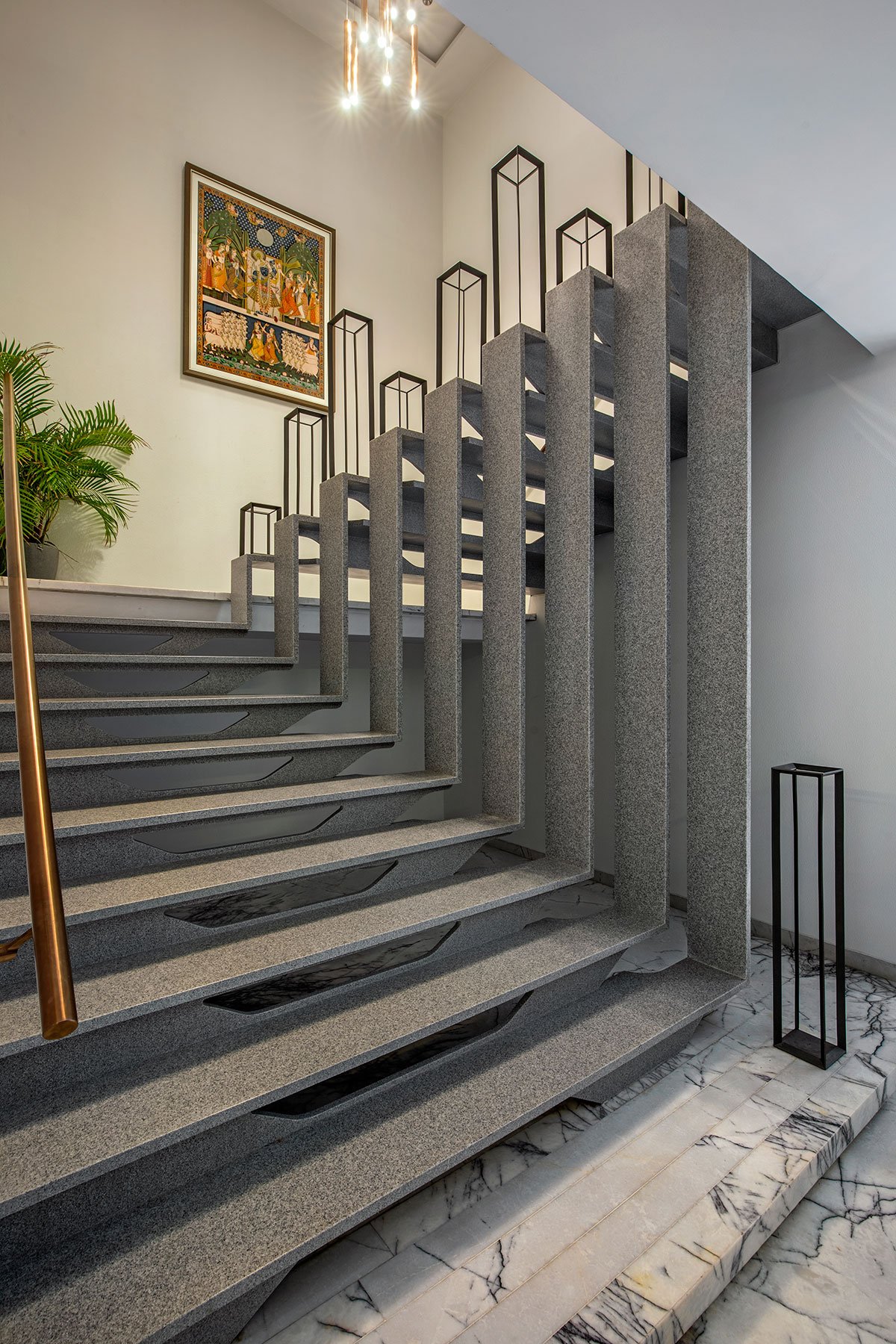 The challenges: The internal staircase, a captivating fusion of challenge and beauty, emerges as a masterpiece. Fashioned from 10 mm M.S. Plates folded from one wall to another and clad in 6 mm and 12 mm Corian material, it boasts a mere 28 mm thickness. Resource efficiency takes center stage with the meticulous management of Lilac Marble wastage in the staircase landings.