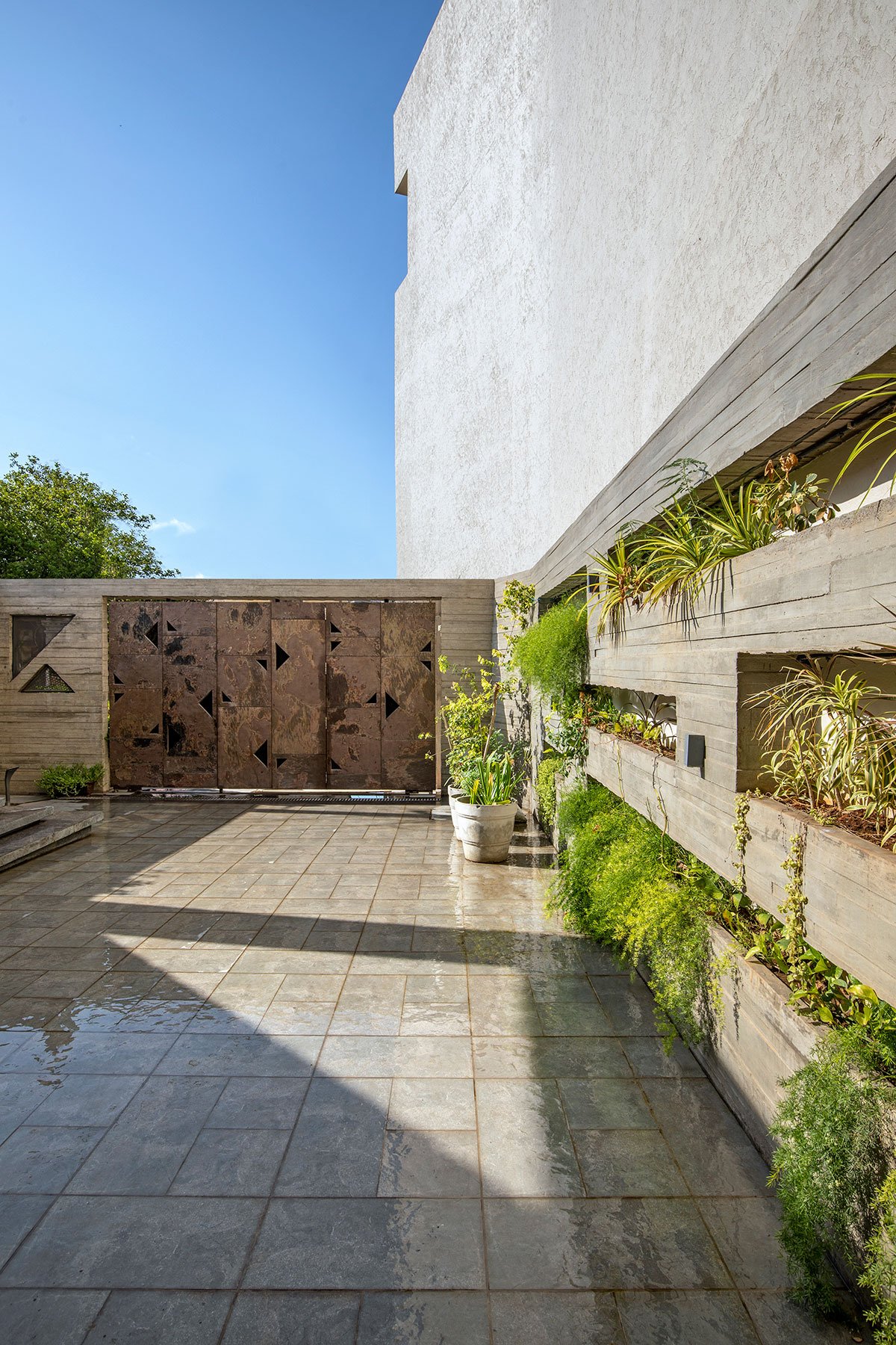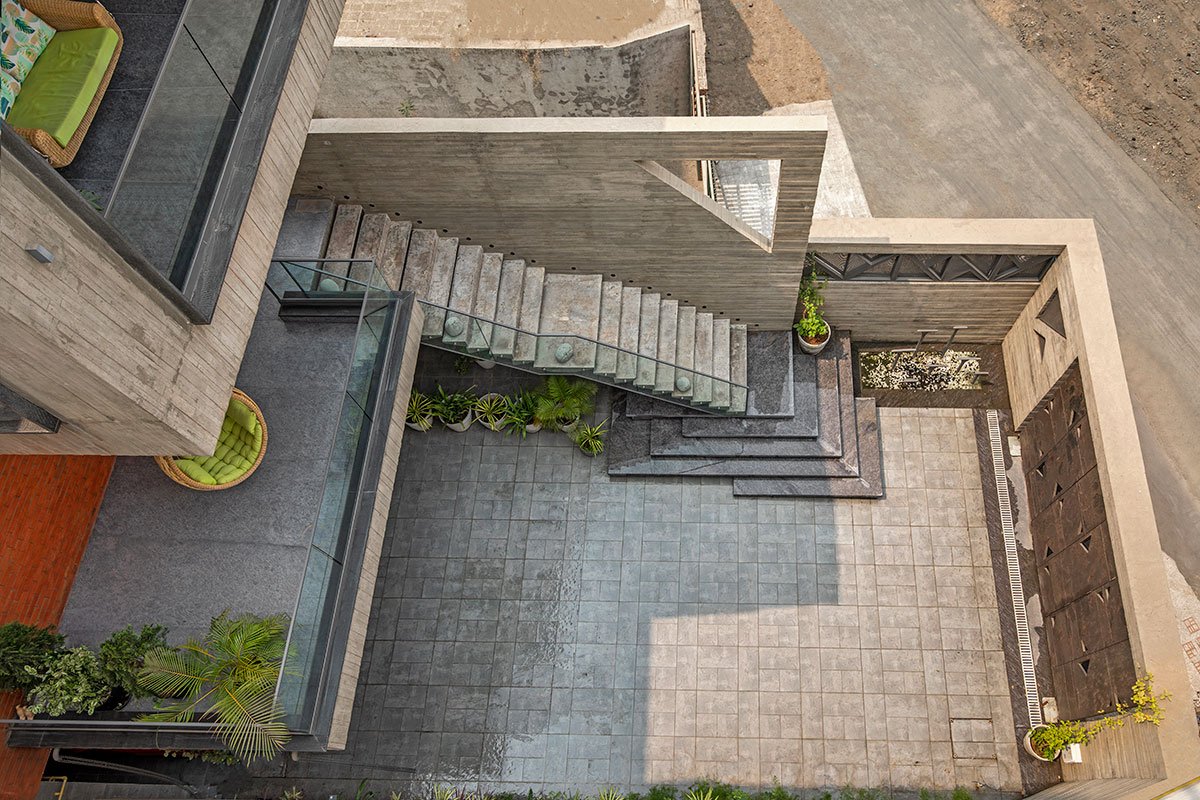 Even the external staircase, subjected to a jumping test, stands as a bold feature. A 5 ft cantilever in raw concrete epitomizes both structural integrity and a daring aesthetic statement.