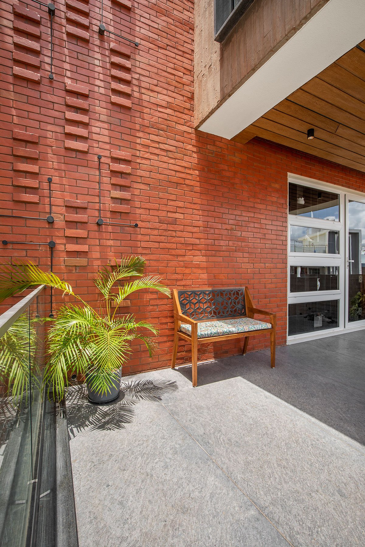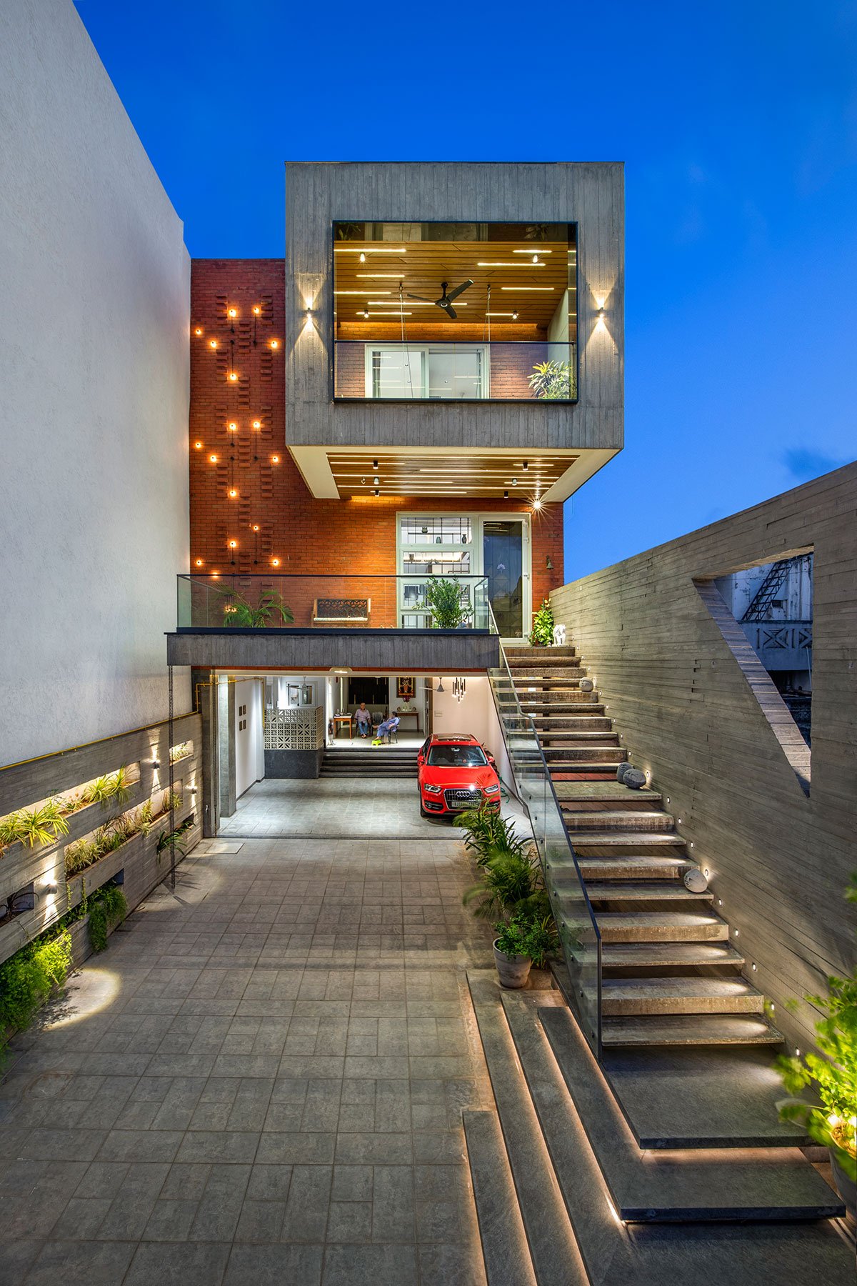 The front elevation facade stands as a testament to structural innovation, boasting 10 ft cantilevers employing PT beam and slab technology, adorned with exposed brick and concrete finishes. Industrial elegance permeates through raw concrete stairs, encapsulating the ethos of embracing the inherent beauty of every space.