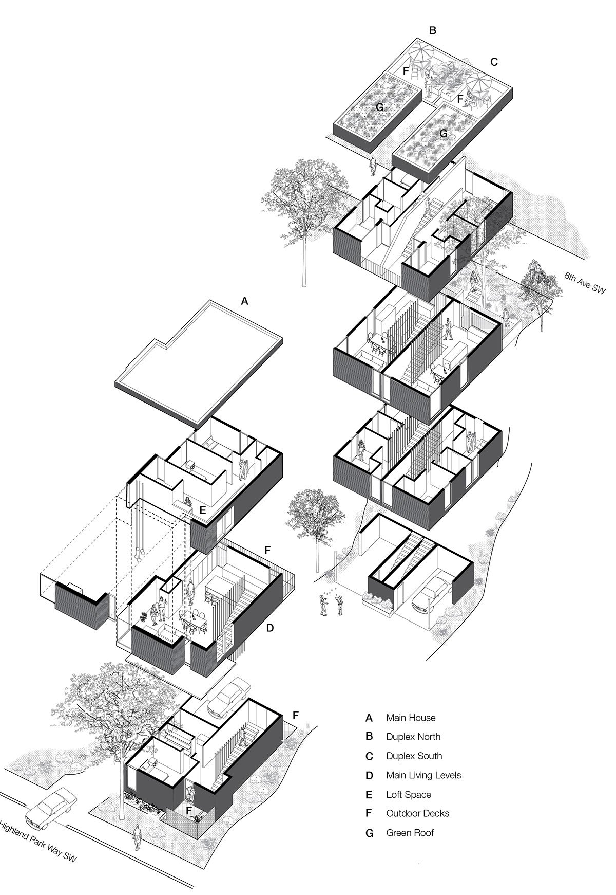 The main house sits along the busy arterial of Highland Park Way, while the duplex is nestled into the hillside and wooded greenbelt along 8th Ave. Both buildings are well connected to place-  strategically placed windows focus views in between adjacent buildings and towards trees and nature. The main house is entered through a front porch off the sidewalk on Highland Park Way and the duplex has entries from both the auto court and from a porch the pedestrian access off 8th ave. This connects the entire site, using the steep slope as a connecting device between the two streets. The site plan was composed by careful arrangement of outdoor living spaces, green roofs, and large south facing windows.