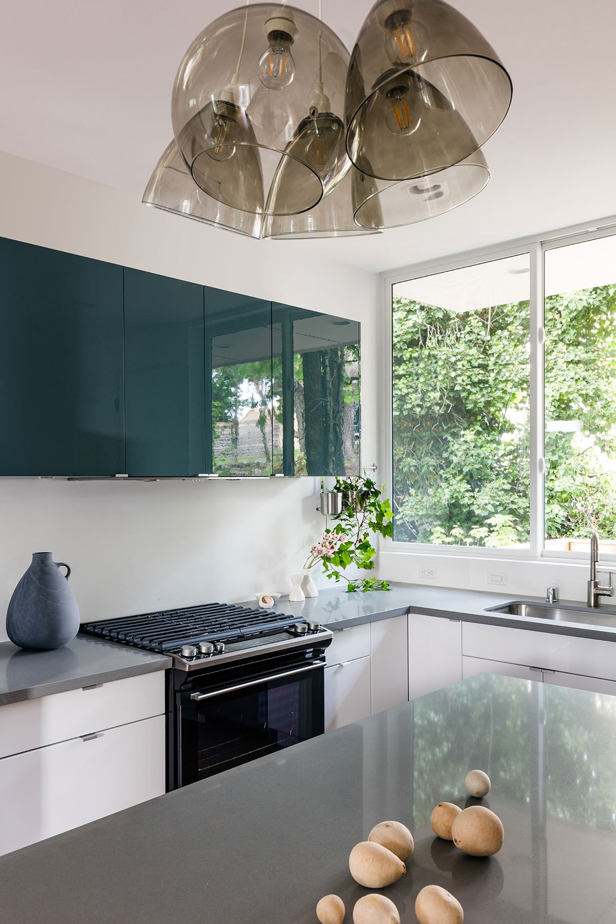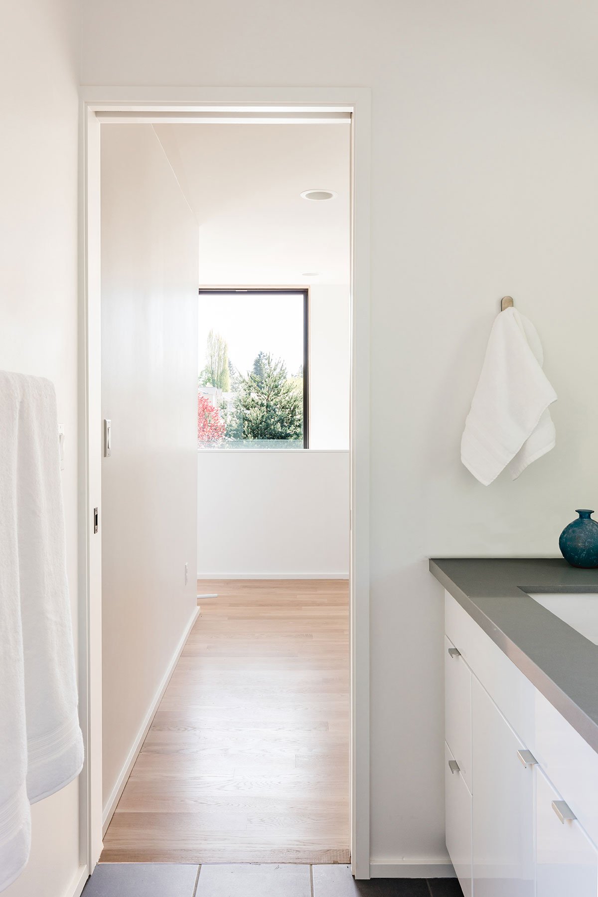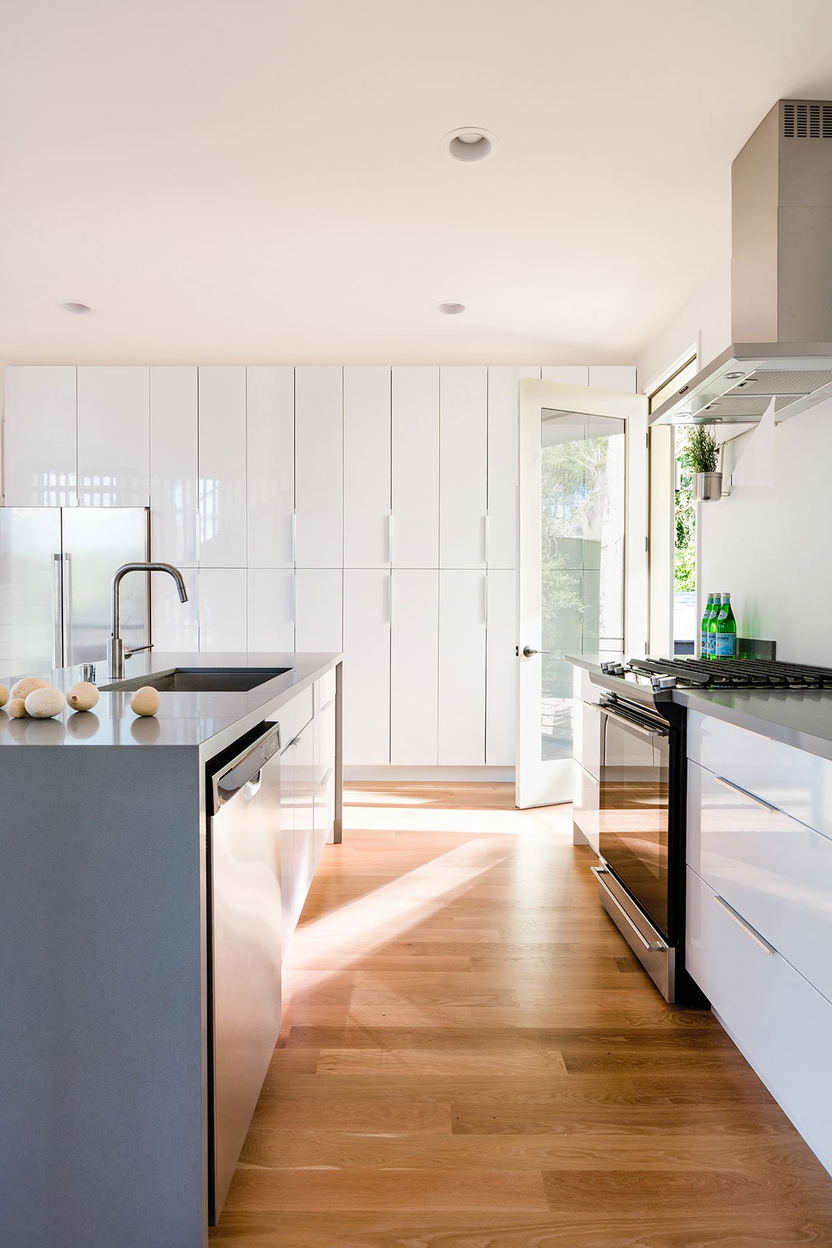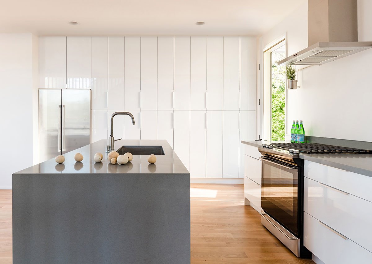 The three dwellings orient towards the adjacent green areas to provide experience with sunlight, glimpses of nature, and access to the outside onto decks and terraces. The main house living area is open to the dining and kitchen, with large doors opening to an outdoor deck to the east. The high gloss white kitchen casework reflects the outdoor light and textures and brings nature into the interiors.
