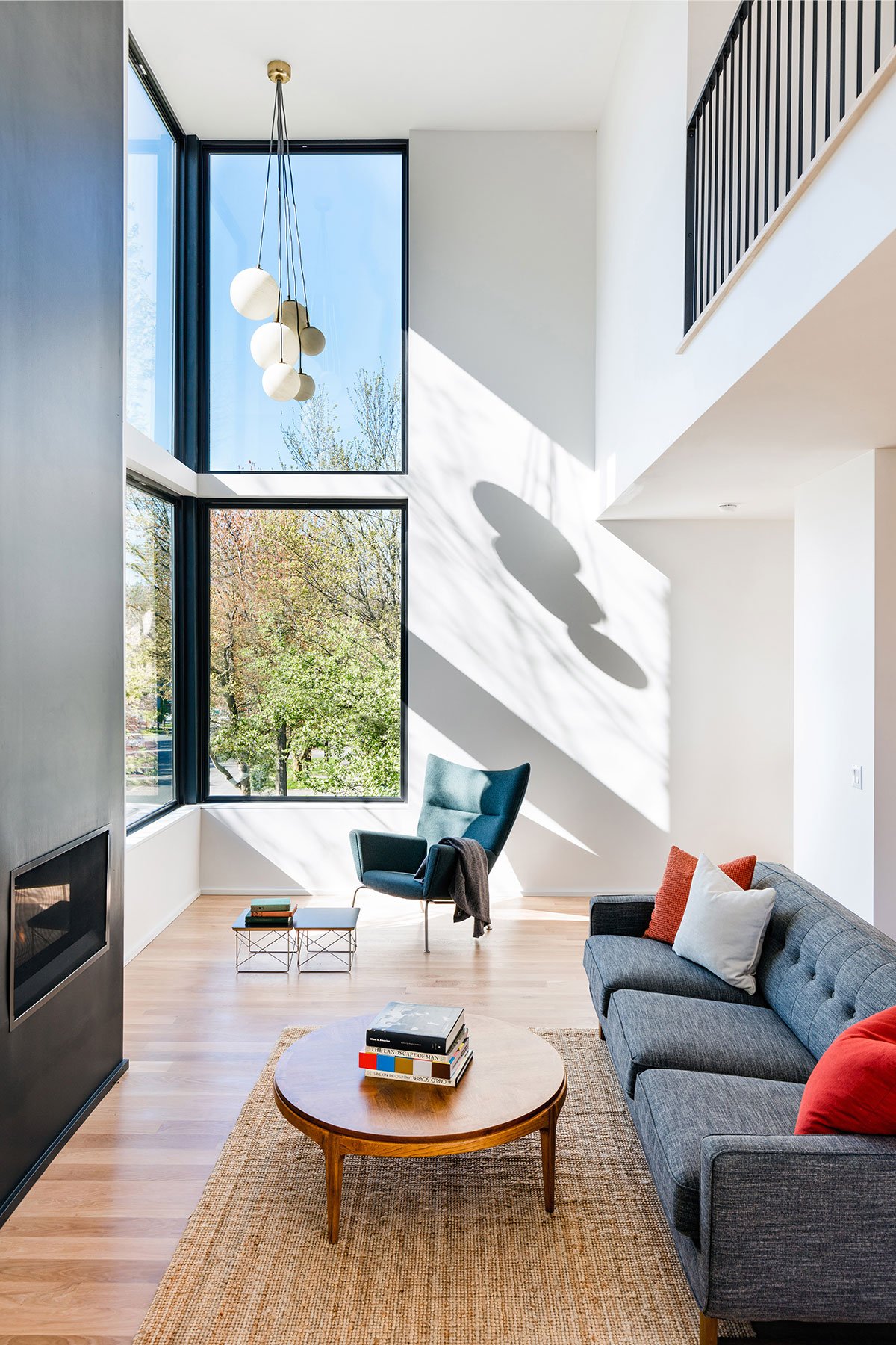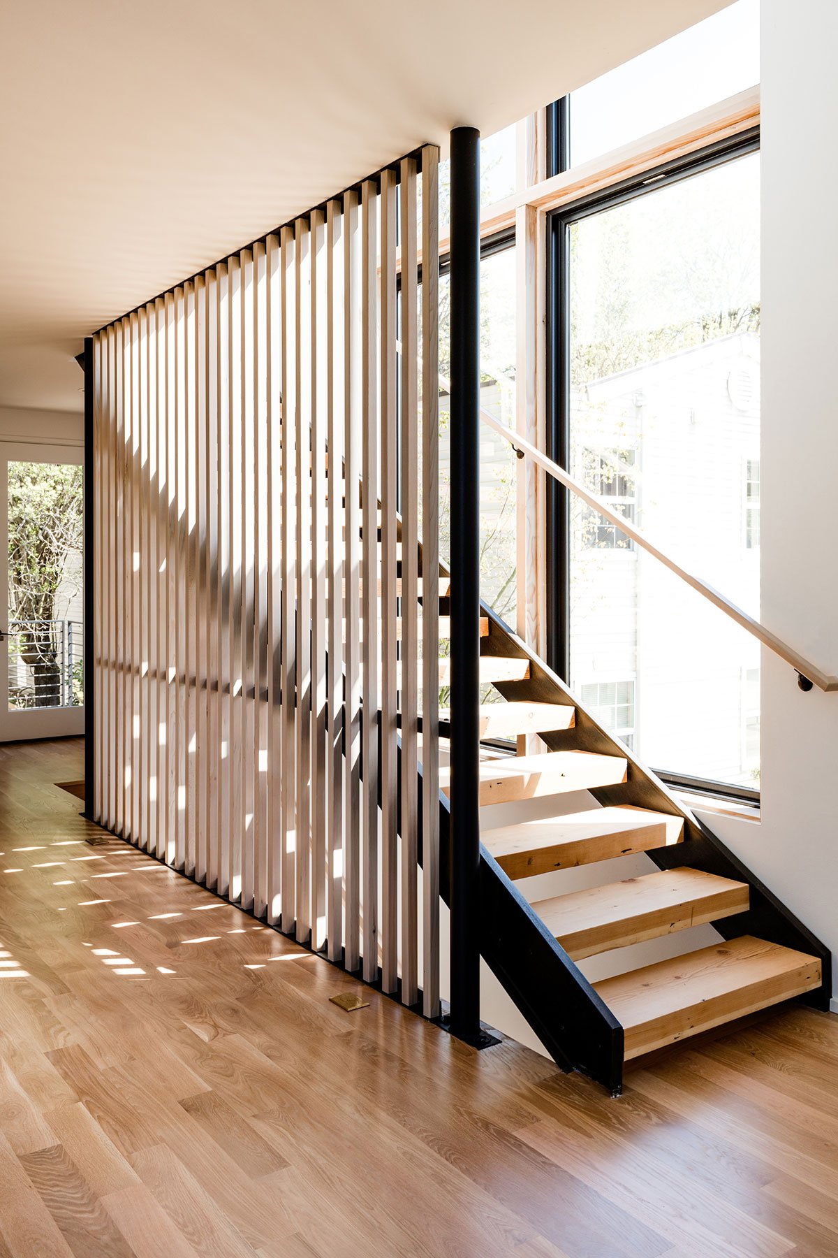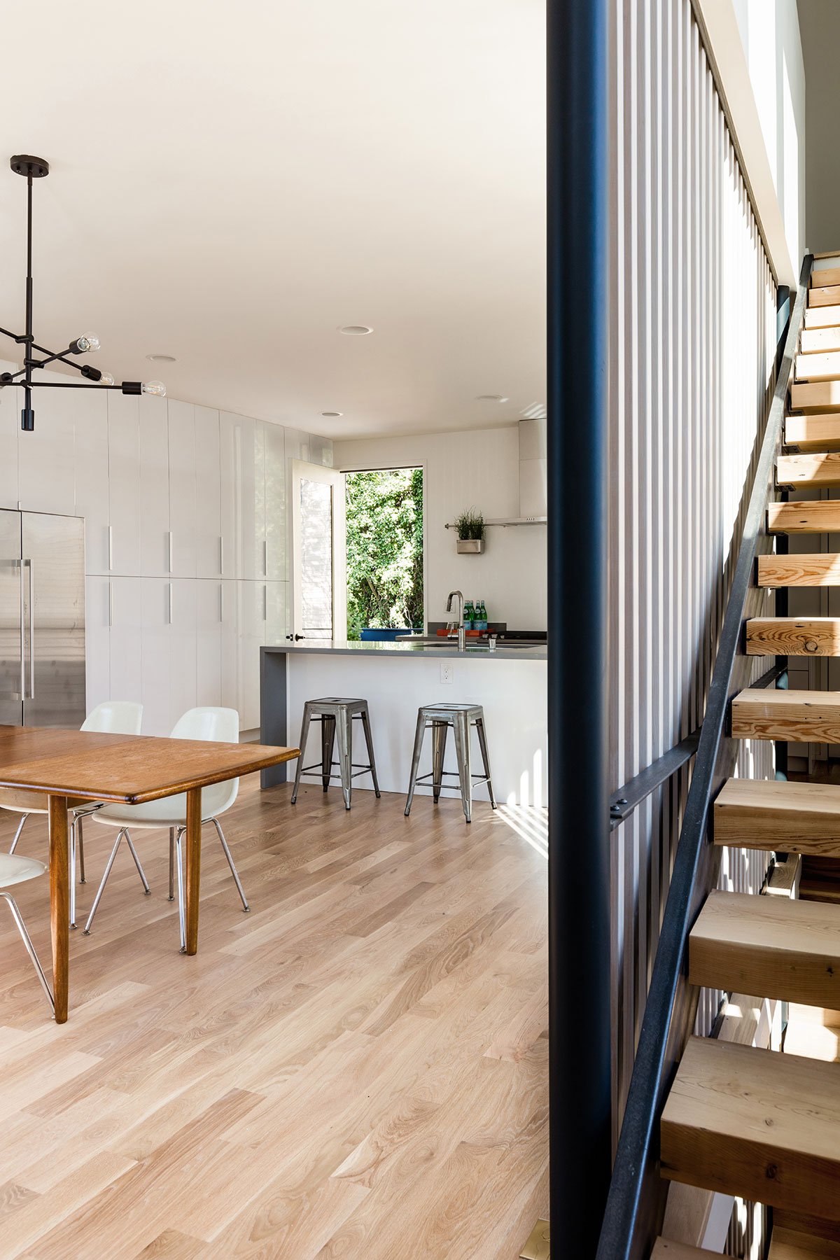 A double height living space and mezzanine above in the main house includes an iconic corner window and pendant that are visible along the busy adjacent arterial of Highland Park Way. A south facing ‘megawindow’ is a sixteen foot tall window next to floating stairs with a Tsuga hemlock wood screen that allows direct sunlight  to enter while filtering privacy for the dining room and kitchen.