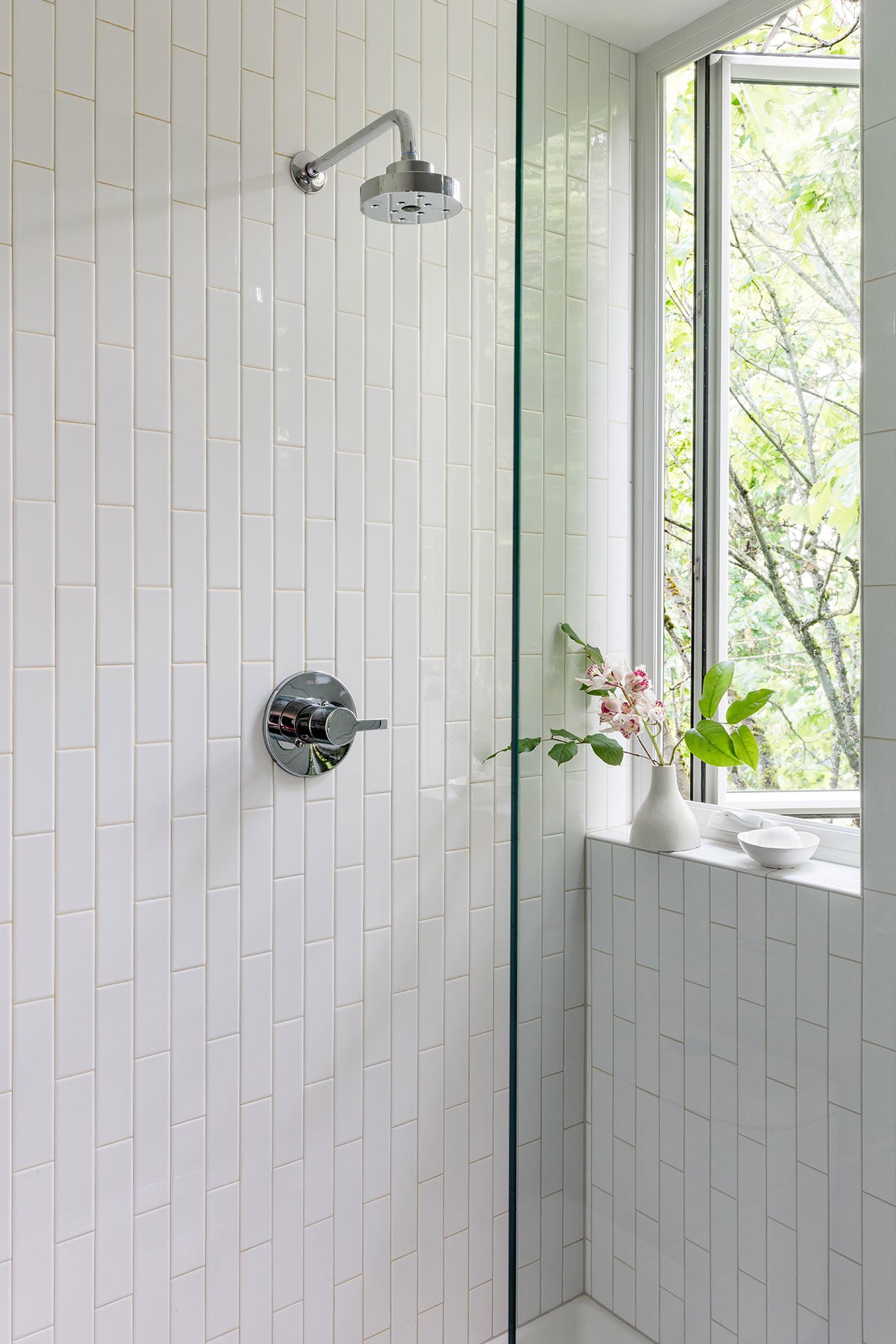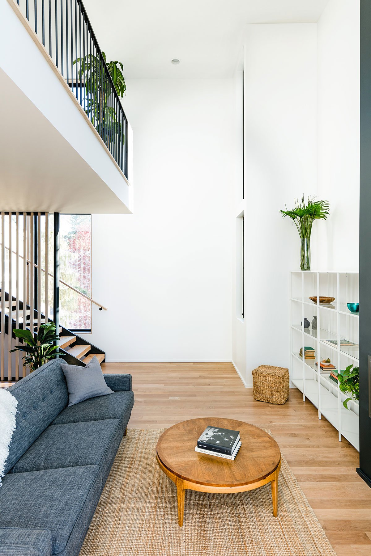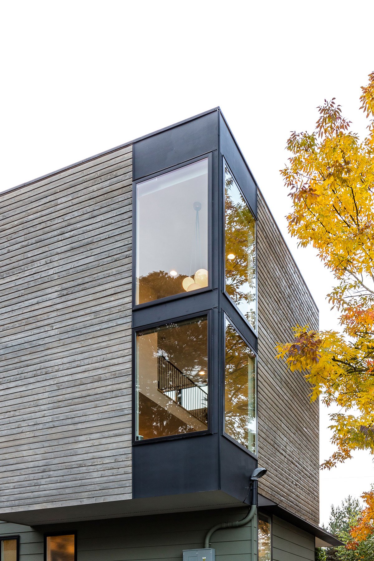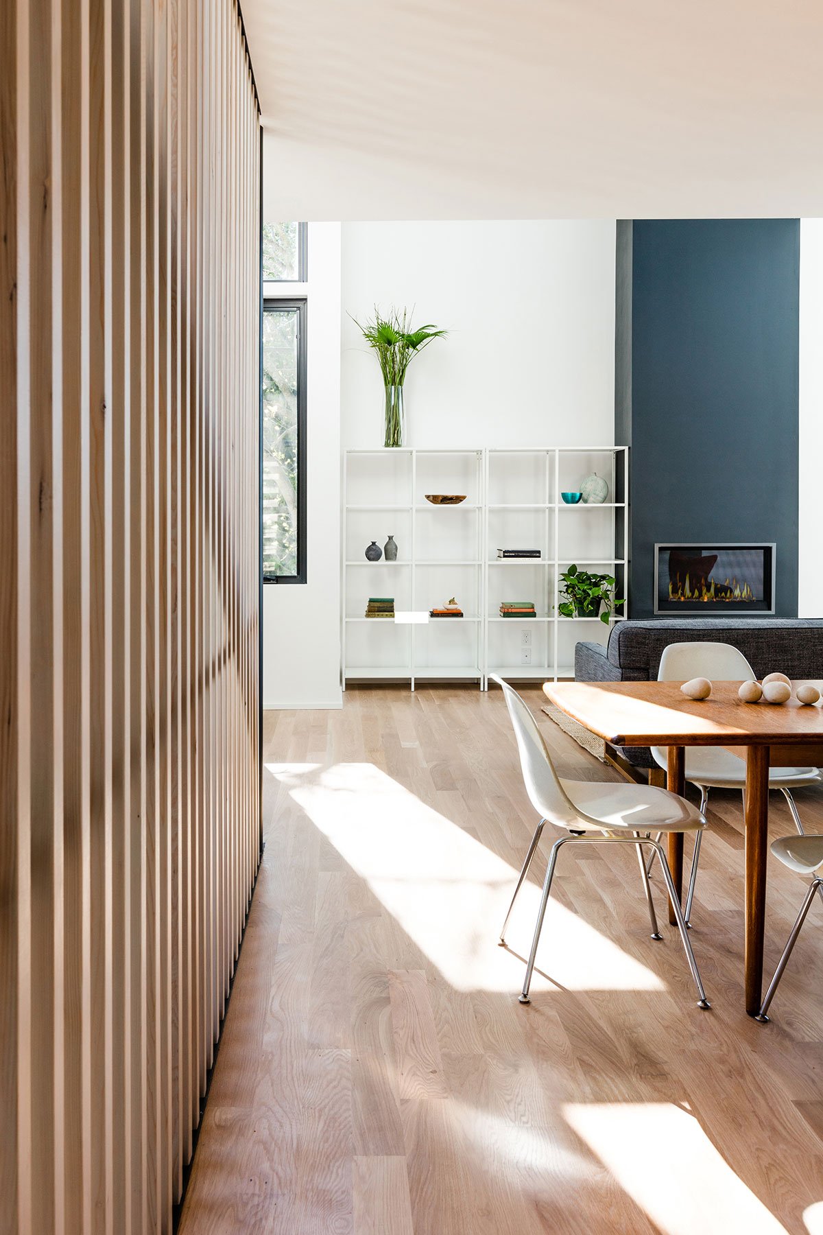 A double height living space and mezzanine above in the main house includes an iconic corner window and pendant that are visible along the busy adjacent arterial of Highland Park Way. A south facing ‘megawindow’ is a sixteen foot tall window next to floating stairs with a Tsuga hemlock wood screen that allows direct sunlight  to enter while filtering privacy for the dining room and kitchen.