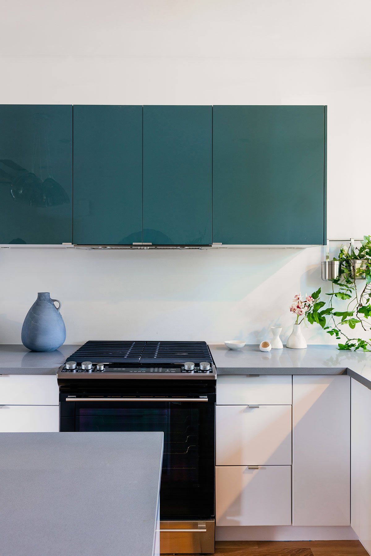 The kitchens include generous pantries with ample storage and are built with simple and affordable materials of grey quartz, solid white oak floors, stainless steel, and high gloss white laminate casework. The interior design of the bathrooms includes window niches and simple affordable ceramic tile and water saving bath fixtures, and affordable ceramic tile.  The duplex kitchen has ample natural light from the wooded forest along 8th Ave, and simple, affordable finish materials with two colors of wood laminate casework.