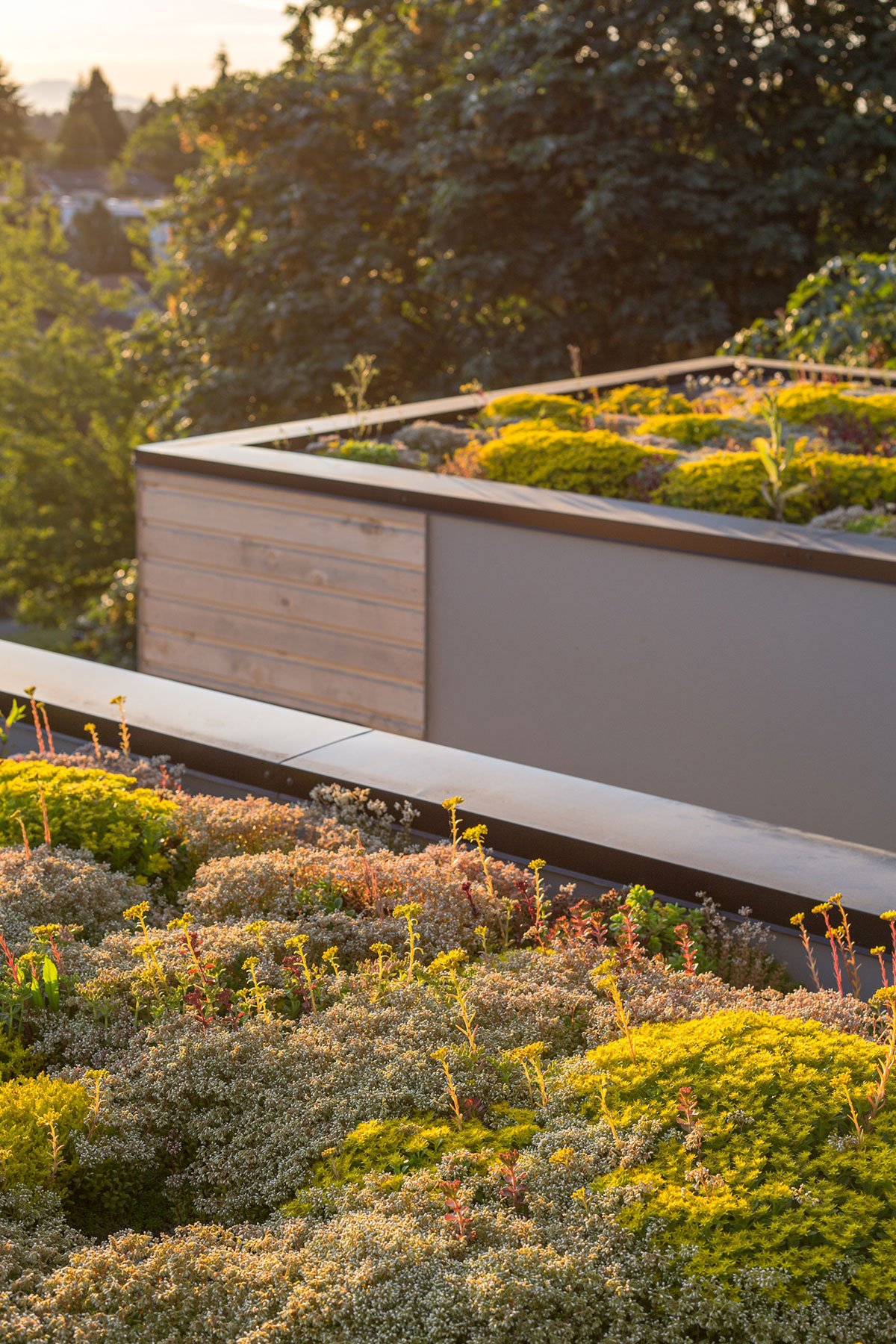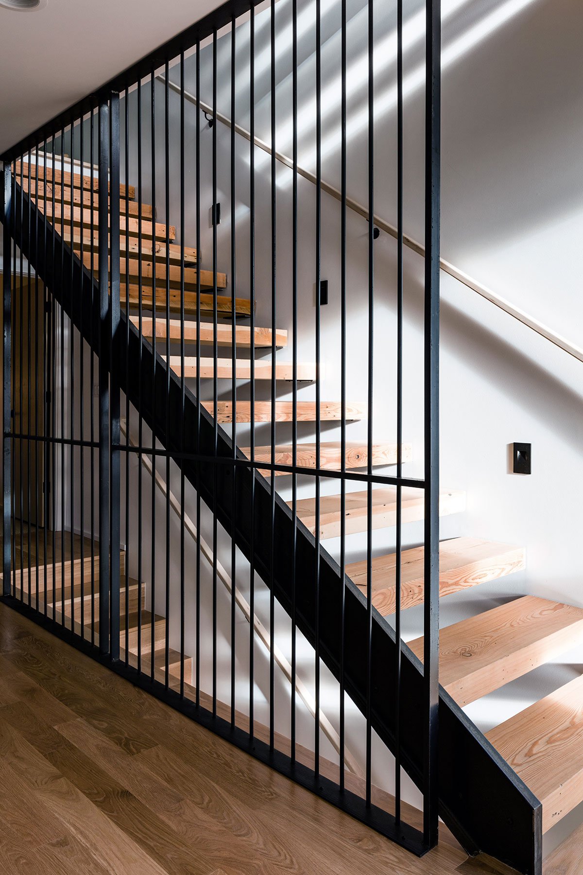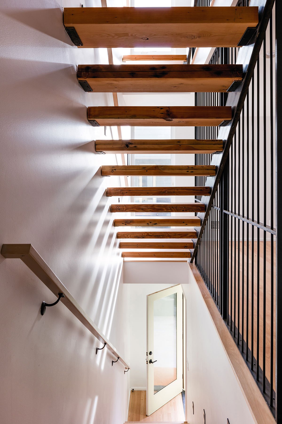 Green roofs, terraces, and porches create: ‘buffer zones’ that filter between privacy and openness.  “Landscape is the great mediator,” says Wittman.  “It allows for subtle gradations of public and private, that allow the residents to choose when to be seen and when to be private.” The floating stairs are made of reclaimed fir 3×12 beams from the deconstructed historic Inland Foods Warehouse in Lewiston, Idaho.