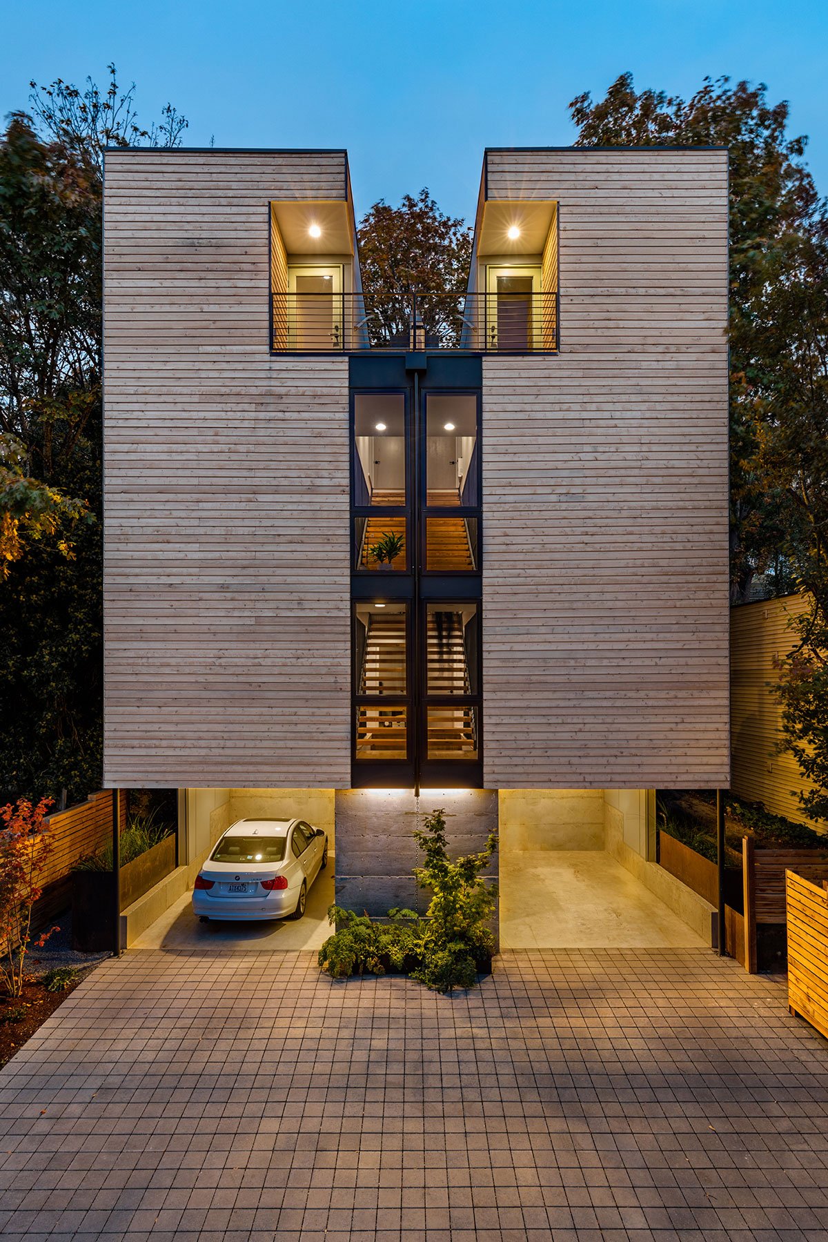 Site challenge of building on steep slope: Using design to maneuver complicated development restrictions, Wittman Estes built 3 dwellings on a 5,040 square foot site that was designated an environmentally critical area of steep slope. This required creativity to overcome Seattle’s onerous permitting restrictions and avoid costly engineering and geotechnical obstacles. By researching Seattle archival records, the architects determined the slope was artificially created by the construction of 8th avenue, which opened up an exemption that allowed the duplex to be built on the steep slope.