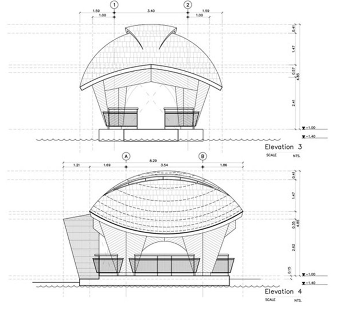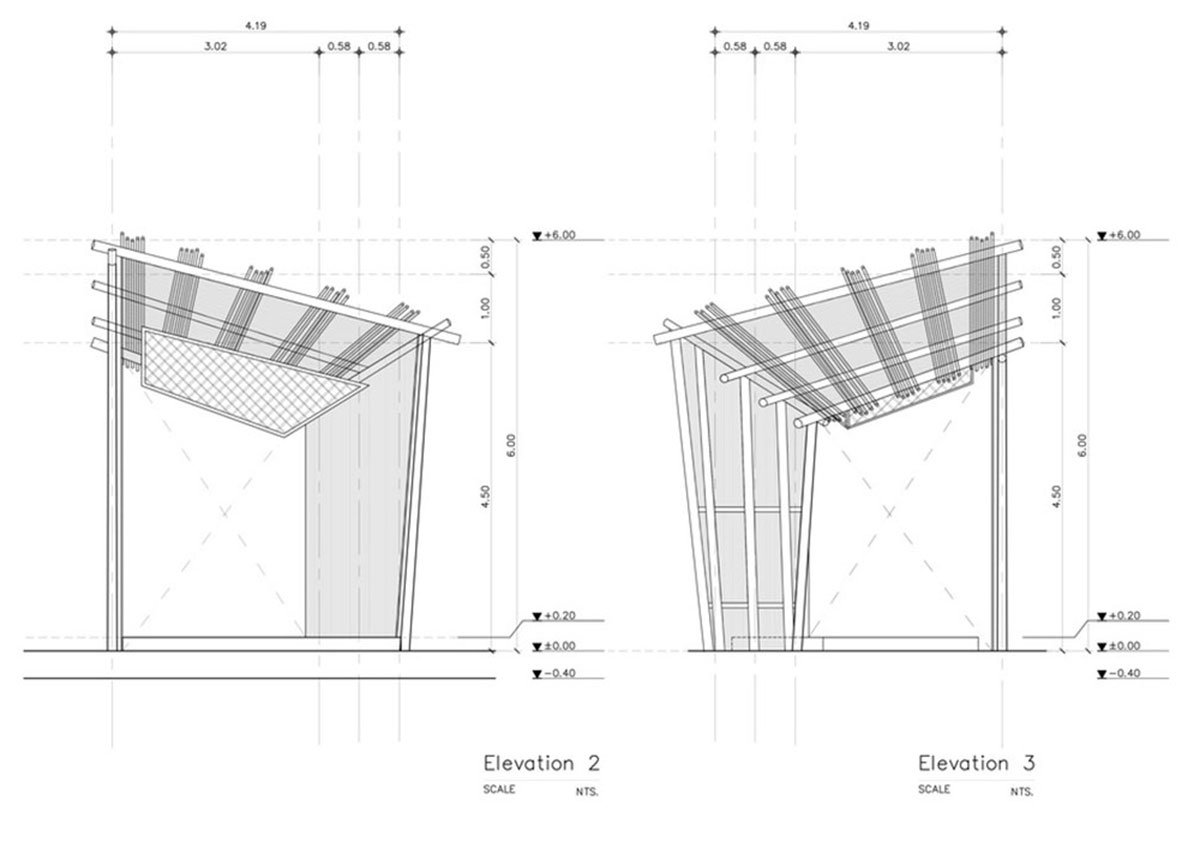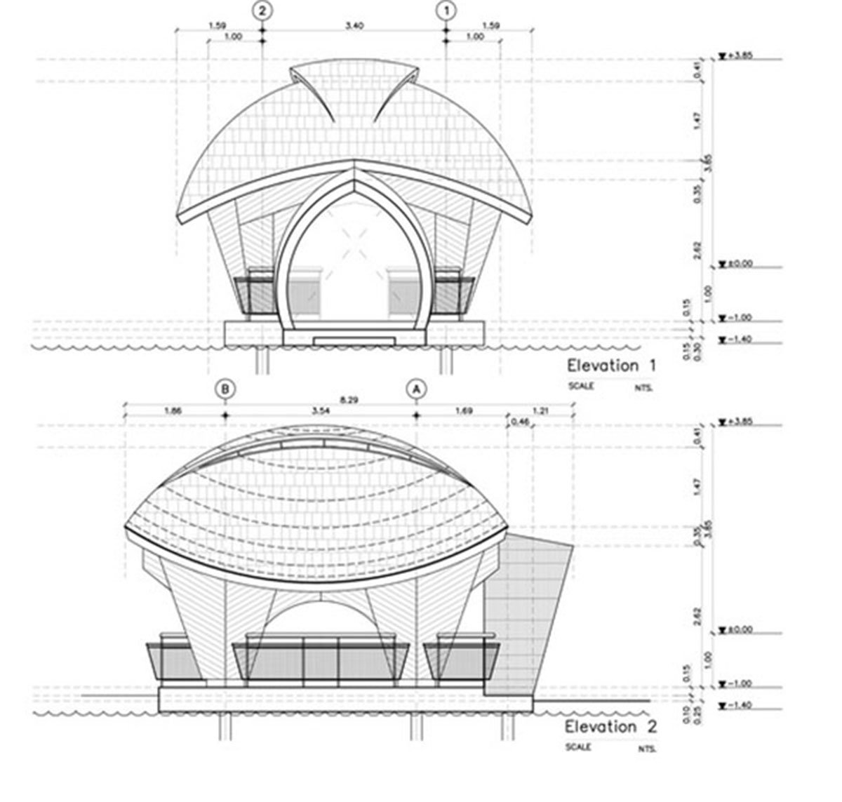 Material selections are based on simple criteria which is harmonized with nature. Shingle roof selected as major roof material. This is because its surface look like gravel and stone chips. Shingle roof also has its ability to create turtle’s shell-like surface. Local bamboo selected as another main roof materials as well as wall surface. The criteria of selection are based on its bending ability. Moreover, bamboo construction can be built easily by using local artisan’s knowledge and heavy machine are not required to build bamboo structure.
