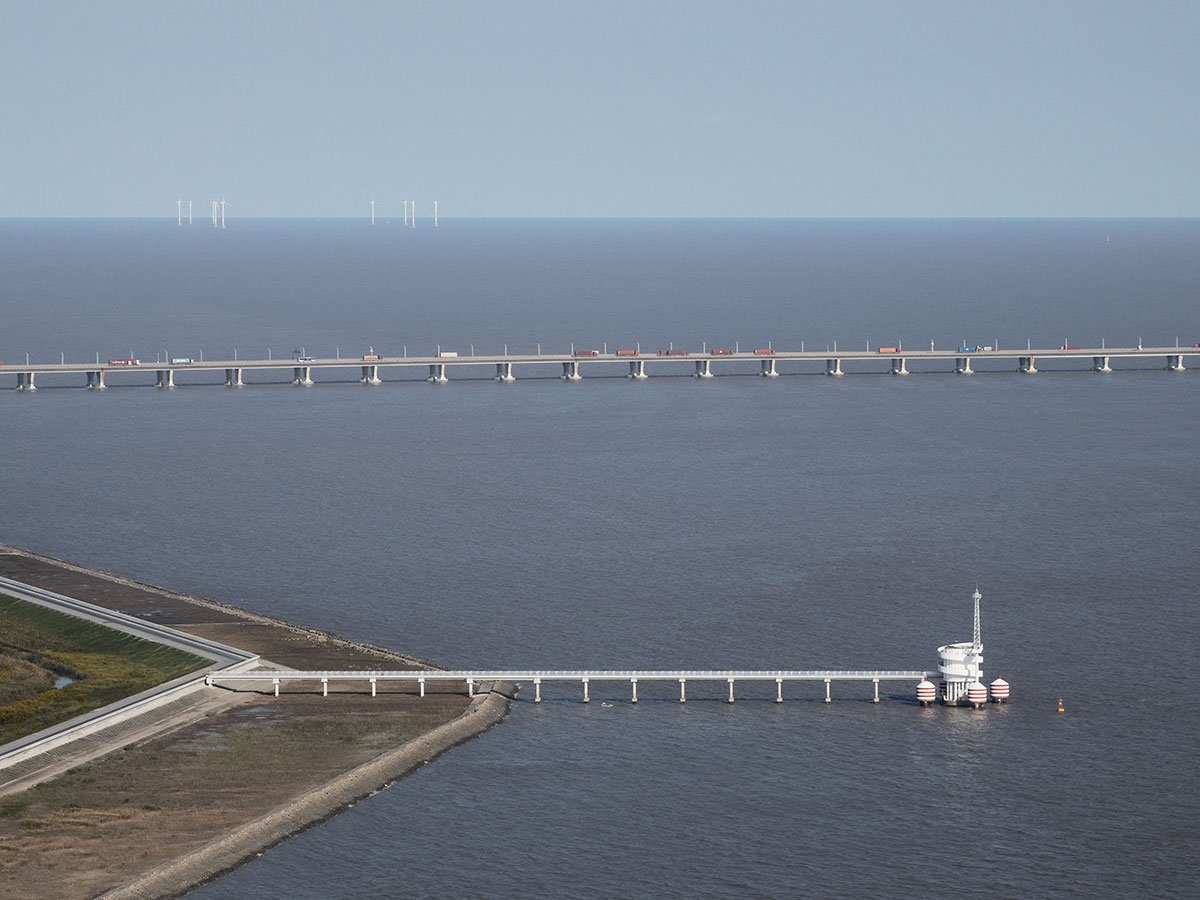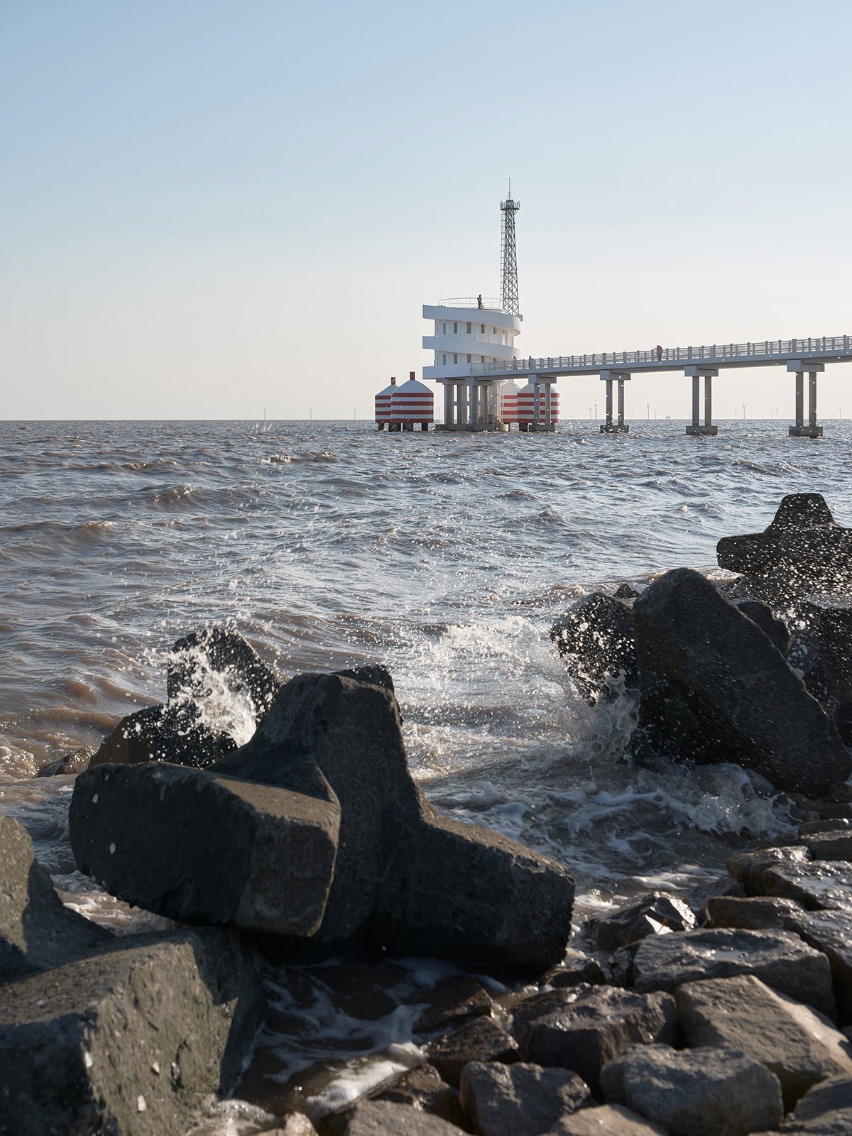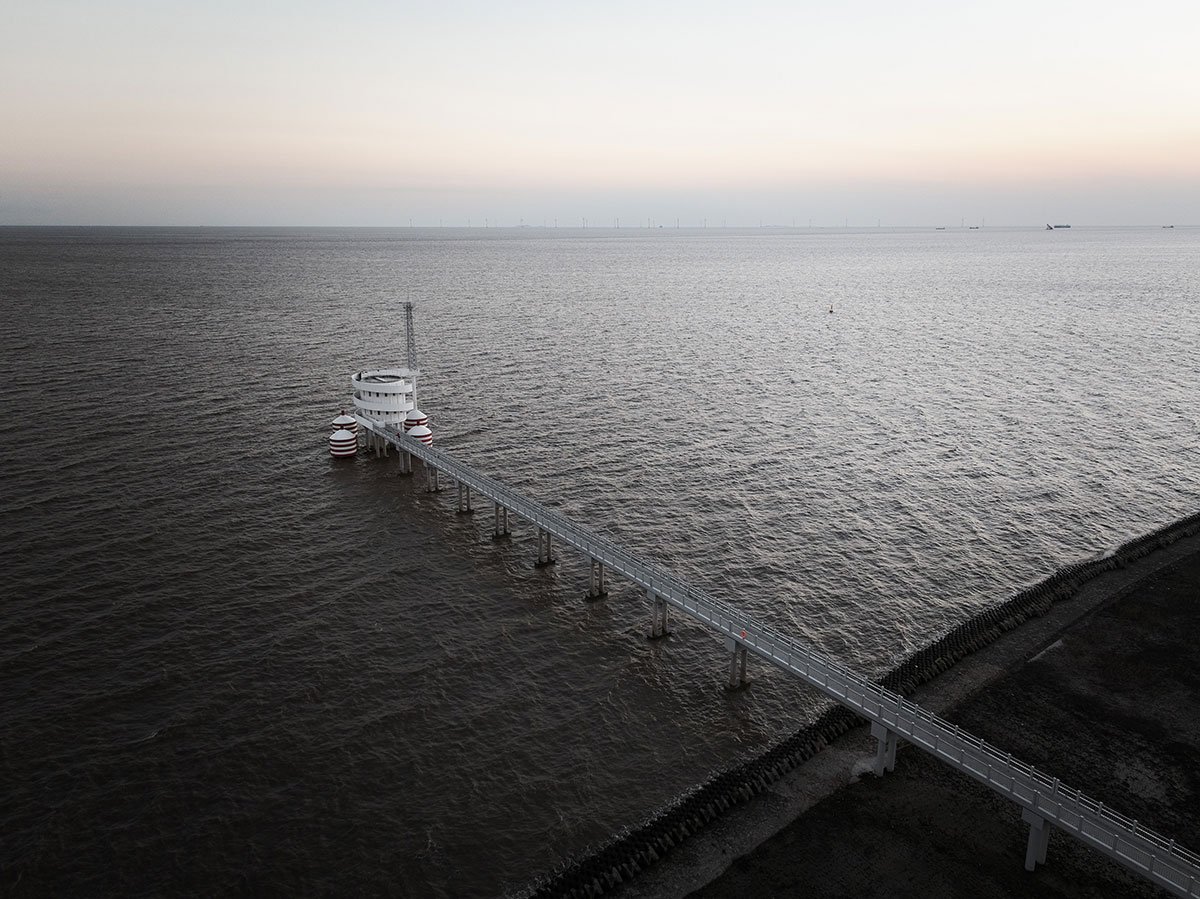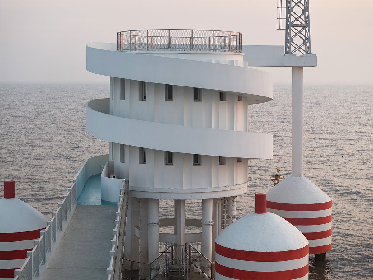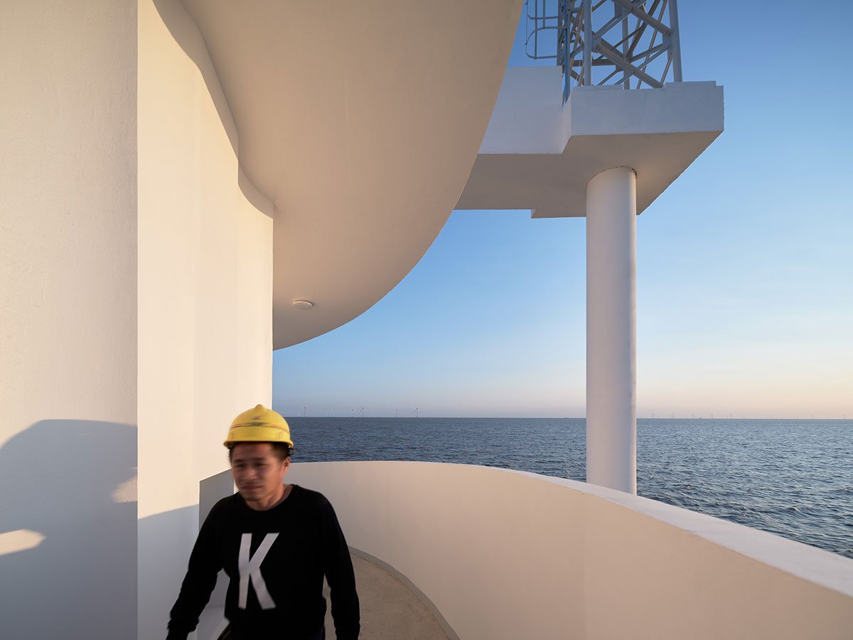 An eight-meter diameter circular plan is adopted with vertical circulation wrapping on its periphery. A two-meters wide slope spirals up from ground level all along until reaching the roof level, resembling a winding ribbon. One end connects to land, and the other leads to the climate tower standing on an anti-collision-pile. The station enjoys an open plan with no interruption and easy access onto the rooftop working platform.