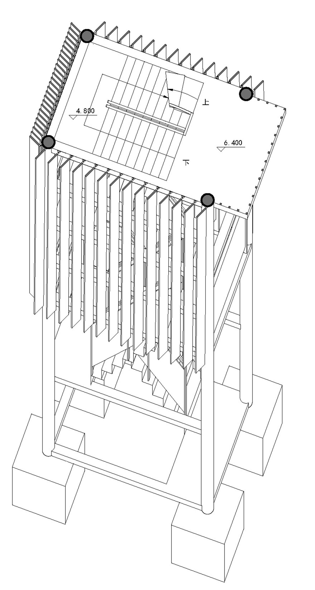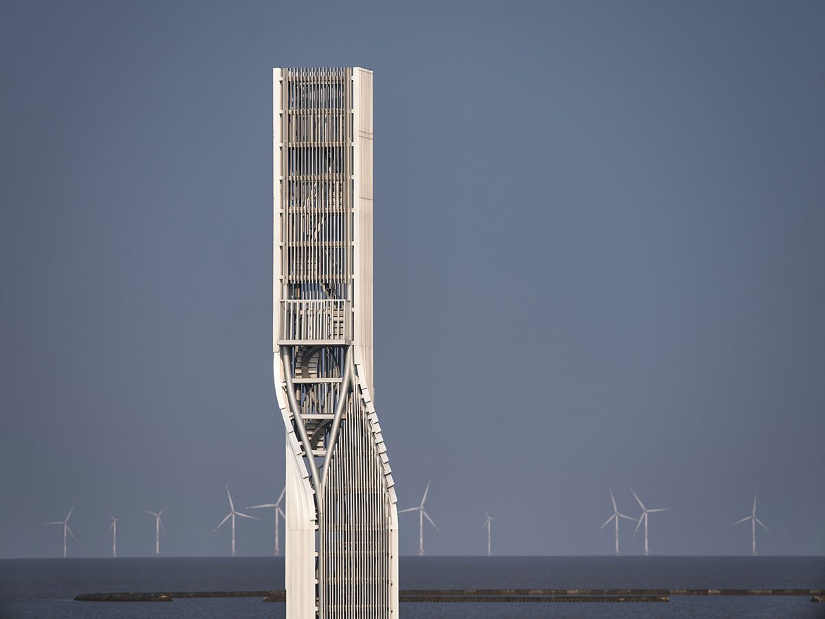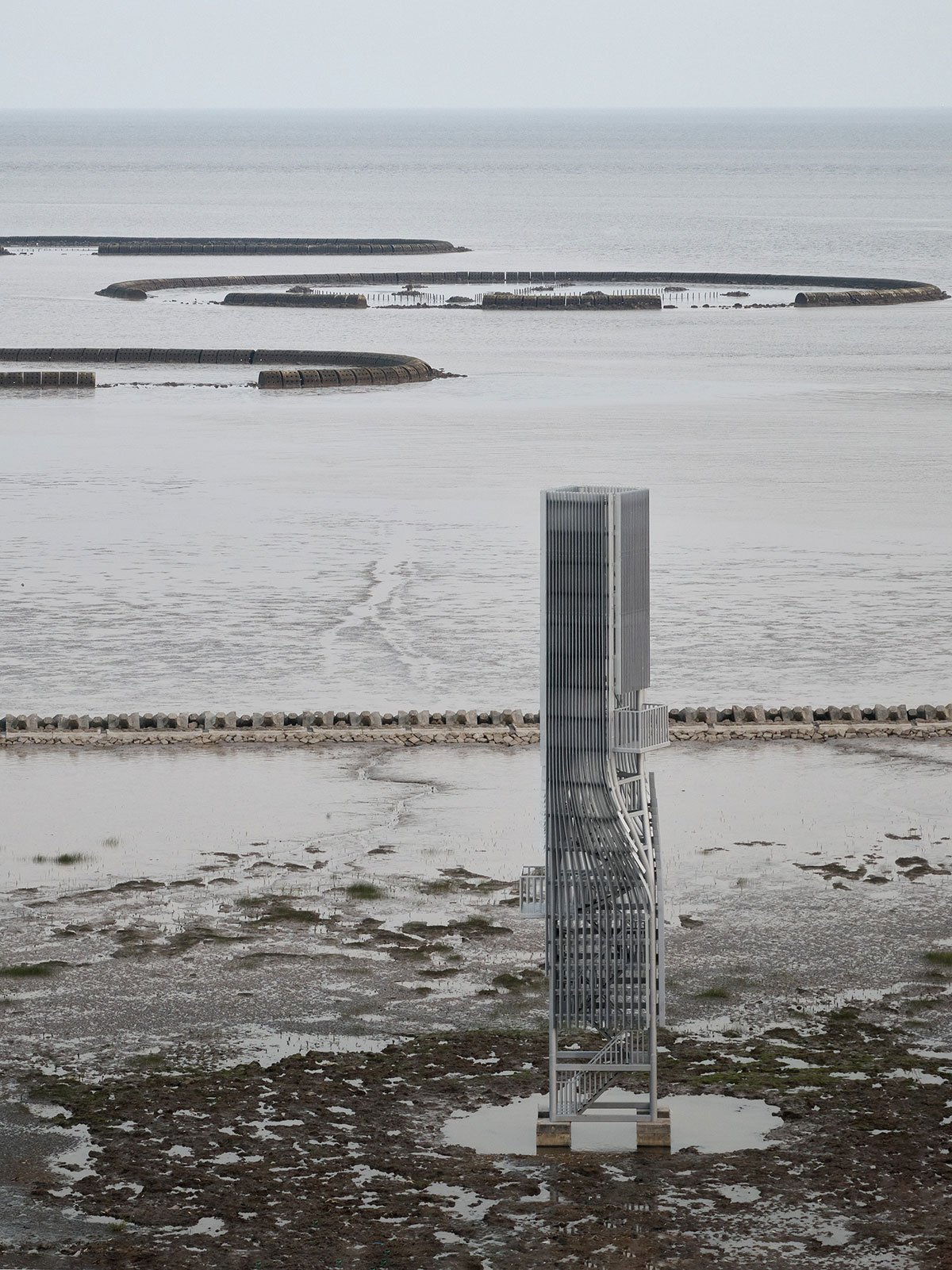 The main steel structure is enveloped by vertical metal louvers on all sides which create an ambiguous sense of scale when viewed from the vast endless coast. Only upon approaching can the internal steel staircase be glimpsed through the louver gaps. As a 3m x 2m rectangular footprint, the plan reduces to 2m x 2m after being twisted by 25 degrees. 4-meter-height LED light strips are embedded on the top louvers, which are used for sea level alerts. Carbon flux measurement devices are installed on the two platforms below – six meters and twelve meters in height respectively.