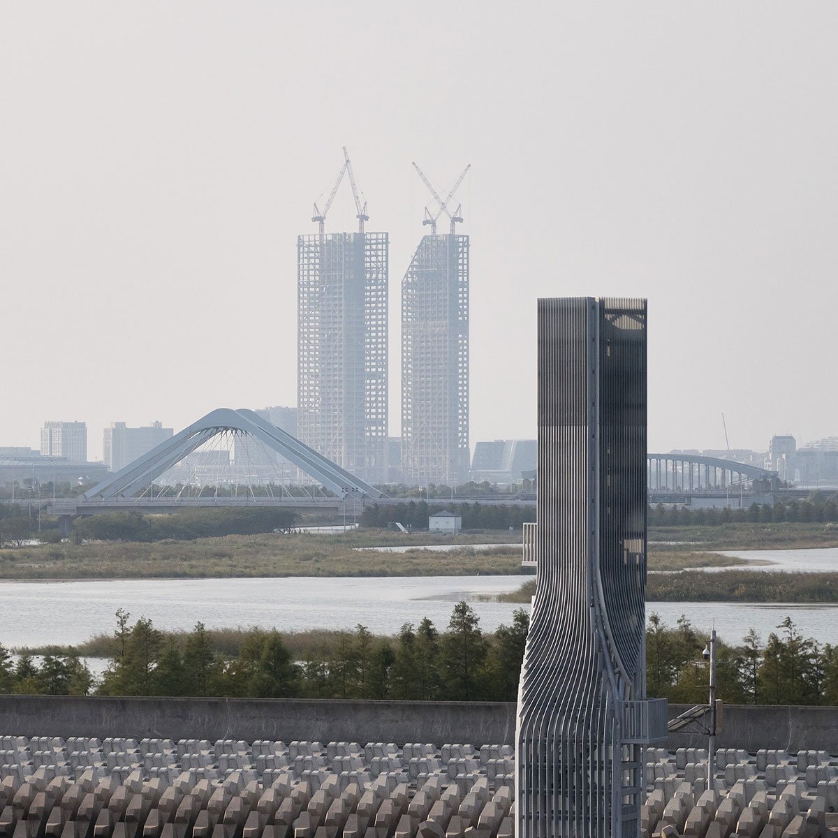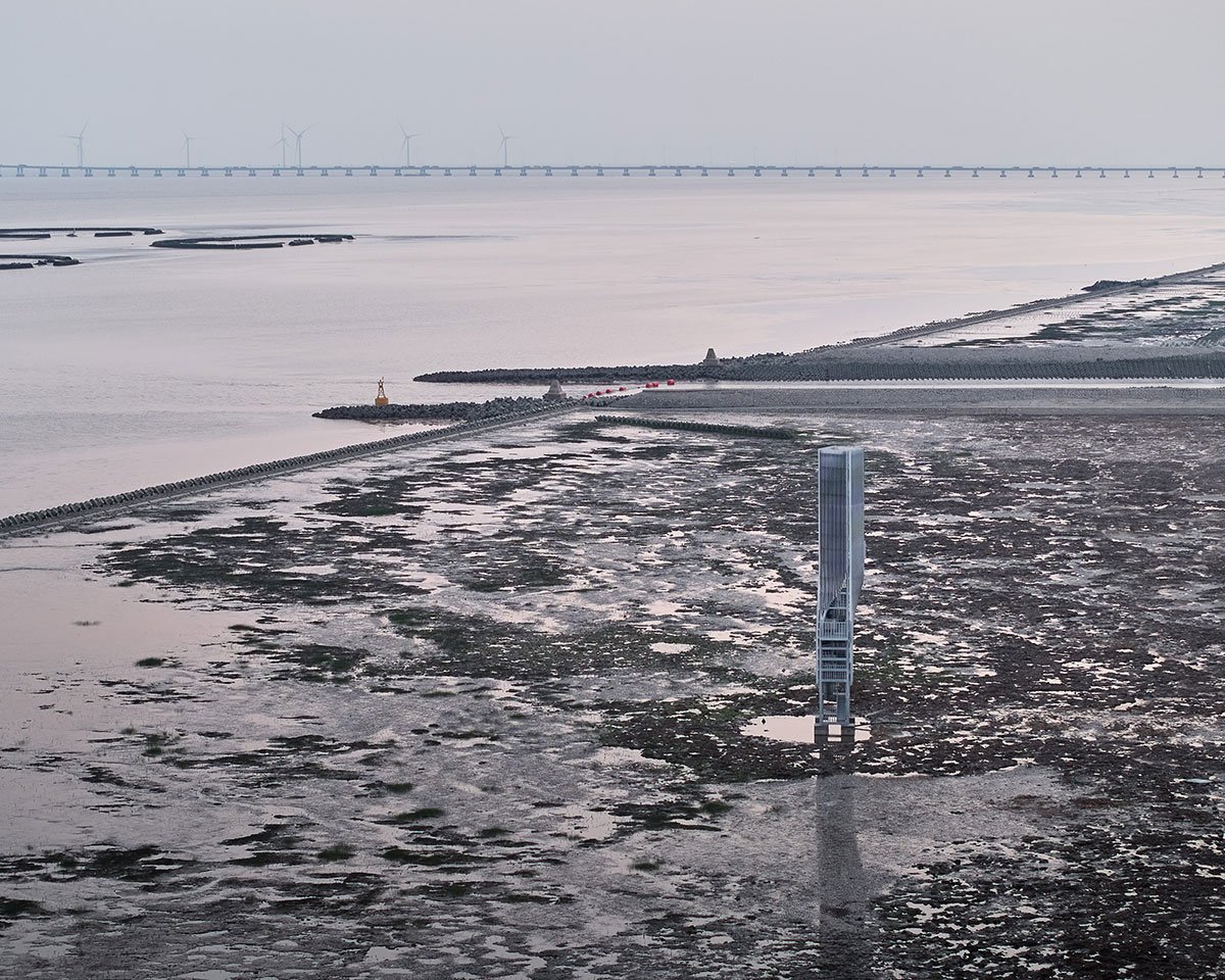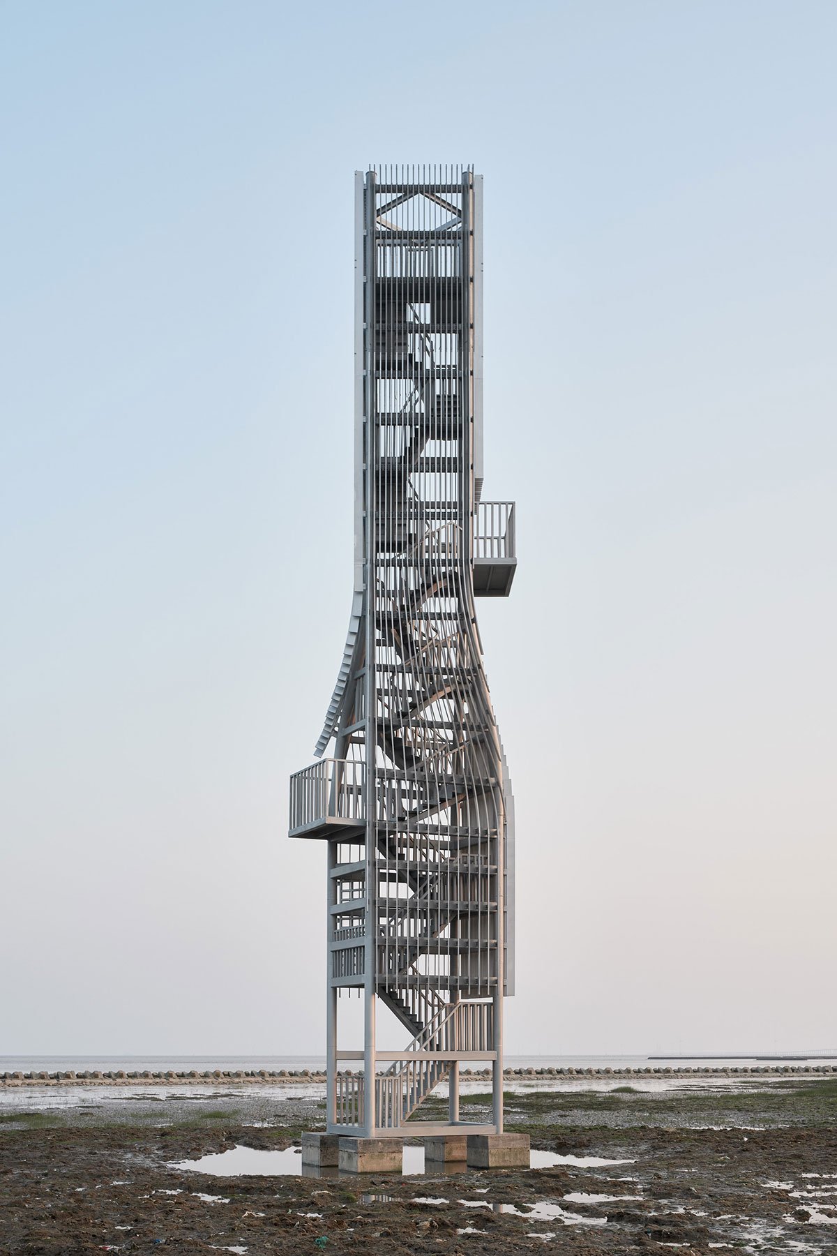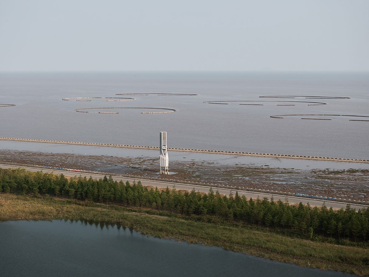 [Text as submitted by architect] Twisting Tower and Spiral Station are two structures of Shanghai Lingang Ecological Restoration Project, located 10 kilometers apart along the coastline. They demonstrate the possibility of infrastructure as landmarks that not only serve for ecological purposes, but also attract public attention to environmental issues through visual expression of technical elements. From an architectural perspective, they also attempt to explore economic and intriguing solutions by taking minimal formal manipulation.