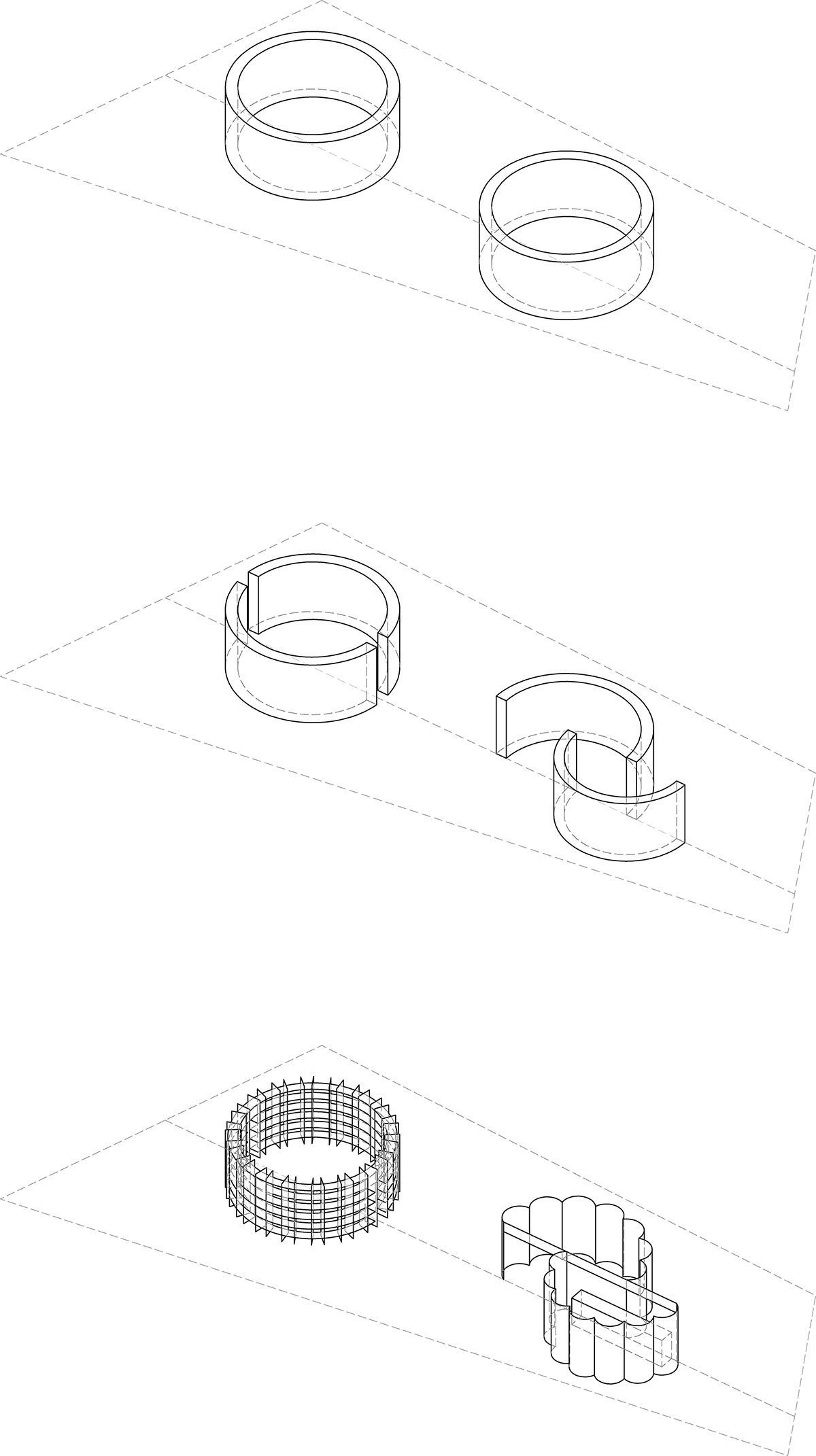 In line with the trapezoid plane: The two “paper houses” are set on a relatively large platform on the second floor of the venue, and the site is in a trapezoid shape on the plane, narrower at one end and wider on the other side. Corrugated paper has been used to construct the two “houses”. Compared to other building materials, it is more brittle and unstable when subjected to stress. To realize a high level of stability, a circular plane becomes the best choice for the two “houses”.