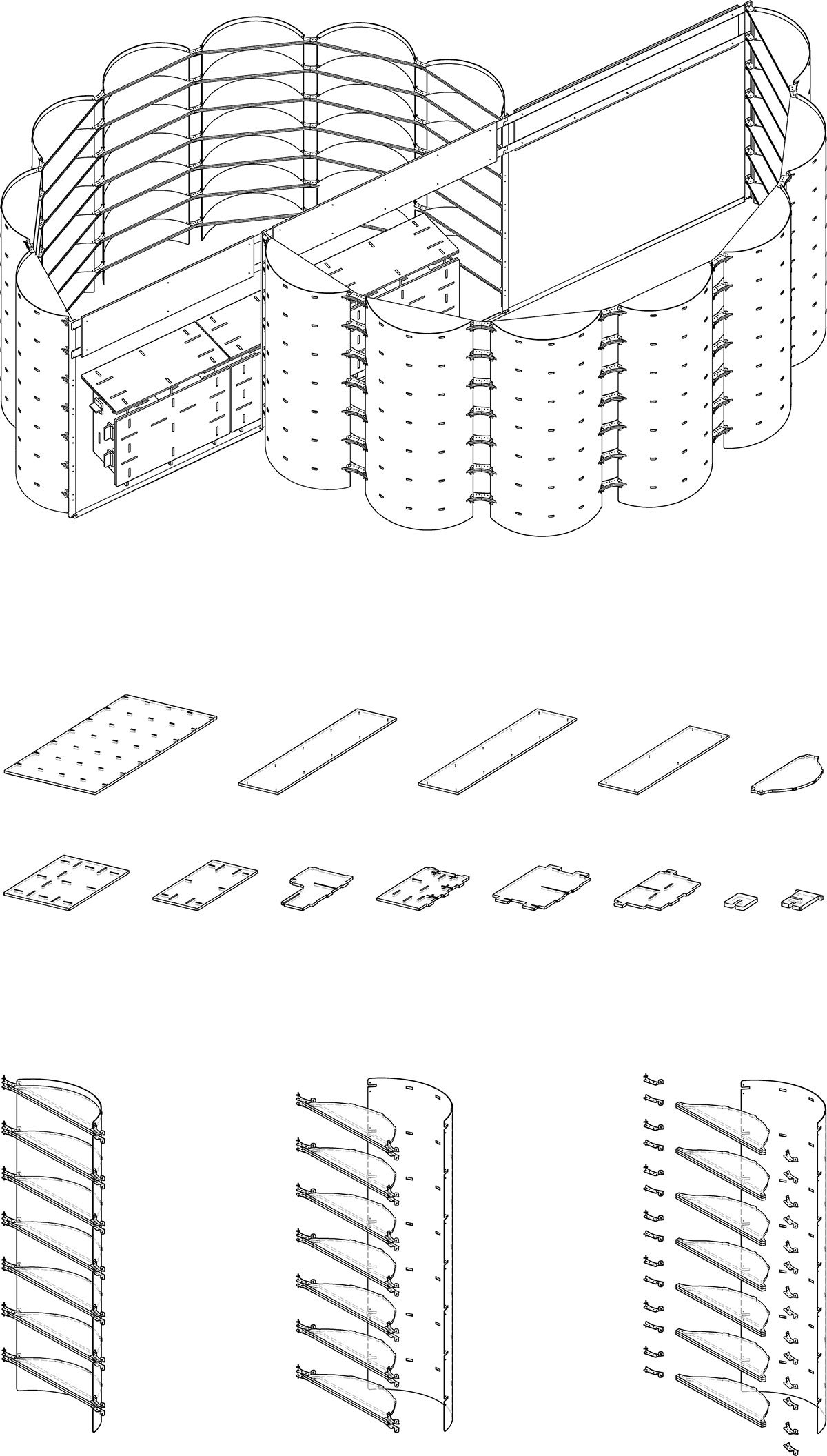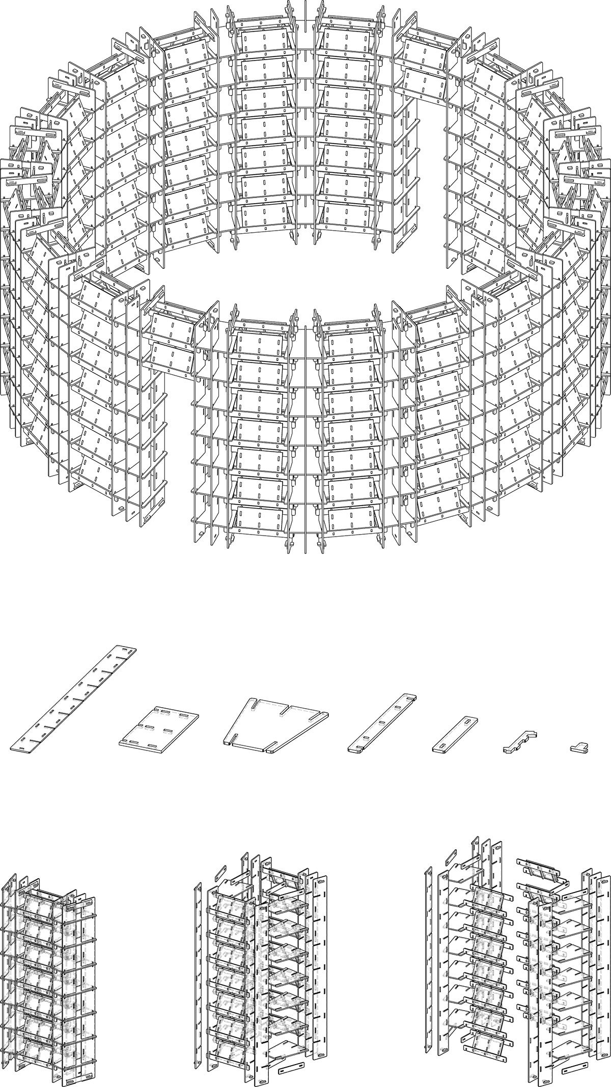 The corrugated cardboard used is a paper-based material with a relatively high strength. Based on several rounds of tests in the factory and the previous design practices of Cardboard-formed Exhibition Space 1.0 and 2.0, it has been confirmed that this material can be repeatedly assembled, disassembled and reassembled many times, thus realizing long-term and repeated reuse.