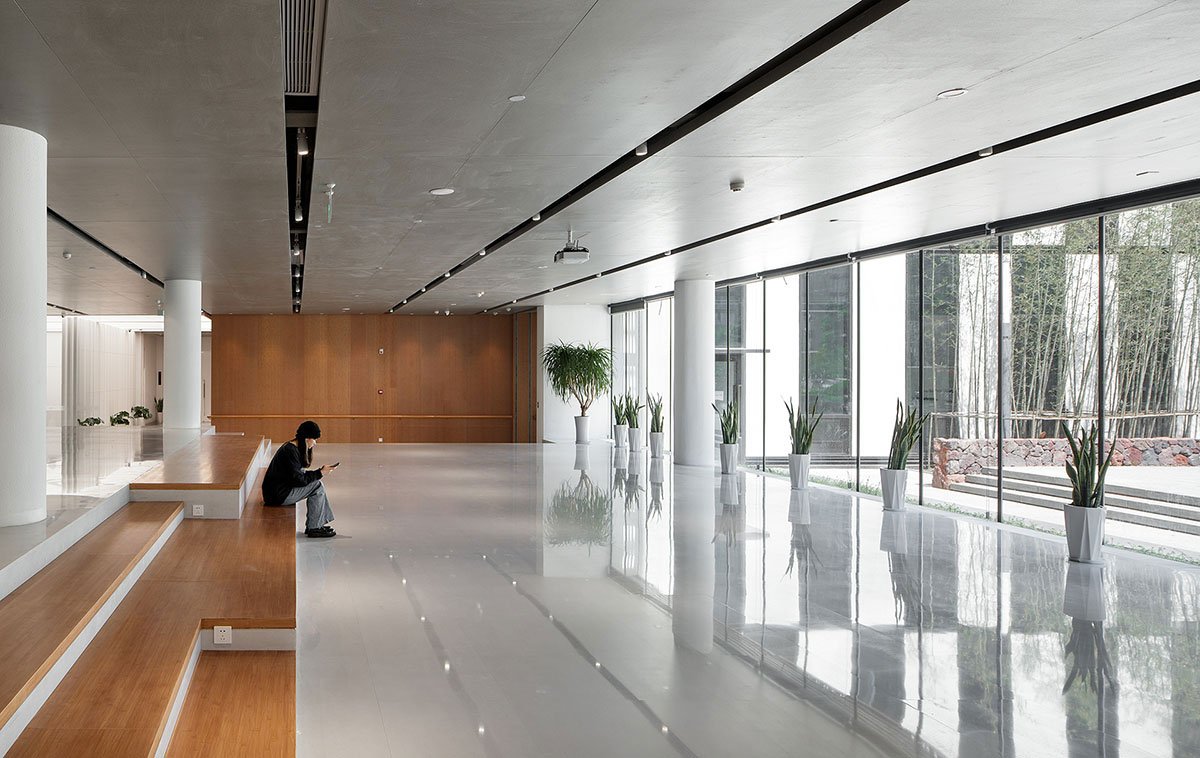 Another outstanding feature of the project is the fusion of architecture and landscape, and how they co-exist in the same built environment. The building and the landscape are connected in composition. Waterscape is set at the main entrance on the west side, to show a sense of rituality. In addition, a rest platform formed by volcanic stones and prefabricated concrete boards sits on the east side. Other landscape elements such as bamboo grove and flower pathway greatly enrich the spatial layering of the roads and secondary entrance. Complemented by the indoor cafe and lobby lounge, a dialogue between indoor and outdoor resting spaces is created.