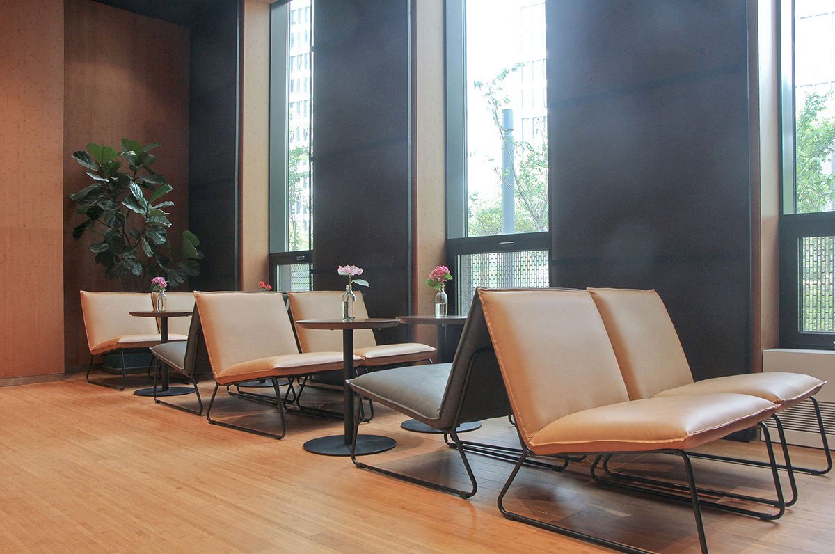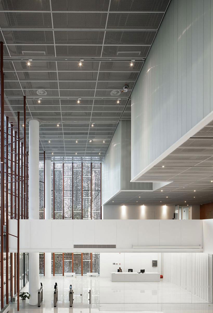 The central cubic volume of building B1 functions as a full-height entrance lobby. It is not only the intersection of pedestrian circulations, but also an iconic visual highlight of the whole building. Serving as a resting area for the staff, a reception area and a place for hosting relevant exhibitions and forums from time to time, this multifunctional space is the most important part of the whole design.