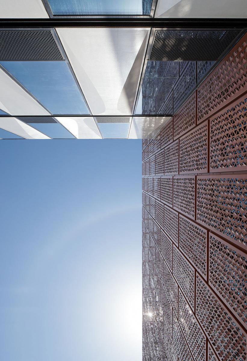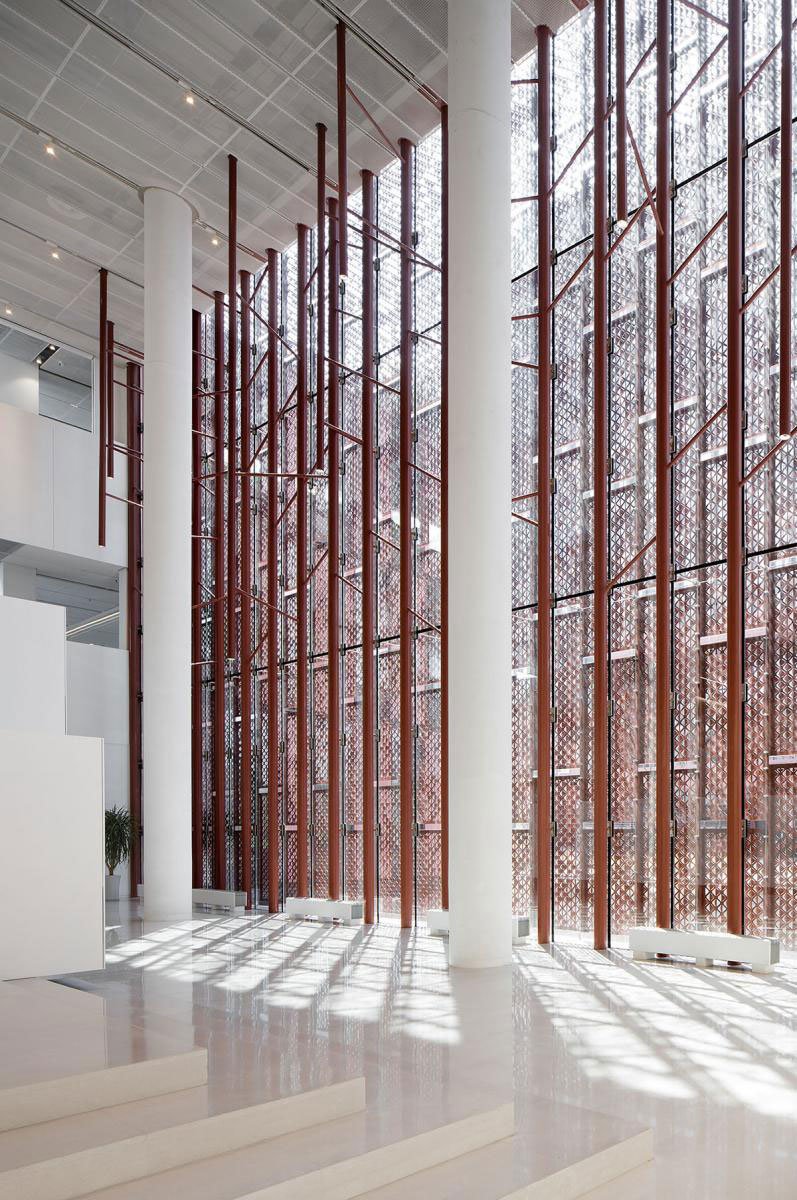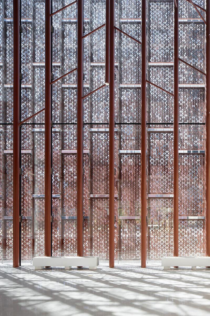 Moreover, construction robots were leveraged to ensure the varied angles of the aluminum panels’ perforations, so as to control the effect of the filtered daylight and create a poetic view of “A towering bamboo forest filled with mottled light and shadows”. At dusk, it provides people with a poetic experience of “watching the sunset in the shadows of bamboo”, adding varying visual effects and a tranquil ambience to the space.