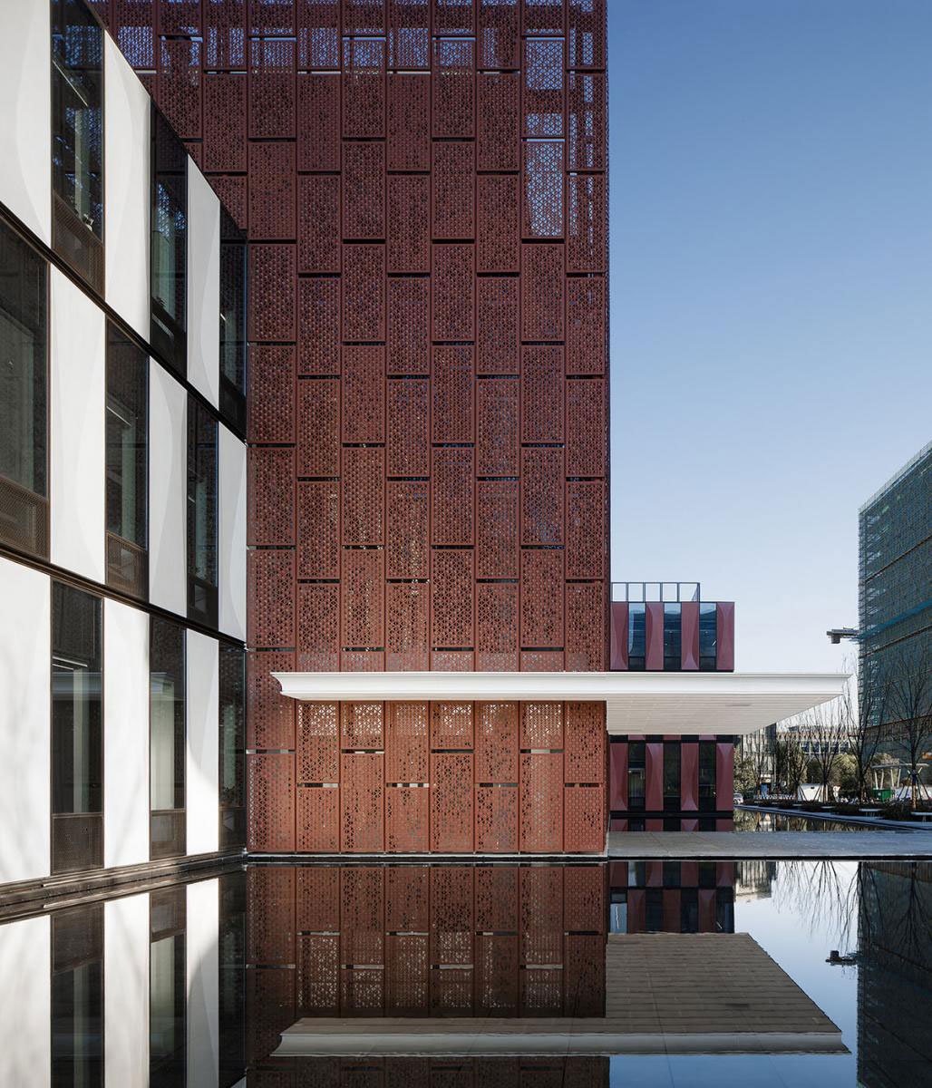 The building B1 is formed by three interpenetrating cubes, among which the north and south volumes are large-width offices, while the central volume is a full-height atrium. The facades of both office volumes adopt similar modular UPHC cladding panels. Those panels are in two different colors and are either concave or convex on the two sides, hence forming 4 different modular units. The various combinations of those modular panels produce slightly curved shadows under the sunlight, and also generate a rational yet rhythmic facade image. Through the reflection of the entrance waterscape, the whole building is not bound to a fixed industrial park setting.