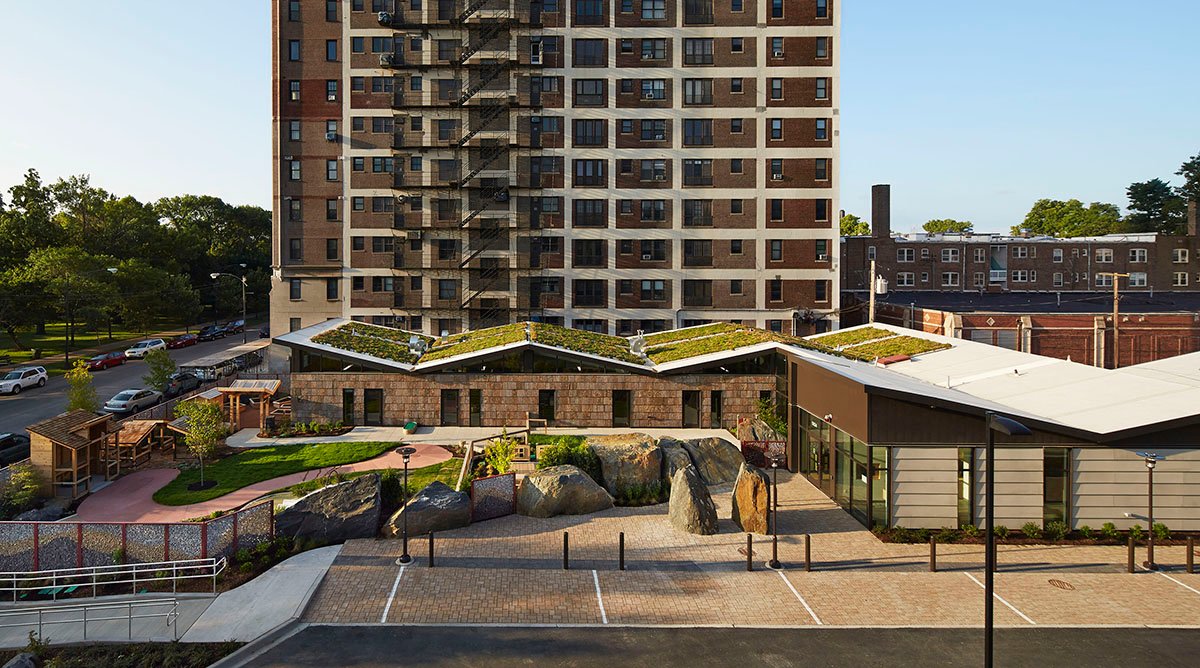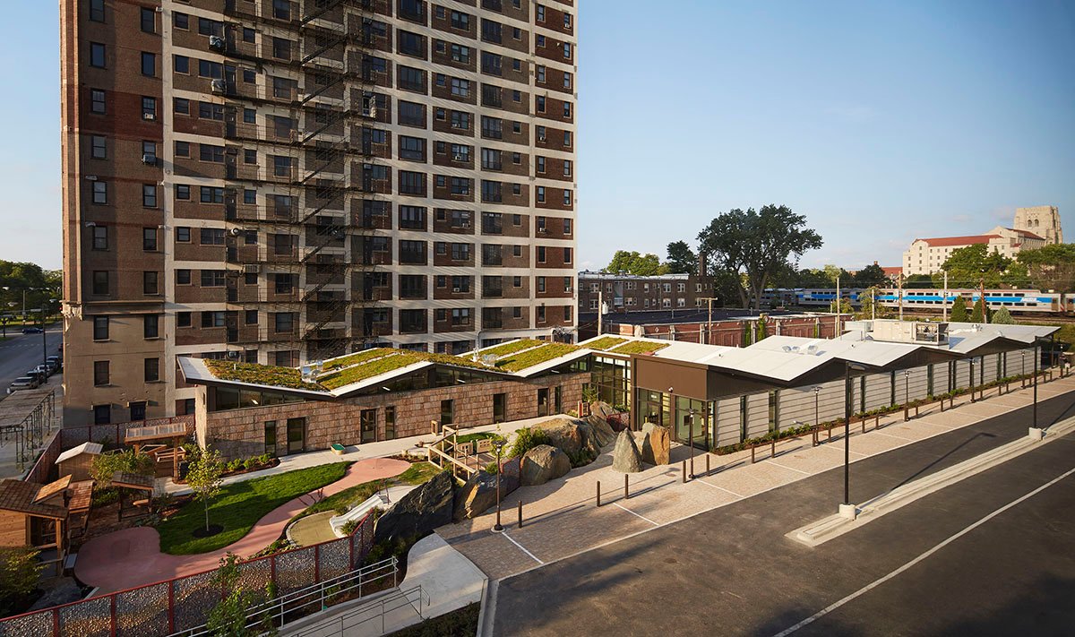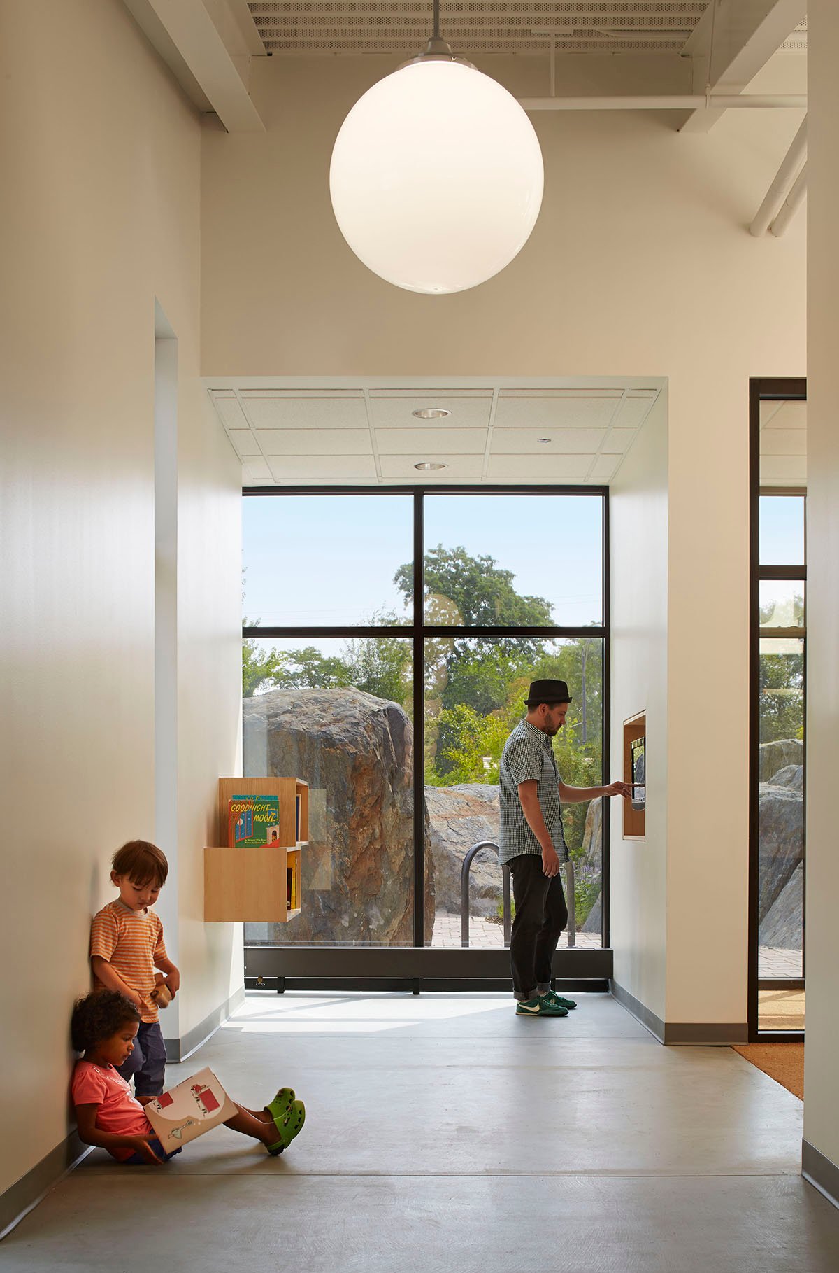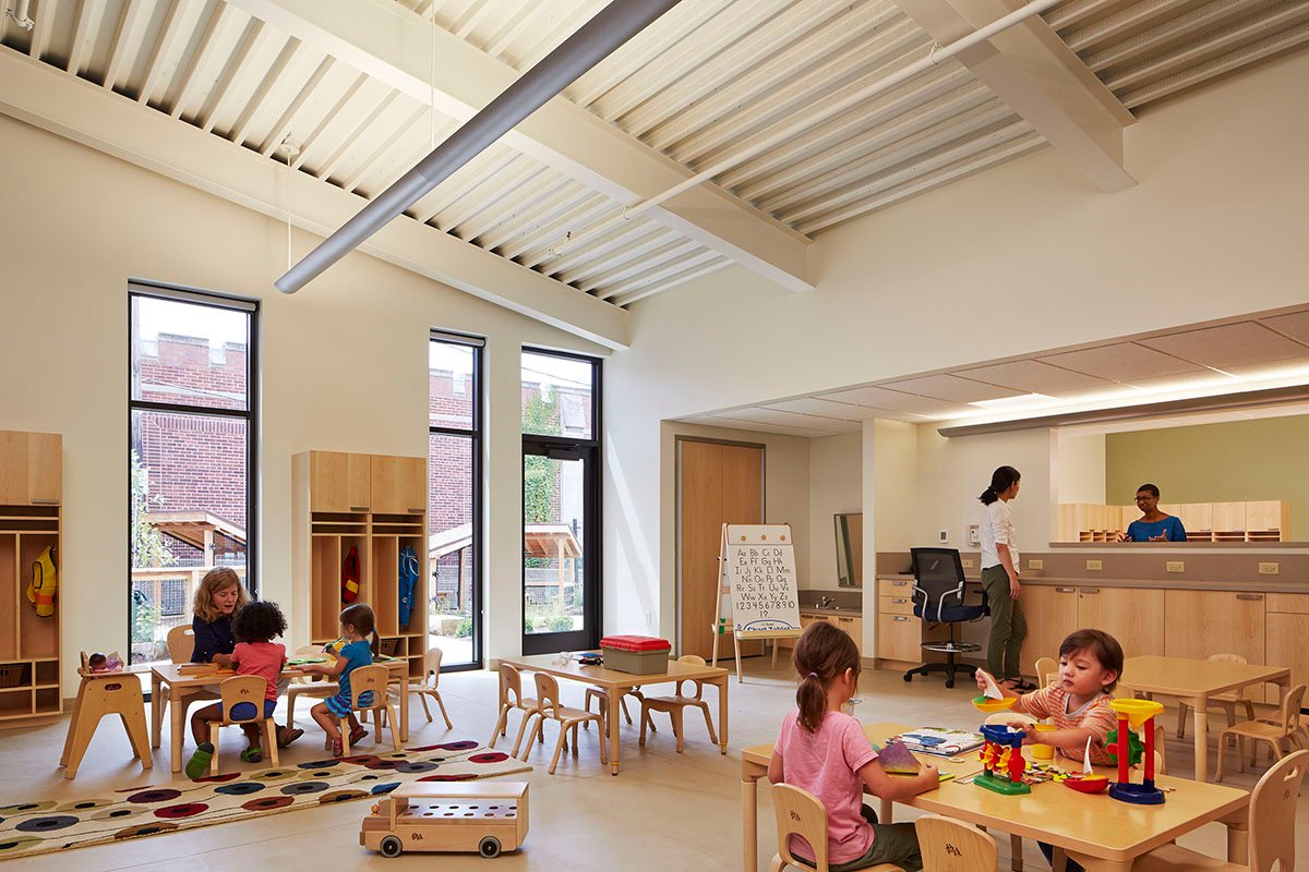 [Text as submitted by architect] Inspired by an adjacent historic landscape, the facility integrates the natural environment with its architecture and child-centered curriculum. The building, with a z-shaped footprint, responds to the narrow infi ll site, optimizing limited sun exposure and leveraging visual connections between the interior and exterior.