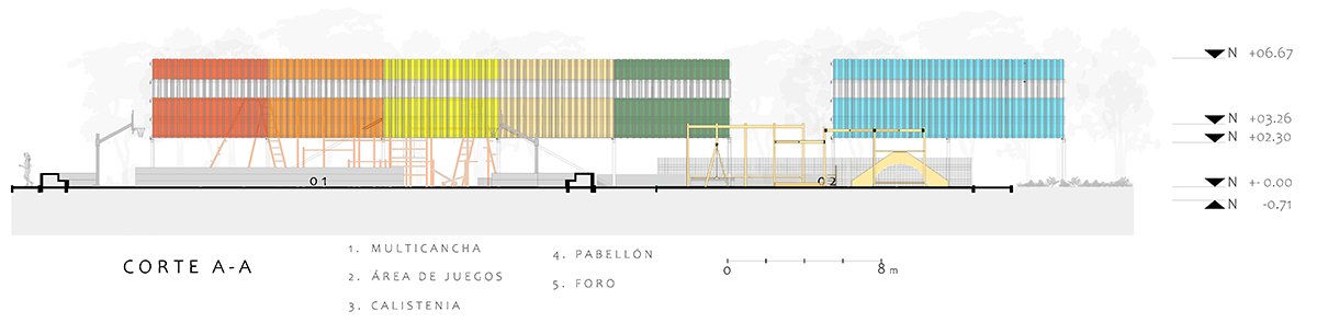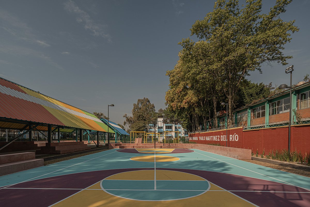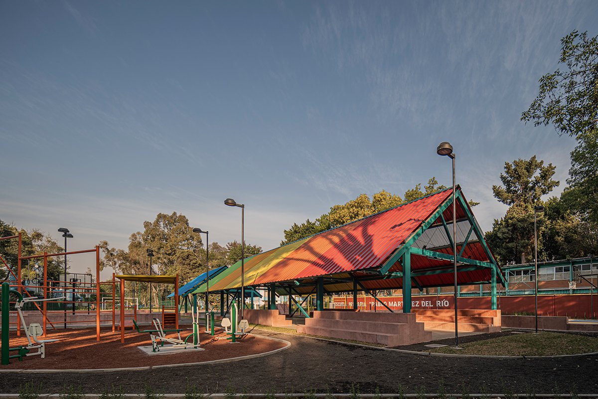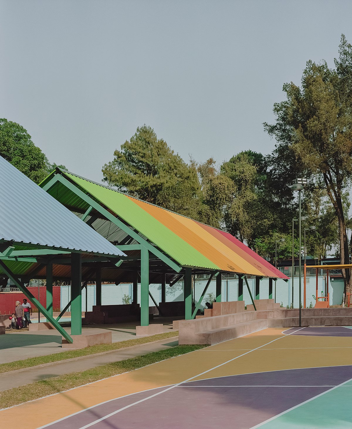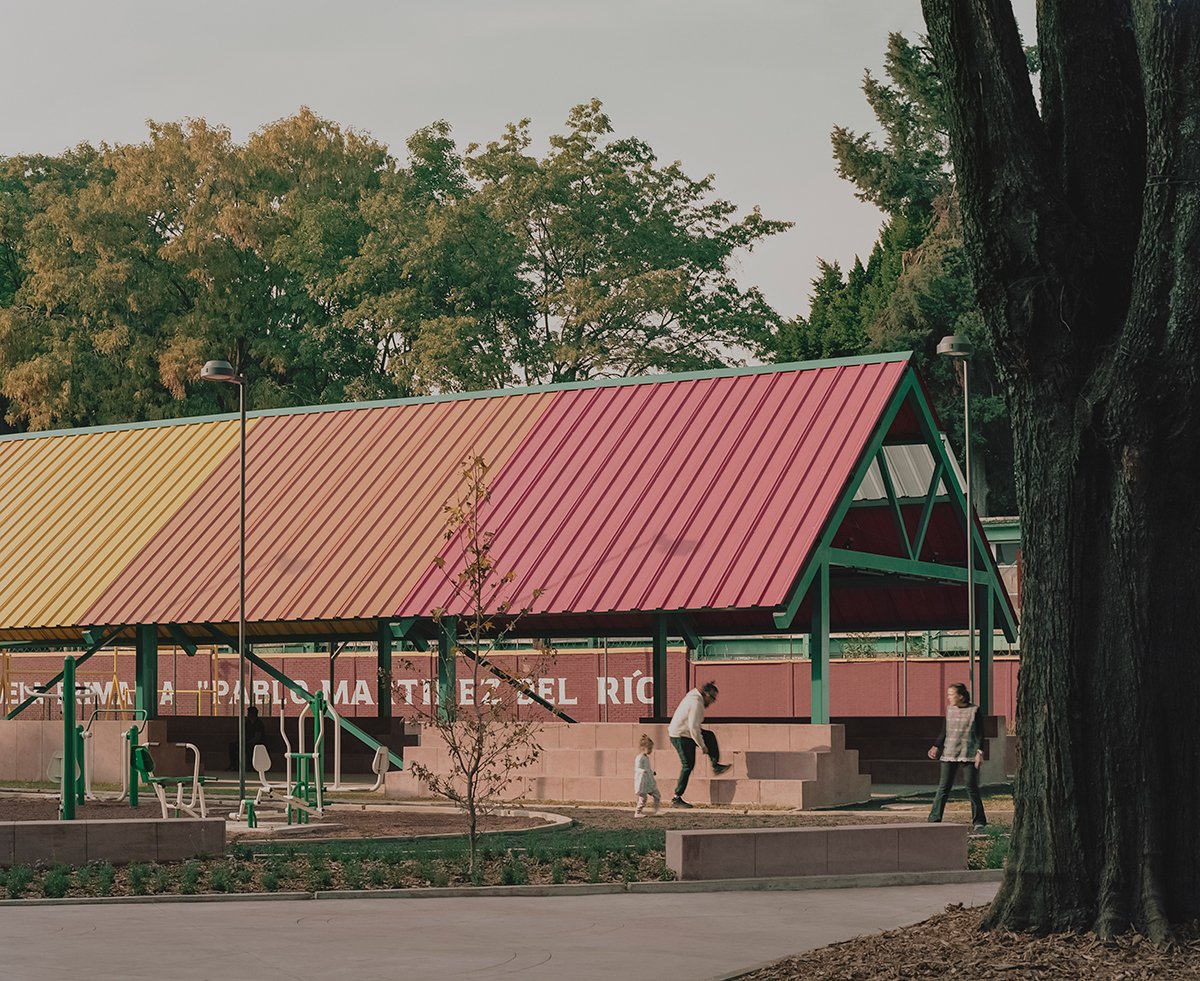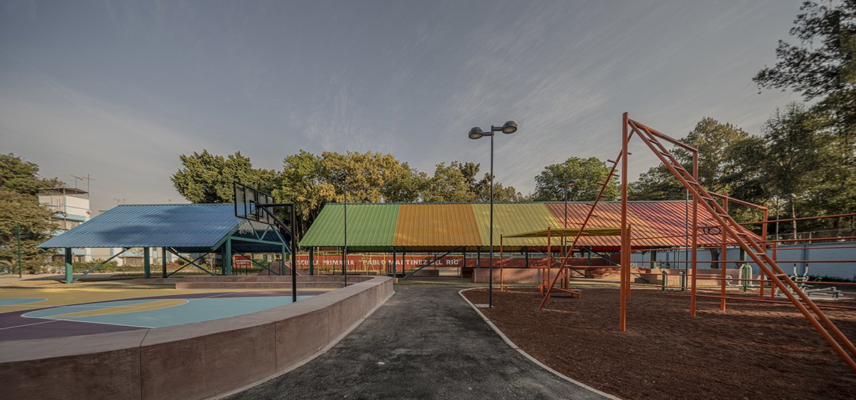 Excerpt: UH INFONAVIT CTM Culhuacán by AMASA Estudio features the transformation of a deteriorated plaza into a new social hub, featuring a colorful gabled structure that adds scale, spatial definition, and character. Organized around this central spine are sports courts, a playground, and gathering spaces, integrated with landscape improvements and universal accessibility to restore the social value of public space and foster community care.